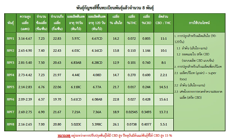 “ปัจจุบัน สวพส. และมูลนิธิโครงการหลวง อยู่ระหว่างการปรับปรุงพันธุ์ให้กัญชงที่มีปริมาณ CBD สูง และ THC ต่ำกว่า 1.0% ซึ่งในปัจจุบัน พบสายพันธุ์ที่มีปริมาณ CBD เพิ่มสูงขึ้นในช่วง 5-15 % โดยอยู่ระหว่างขั้นตอนการปลูกทดสอบและปรับปรุงพันธุ์ โดยมีเป้าหมายให้ได้พันธุ์ที่มีปริมาณ CBD 20% ภายในปี พ.ศ. 2570 และปัจจุบัน มีพันธุ์กัญชงที่ขึ้นทะเบียนพันธุ์แล้วจำนวน 8 พันธุ์ ได้แก่ RPF1 , RPF2 , RPF3 , RPF4 , RPF5 , RPF6 , RPF7 และ RPF8 ซึ่งขณะนี้อยู่ระหว่างการสำรวจปริมาณและคุณภาพของเมล็ด โดยคาดว่าทาง สวพส. เปิดจำหน่ายเมล็ดกัญชง (Hemp) ครั้งที่ 2 ประมาณปลายปี พ.ศ. 2564 นี้ โดยสามารถติดตามข่าวสารต่าง ๆ ของ สถาบันฯ ผ่านเว็บไซต์ https://www.hrdi.or.th/ หรือ Facebook Fan page : สถาบันวิจัยและพัฒนาพื้นที่สูง(องค์การมหาชน)” ดร.สริตา กล่าวทิ้งท้าย