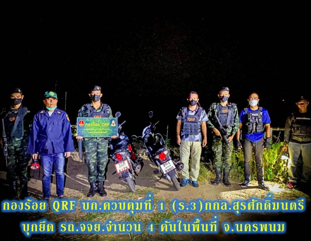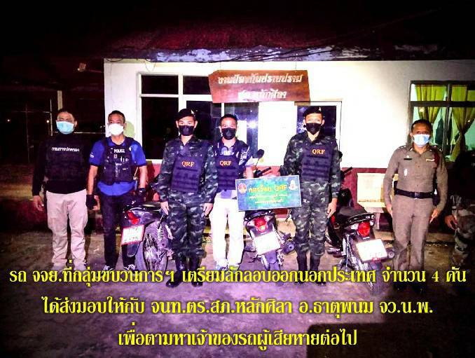 ที่บ้านดงขวาง หมู่ที่ 6 ต.แสนพัน อ.ธาตุพนม จ.นครพนม ผู้สื่อข่าวรายงานจากกองร้อย.QRF ได้รับแจ้งจากสายข่าวว่ามีกลุ่มกระบวนการลักลอบส่งรถข้ามแดนกำลังเตรียมการนำรถจักรยานยนต์ข้ามไปยังฝั่งประเทศเพื่อนบ้าน บริเวณริมฝั่งแม่น้ำโขง บ.ดงขวาง หมู่ 6 ต.แสนพัน อ.ธาตุพนม จ.นครพนม โดยเมื่อ วันที่ 24 ต.ค.64 เวลา 1700-2000 น. ทางด้าน พ.อ.สุคนธรัตน์ ชาวพงษ์ ผบ.กองบังคับการควบคุมที่ 1 กองกำลังสุรศักดิ์มนตรี ได้สั่งการให้ ร.อ.นฤดล อุตม์สีขันธ์ ผู้บังคับกองร้อย QRF. กองร้อย.QRF จึงได้บูรณาการจัดกำลังพล 1 ชป. ร่วมกับ ชปข.ที่ 6/ฝ่ายปกครอง อ.ธาตุพนม/กำนัน/ผู้ใหญ่บ้านเข้าตรวจสอบพิสูจน์ทราบบริเวณพื้นที่ดังกล่าว ครั้นเมื่อไปถึงบริเวณพื้นที่ดังกล่าว พบรถจักรยานยนต์ จำนวน 4 คัน จอดอยู่ริมฝั่งแม่น้ำโขง ทาง เจ้าหน้าที่จึงเข้าตรวจสอบ รถจักรยานยนต์ต้องสงสัย ดังนี้