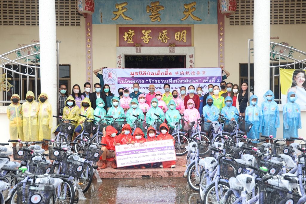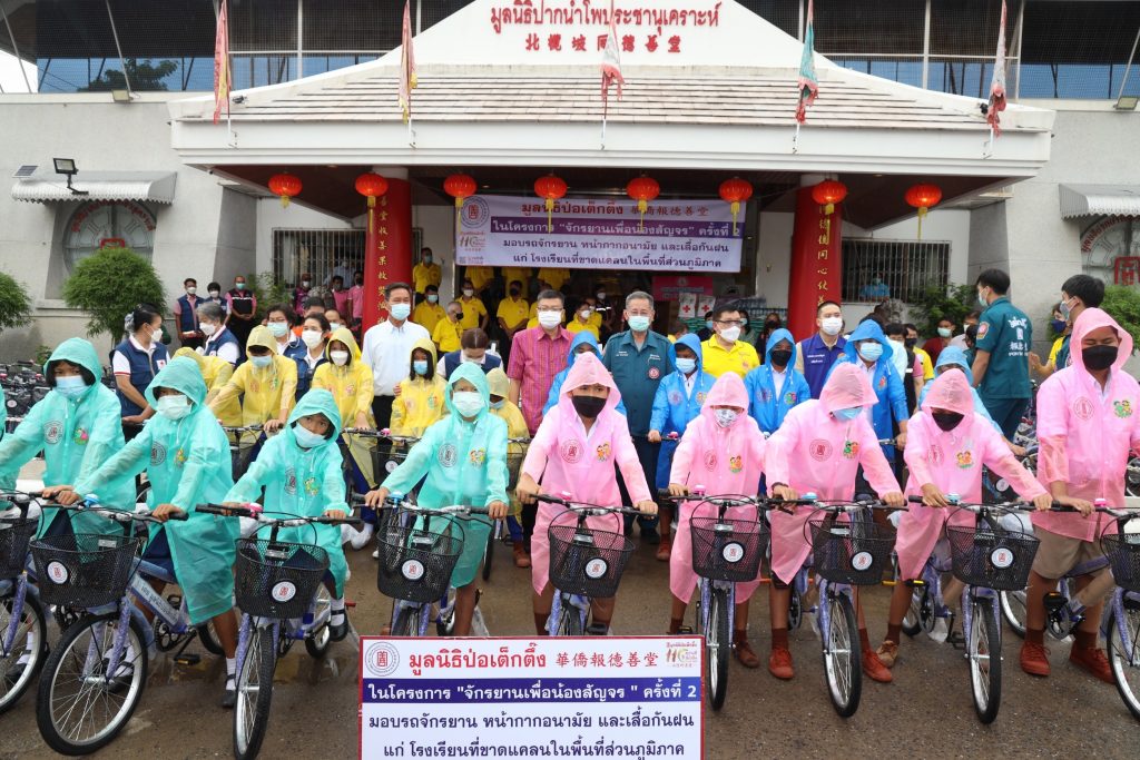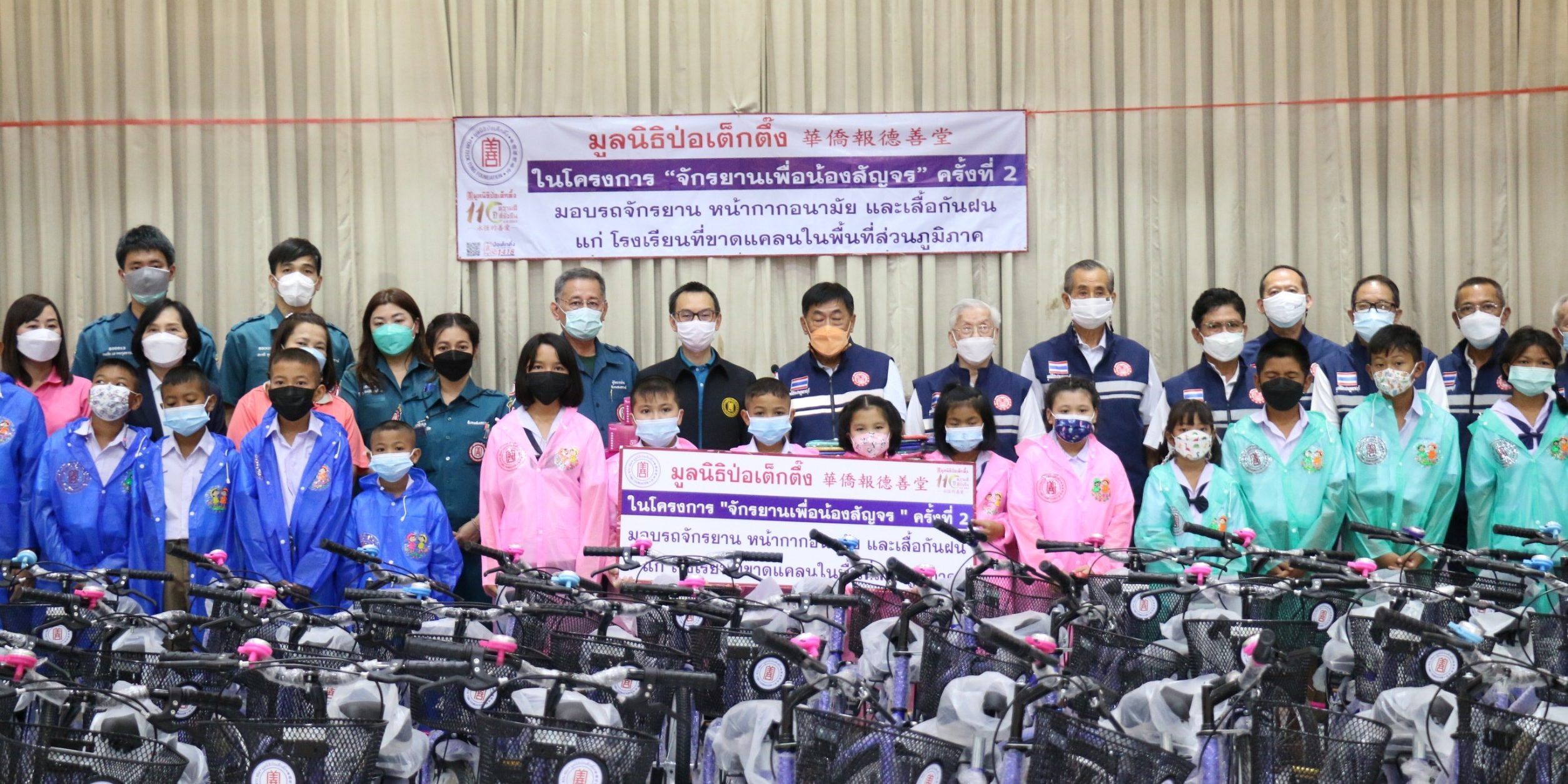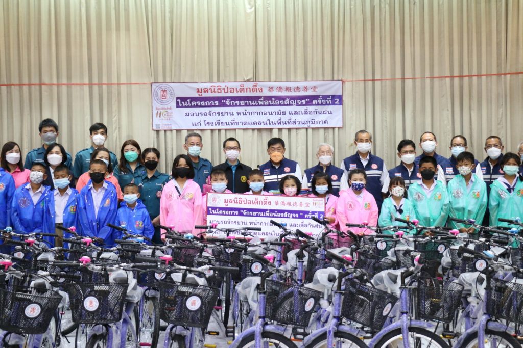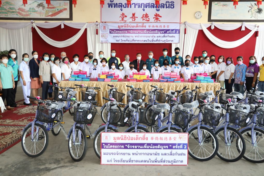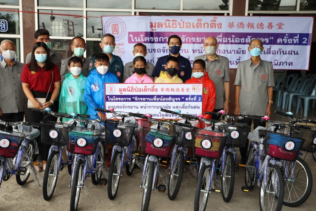 เสื้อกันฝน และหน้ากากอนามัย ให้กับโรงเรียนในชนบททางภาคกลาง และภาคใต้ ที่มีเยาวชนประสบปัญหาในด้านการเดินทางไปและกลับโรงเรียนด้วยความยากลำบาก ภายใต้โครงการจักรยานเพื่อน้องสัญจร ครั้งที่ 2 ประจำปี 2564 โดยคณะมูลนิธิป่อเต็กตึ๊งลงพื้นที่มอบให้กับโรงเรียนที่ขาดแคลนในพื้นที่รวม 16 จังหวัด ได้แก่ จังหวัดพระนครศรีอยุธยา อ่างทอง สุพรรณบุรี ชัยนาท อุทัยธานี กาญจนบุรี ราชบุรี สระแก้ว นครสวรรค์ ตาก ชุมพร สุราษฎร์ธานี พัทลุง นครศรีธรรมราช สงขลา และระนอง รวม 80 โรงเรียน รถจักรยาน จำนวน 1,500 คัน และในสถานการณ์แพร่ระบาดของเชื้อไวรัสโคโรนา (โควิด-19) ประกอบกับเป็นช่วงฤดูฝน มูลนิธิฯ ได้เล็งเห็นถึงความสำคัญจึงได้มอบหน้ากากอนามัยแก่โรงเรียนรวม 40,000 ชิ้น และเสื้อกันฝนรวม 4,000 ตัว รวมงบประมาณในการดำเนินโครงการฯ ทั้งสิ้น จำนวน 2,366,500 บาท (สองล้านสามแสนหกหมื่นหกพันห้าร้อยบาทถ้วน) ทั้งนี้เพื่อให้เด็กนักเรียนสามารถใช้จักรยานเดินทางมาโรงเรียนได้อย่างสะดวก อีกทั้งยังเป็นการส่งเสริมให้เด็กนักเรียนได้ออกกำลังกาย เรียนรู้กฎจราจร เรียนรู้การแบ่งปัน รวมถึงการดูแลรักษาสิ่งของส่วนรวมและใช้ประโยชน์ได้อย่างถูกต้อง โดยเมื่อเด็กนักเรียนจบการศึกษา จักรยานจะถูกส่งต่อให้แก่เด็กนักเรียนในรุ่นต่อไป โดยมี อาสาศิลปินมูลนิธิฯ คุณครู และตัวแทนนักเรียนจากโรงเรียนต่างๆ ร่วมในพิธี พร้อมด้วย สมาคม/มูลนิธิแต่ละจังหวัดเป็นผู้ประสานงานและร่วมในพิธี