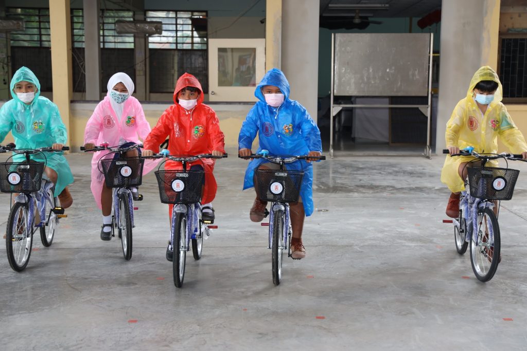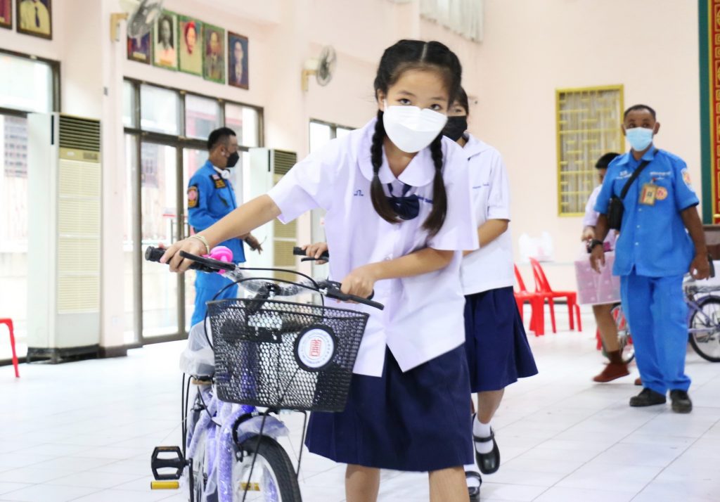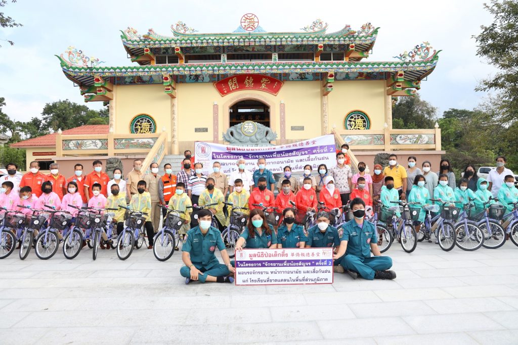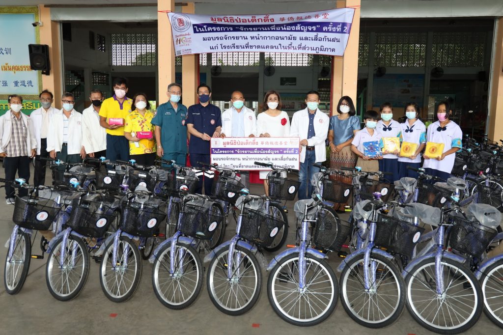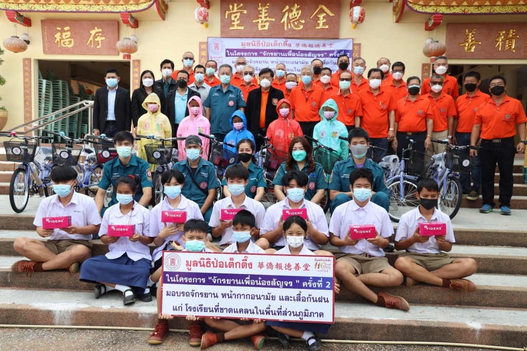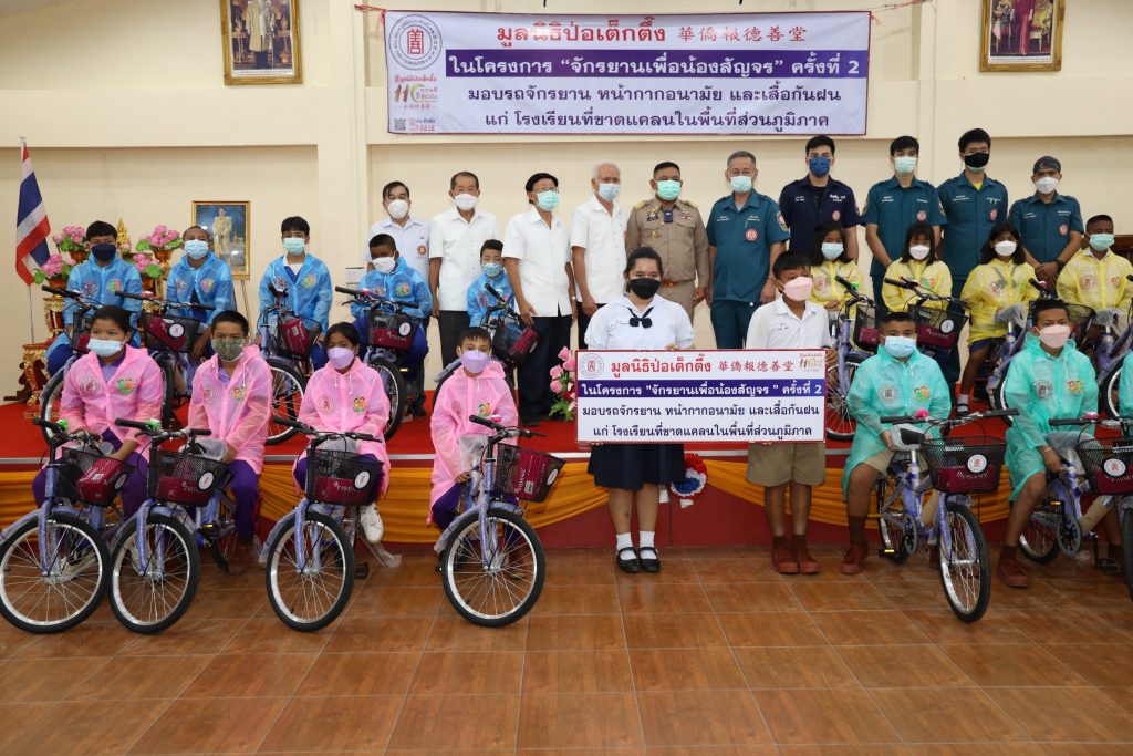 เสื้อกันฝน และหน้ากากอนามัย ให้กับโรงเรียนในชนบททางภาคกลาง และภาคใต้ ที่มีเยาวชนประสบปัญหาในด้านการเดินทางไปและกลับโรงเรียนด้วยความยากลำบาก ภายใต้โครงการจักรยานเพื่อน้องสัญจร ครั้งที่ 2 ประจำปี 2564 โดยคณะมูลนิธิป่อเต็กตึ๊งลงพื้นที่มอบให้กับโรงเรียนที่ขาดแคลนในพื้นที่รวม 16 จังหวัด ได้แก่ จังหวัดพระนครศรีอยุธยา อ่างทอง สุพรรณบุรี ชัยนาท อุทัยธานี กาญจนบุรี ราชบุรี สระแก้ว นครสวรรค์ ตาก ชุมพร สุราษฎร์ธานี พัทลุง นครศรีธรรมราช สงขลา และระนอง รวม 80 โรงเรียน รถจักรยาน จำนวน 1,500 คัน และในสถานการณ์แพร่ระบาดของเชื้อไวรัสโคโรนา (โควิด-19) ประกอบกับเป็นช่วงฤดูฝน มูลนิธิฯ ได้เล็งเห็นถึงความสำคัญจึงได้มอบหน้ากากอนามัยแก่โรงเรียนรวม 40,000 ชิ้น และเสื้อกันฝนรวม 4,000 ตัว รวมงบประมาณในการดำเนินโครงการฯ ทั้งสิ้น จำนวน 2,366,500 บาท (สองล้านสามแสนหกหมื่นหกพันห้าร้อยบาทถ้วน) ทั้งนี้เพื่อให้เด็กนักเรียนสามารถใช้จักรยานเดินทางมาโรงเรียนได้อย่างสะดวก อีกทั้งยังเป็นการส่งเสริมให้เด็กนักเรียนได้ออกกำลังกาย เรียนรู้กฎจราจร เรียนรู้การแบ่งปัน รวมถึงการดูแลรักษาสิ่งของส่วนรวมและใช้ประโยชน์ได้อย่างถูกต้อง โดยเมื่อเด็กนักเรียนจบการศึกษา จักรยานจะถูกส่งต่อให้แก่เด็กนักเรียนในรุ่นต่อไป โดยมี อาสาศิลปินมูลนิธิฯ คุณครู และตัวแทนนักเรียนจากโรงเรียนต่างๆ ร่วมในพิธี พร้อมด้วย สมาคม/มูลนิธิแต่ละจังหวัดเป็นผู้ประสานงานและร่วมในพิธี