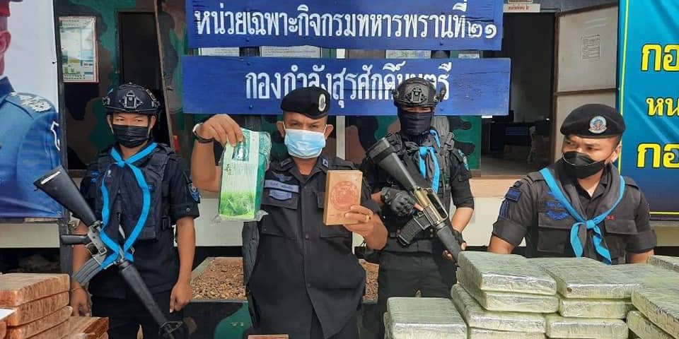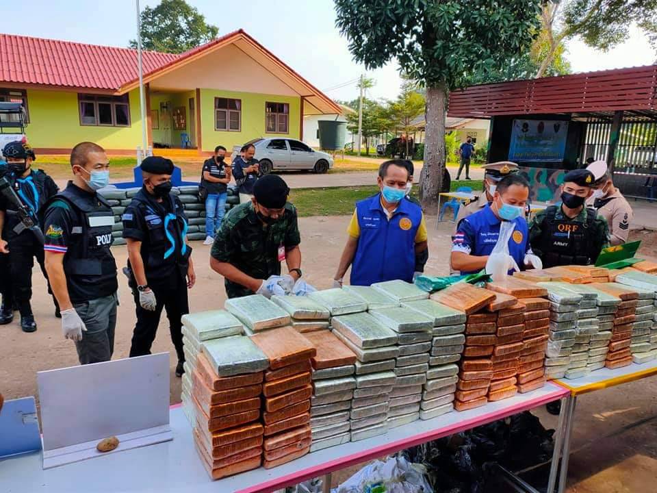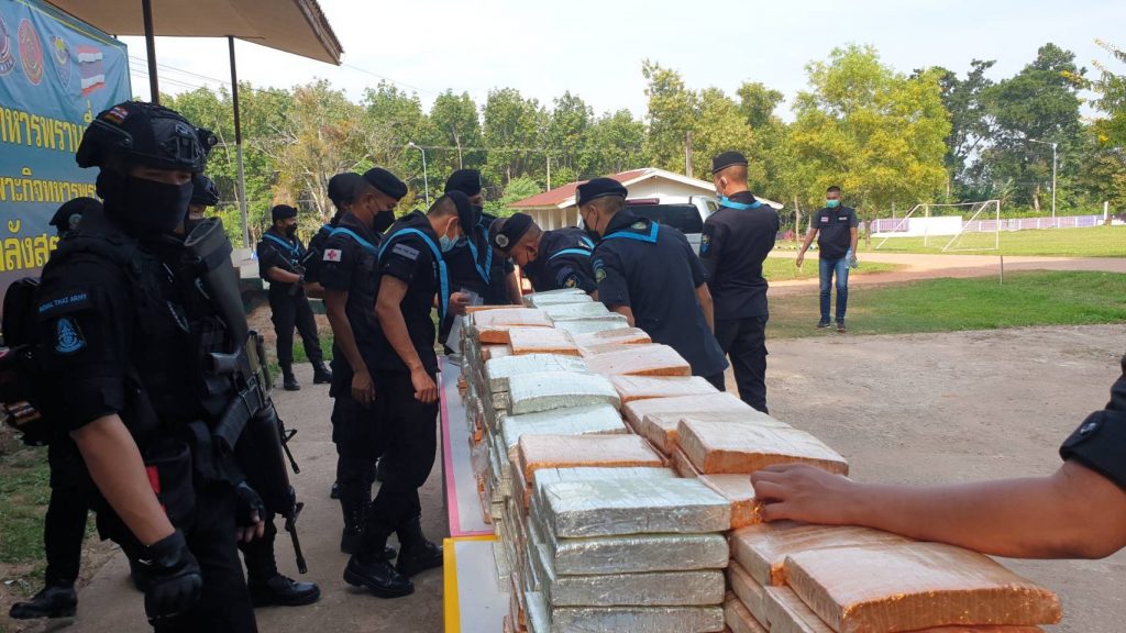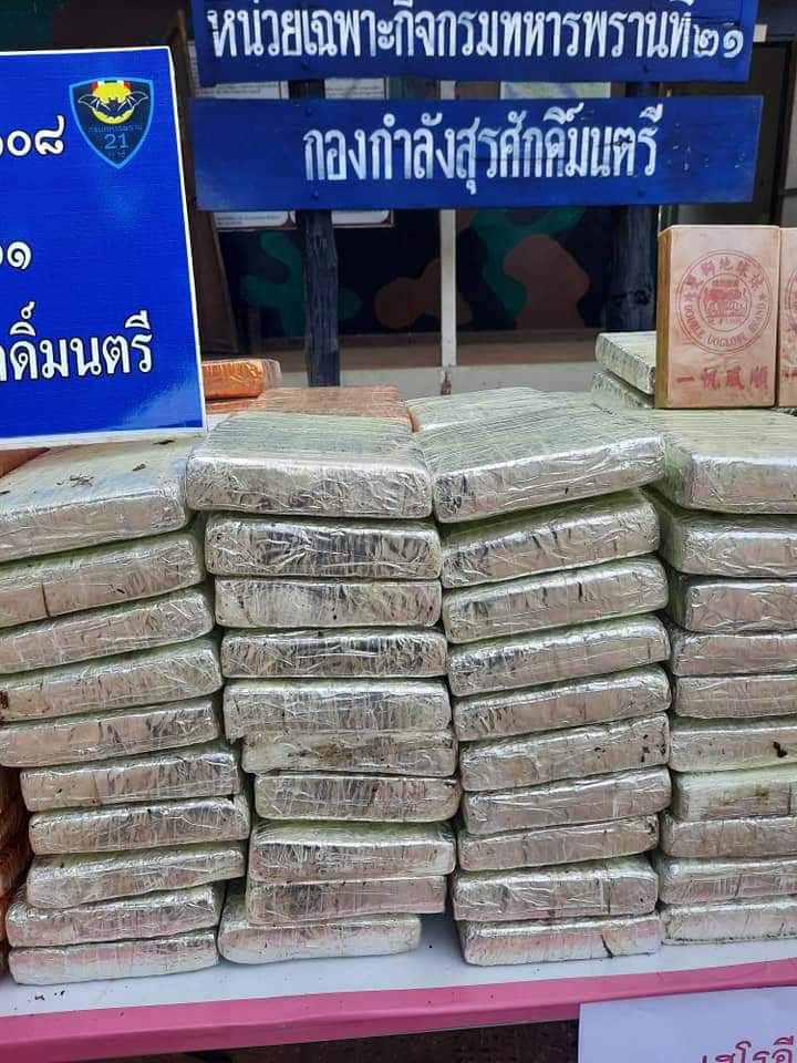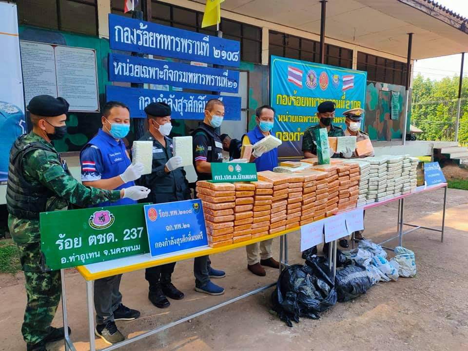 วันที่ 27 ตุลาคม 64 ที่กองร้อยทหารพรานที่ 2108 บ้านปากห้วยม่วง ต.นาเข อ.บ้านแพง จ.นครพนม นายชัชวาลย์ ทองชน นายอำเภอบ้านแพง พ.อ.อุทัย นิลเนตจ ผู้บังคับหน่วยเฉพาะกิจกรมทหารพรานที่ 21 พ.ต.ท.โกเศษฐ์ค่ำคืน รอง ผกก.สส.สภ.บ้านแพง ตชด.237 ร.ต.วันชาติ เหมืนปืน ผบ.ร้อย ทพ.2108 ร่วมกับ นรข.บ้านแพง ชุดปฏิบัติการปราบปรามยาเสพติดตามแนวชายแดน กองกำลังสุรศักดิ์มนตรี ร่วมสกัดยึดกัญชาเกรดเอ จำนวน 310 แท่ง น้ำหนักแท่งละประมาณ 1 กิโลกรัม รวมน้ำหนัก 310 กิโลกรัม เฮโรอีน 0.76 กิโลกรัม ยาไอซ์ 1 กิโลกรัม โดยยาเสพติดทั้งหมดข้างต้นตรวจยึดได้ที่บริเวณริมฝั่งแม่น้ำโขง ระหว่างบ้านโพธิ์ไทรทอง หมู่ 8 ต.ไผ่ล้อม อ.บ้านแพง ในช่วงเช้าที่ผ่านมา แต่ไม่สามารถจับกุมผู้ต้องหาได้ โดยตรวจยึดได้ภายหลังระดมกำลังออกลาดตระเวนสกัดกั้นปราบปรามขบวนการลักลอบขนยาเสพติด สิ่งผิดกฎหมายตามแนวชายแดนอย่างต่อเนื่อง