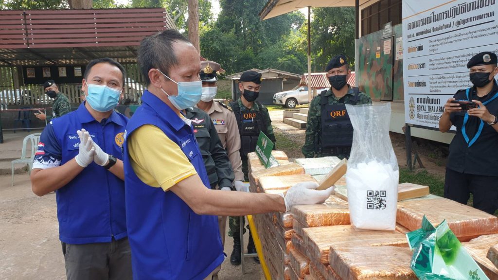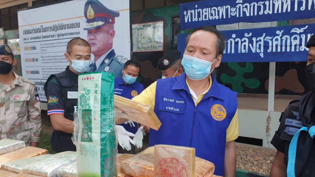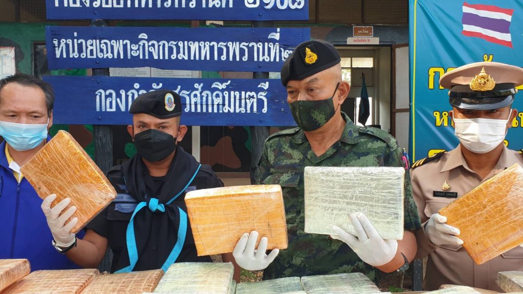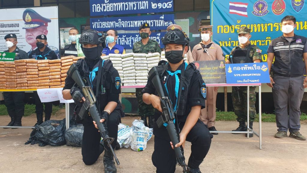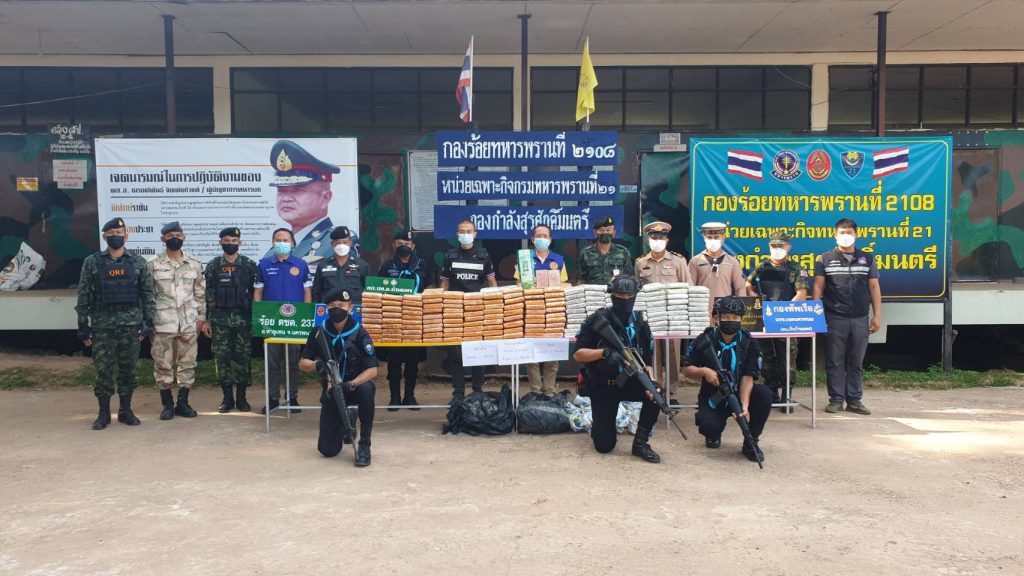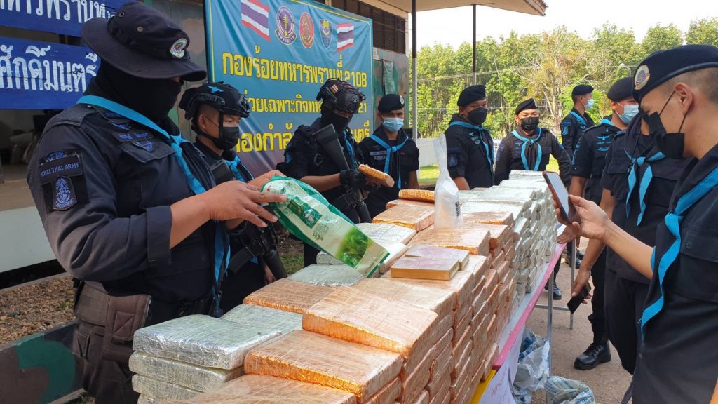 วันที่ 27 ตุลาคม 64 ที่กองร้อยทหารพรานที่ 2108 บ้านปากห้วยม่วง ต.นาเข อ.บ้านแพง จ.นครพนม นายชัชวาลย์ ทองชน นายอำเภอบ้านแพง พ.อ.อุทัย นิลเนตจ ผู้บังคับหน่วยเฉพาะกิจกรมทหารพรานที่ 21 พ.ต.ท.โกเศษฐ์ค่ำคืน รอง ผกก.สส.สภ.บ้านแพง ตชด.237 ร.ต.วันชาติ เหมืนปืน ผบ.ร้อย ทพ.2108 ร่วมกับ นรข.บ้านแพง ชุดปฏิบัติการปราบปรามยาเสพติดตามแนวชายแดน กองกำลังสุรศักดิ์มนตรี ร่วมสกัดยึดกัญชาเกรดเอ จำนวน 310 แท่ง น้ำหนักแท่งละประมาณ 1 กิโลกรัม รวมน้ำหนัก 310 กิโลกรัม เฮโรอีน 0.76 กิโลกรัม ยาไอซ์ 1 กิโลกรัม โดยยาเสพติดทั้งหมดข้างต้นตรวจยึดได้ที่บริเวณริมฝั่งแม่น้ำโขง ระหว่างบ้านโพธิ์ไทรทอง หมู่ 8 ต.ไผ่ล้อม อ.บ้านแพง ในช่วงเช้าที่ผ่านมา แต่ไม่สามารถจับกุมผู้ต้องหาได้ โดยตรวจยึดได้ภายหลังระดมกำลังออกลาดตระเวนสกัดกั้นปราบปรามขบวนการลักลอบขนยาเสพติด สิ่งผิดกฎหมายตามแนวชายแดนอย่างต่อเนื่อง