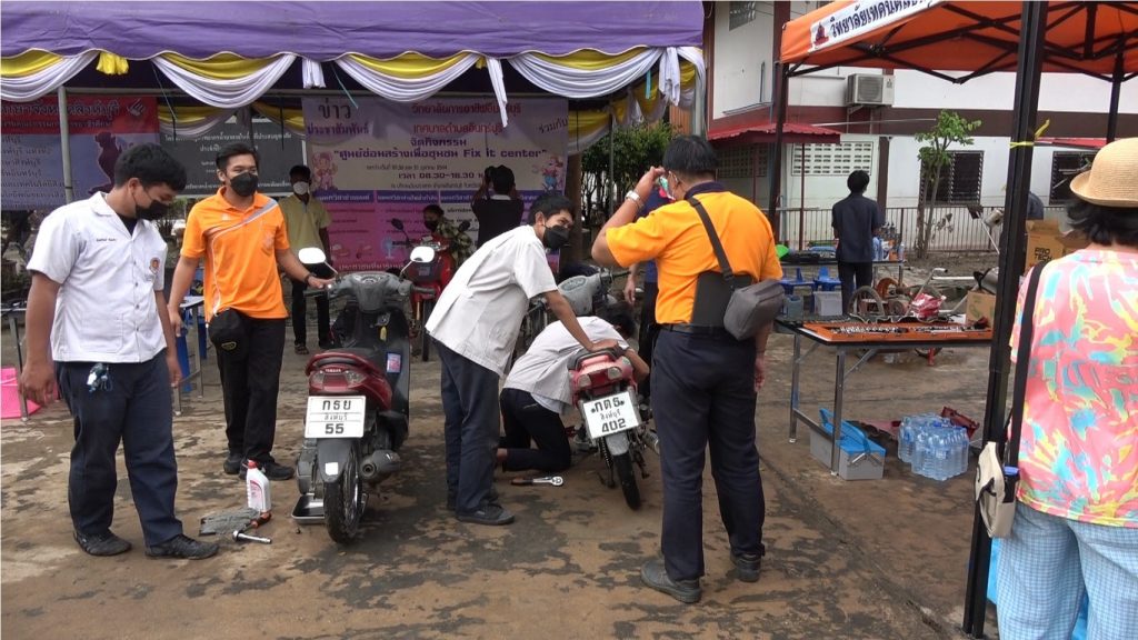 ต่อจากนั้น ผู้ว่าราชการจังหวัดสิงห์บุรี พร้อมคณะได้เดินทางไปตรวนเยี่ยมให้กำลังใจคณะผู้บริหาร ครู นักเรียน นักศึกษานักเรียน นักศึกษา และอาจารย์ จากวิทยาลัยเทคนิคสิงห์บุรี วิทยาลัยเทคนิคสิงห์บุรีแห่งที่ 2 วิทยาลัยอาชีวศึกษาสิงห์บุรี วิทยาลัยเกษตรและเทคโนโลยีสิงห์บุรี วิทยาลัยการอาชีพอินทร์บุรี วิทยาลัยเทคโนโลยีพณิชยการสิงห์บุรี และวิทยาลัยเทคโนโลยีบริหารธุรกิจสิงห์บุรี ที่รวมนักเรียน นักศึกษาในสาขาวิชาต่าง ๆ เป็นทีม Fix It Center หมุนเวียนออกมาให้บริการช่วยเหลือประชาชนที่ประสบอุทกภัย ในพื้นที่จังหวัดสิงห์บุรี ศูนย์ซ่อมสร้างเพื่อชุมชน Fix it Center ของ ซึ่งมีนักศึกษาจิตอาสา มาให้บริการซ่อมรถยนต์ รถจักรยานยนต์ เครื่องจักรกลการเกษตร เครื่องใช้ไฟฟ้าในครัวเรือน งานเชื่อม และซ่อมคอมพิวเตอร์ โดยเปิดให้บริการเป็นเวลา 3 วัน ระหว่างวันที่ 29-31 ตุลาคม 2564 ตั้งแต่เวลา 08.30-16.30 น. ณ บริเวณวัดปราสาท อำเภออินทร์บุรี ซึ่งประชาชนสามารถรับบริการได้ ด้วยบัตรประชาชนเพียงใบเดียว