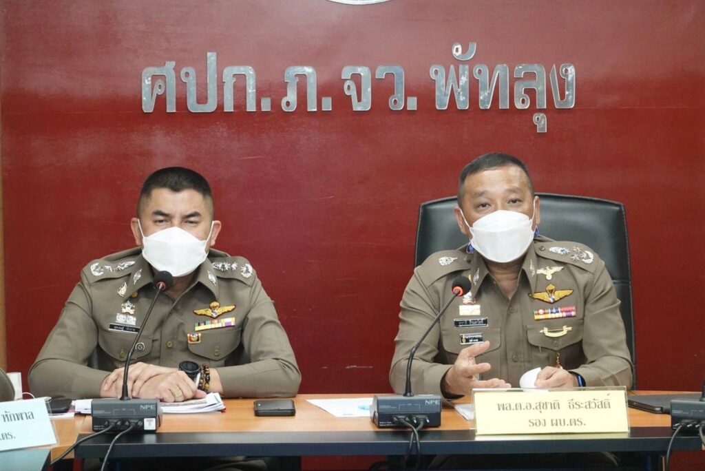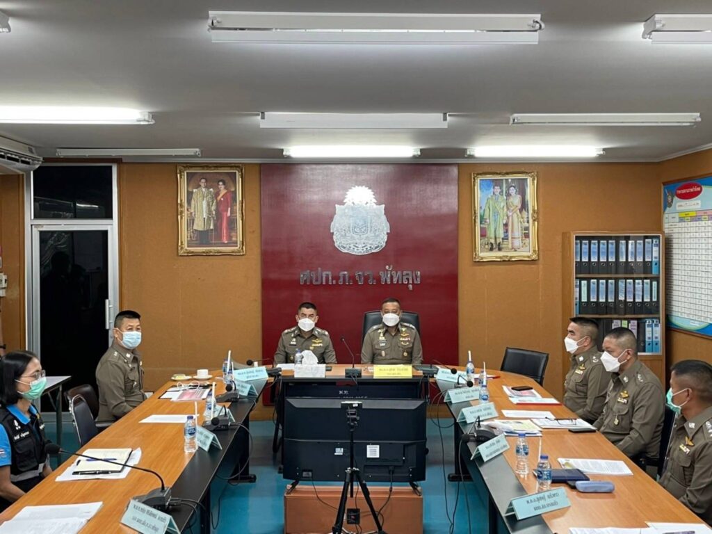 โดยมี พล.ต.ท.สุรเชษฐ์ หักพาล ผู้ช่วย ผบ.ตร.,พล.ต.ต.ไพโรจน์ กุจินพันธ์ ผบก.อธ.,พ.ต.อ.สุริยา ปัญญาฉัง รอง ผบก.ภ.จ.พัทลุง,พ.ต.อ.วรชาติ รสจันทน์ รอง ผบก.ภ.จ.พัทลุง,พ.ต.อ.ยศวรรธน์ กระจ่างวงศ์ ผกก.สส.ภ.จ.พัทลุง,พ.ต.อ.ประสิทธิ์ ปานคำ ผกก.(สอบสวน) กลุ่มงานสอบสวน ภ.จ.พัทลุง พร้อมคณะพนักงานสืบสวนสอบสวนฯ ตามคำสั่ง ตร. ที่ 539/2564 ลง 29 ต.ค.64 จนท.ศพฐ.9 และเจ้าหน้าที่ที่เกี่ยวข้องเข้าร่วมประชุม ณ ห้องประชุม ศปก.ภ.จ.พัทลุง