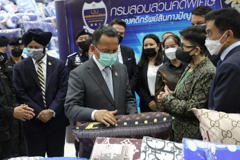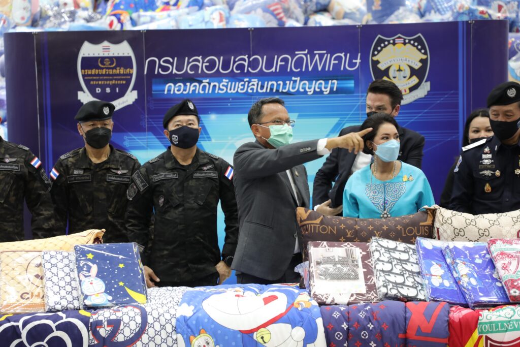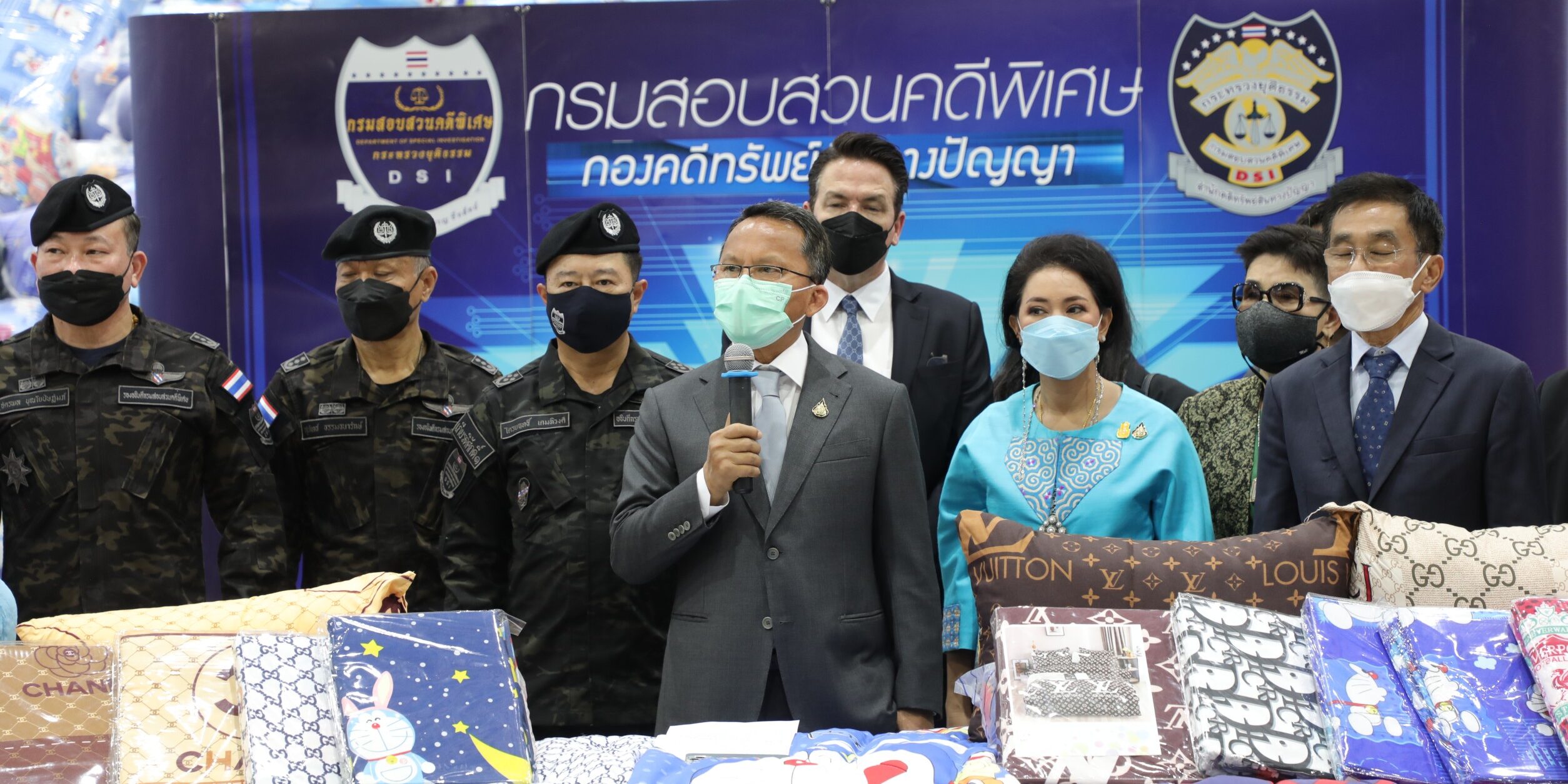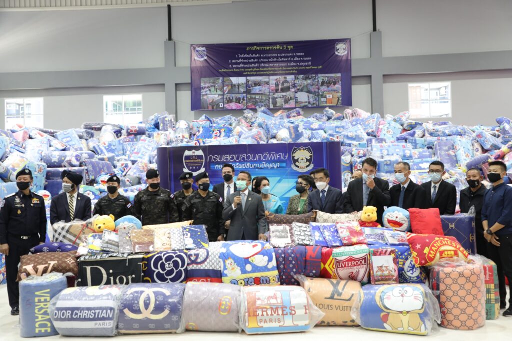 จากนั้นนายสมศักดิ์ฯ กล่าวว่า ตนต้องขอขอบคุณทางดีเอสไอที่ดำเนินการตามนโยบายรัฐบาล เข้าตรวจค้นสถานที่ต้องสงสัยซุกซ่อนสินค้าที่ละเมิดเครื่องหมายการค้า 3 จุด ไปเมื่อวันที่ 28 ตุลาคม ที่ผ่านมา ผลการตรวจค้นทั้ง 3 จุด ที่ระยอง 2 จุด และปทุมธานี 1 จุด พบสินค้าประเภทที่นอน ผ้าห่ม และชุดผ้าปูที่นอน ที่ละเมิดเครื่องหมายการค้า ยี่ห้อโดราเอมอน หลุยส์ วิตตอง ดิออร์ ชินจัง เบนเทน กุชชี่ เชลซี ลิเวอร์พูล แมนเชสเตอร์ ยูไนเต็ด และเครื่องหมายการค้ายี่ห้อดังหลายยี่ห้อ จำนวน 40,000 ชิ้น มีมูลค่าสินค้าตามราคาท้องตลาดกว่า 40 ล้านบาท และคิดเป็นมูลค่าความเสียหายตามราคาของแท้เป็นเงิน 160 ล้านบาท ซึ่งจากนโยบายรัฐบาล ตนได้สั่งการให้ดีเอสไอ เร่งรัดดำเนินการสืบสวน จับกุมการละเมิดทรัพย์สินทางปัญญาทั่วประเทศ และได้เฝ้าสืบสวนติดตามกลุ่มบุคคล ซึ่งมีพฤติการณ์จำหน่ายสินค้าที่ละเมิดเครื่องหมายการค้า ในลักษณะเป็นผู้ค้ารายใหญ่ระดับต้นๆ ของประเทศ ที่มีการจำหน่ายสินค้าในรูปแบบของการค้าส่งและค้าปลีก และมีการเสนอจำหน่ายสินค้าในรูปแบบของการจัดงานแสดงสินค้าขนาดใหญ่ ตามพื้นที่ชุมชนต่างๆที่มีการโฆษณาประชาสัมพันธ์ให้กลุ่มประชาชนทั่วไป ได้รับทราบทางสื่อออนไลน์หลากหลายช่องทาง โดยจะมีการขยายผลสืบต่อเพื่อให้เข้าถึงโรงงานผู้ผลิตรายใหญ่ต่อไป