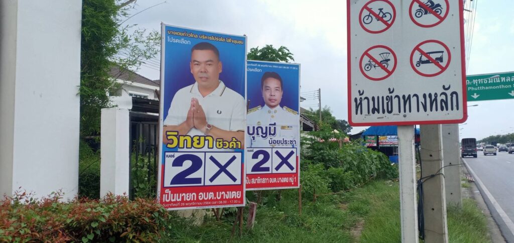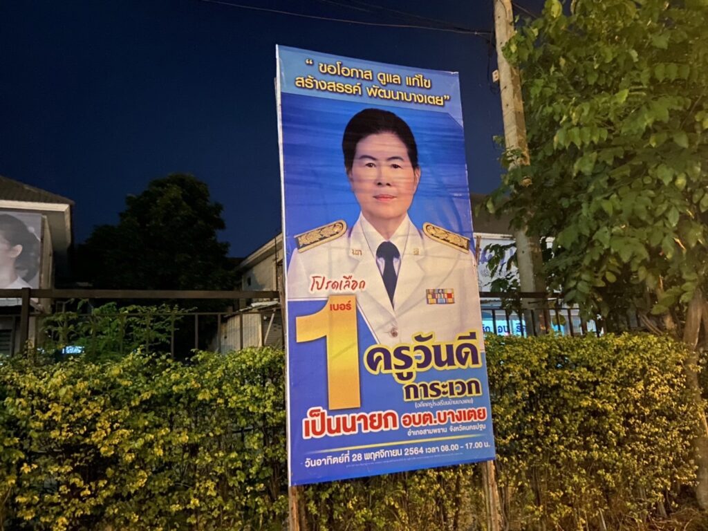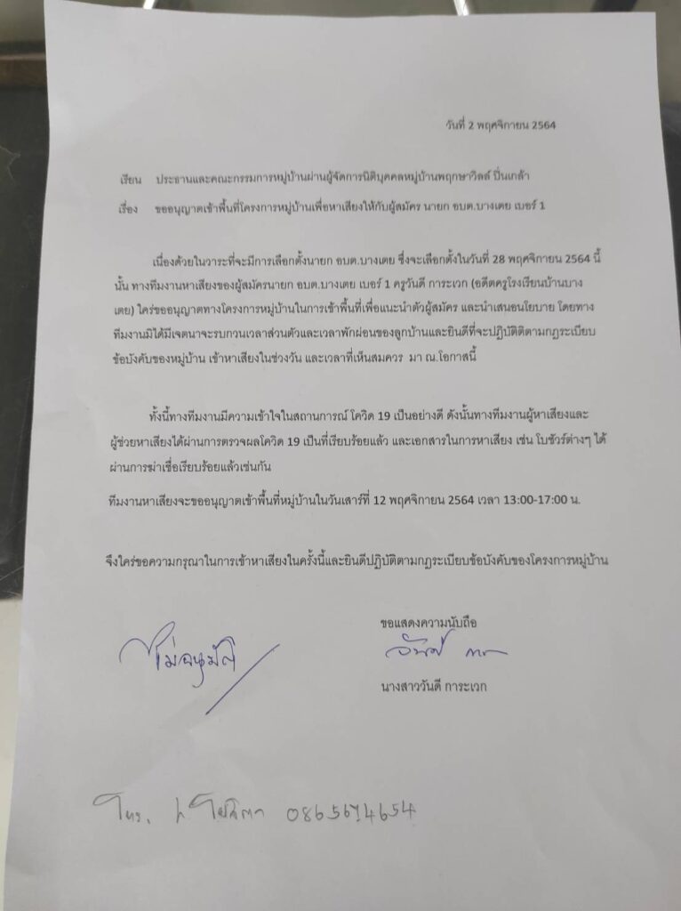 นางสาวพรทิพย์ผู้จัดการหมู่บ้านดังแหง่หนึ่งในจังหวัดนครปฐม ว่า เมื่อวันอังคารที่ผ่านมา มีผู้อ้างเป็นทีมงานผู้สมัครนายก อบต. บางเตย ได้เข้ามายื่นเอกสาร เพื่อขอเข้ามาหาเสียงในหมู่บ้าน และติดตั้งป้ายหาเสียง ทางตนเองก็ได้รับเอกสารไว้แล้วและแจ้งว่าจะต้องขออนุญาตคณะกรรมการหมู่บ้านก่อน แล้วจะแจ้งกลับไปให้ทราบ