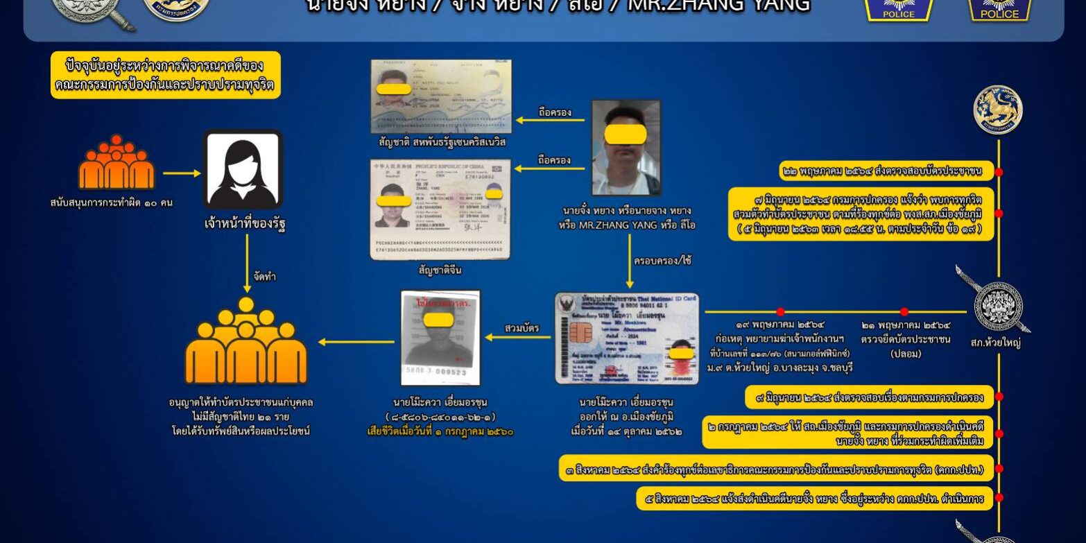 6.กรณีบัตรประจำตัวประชาชนปลอมที่ตรวจยึดไว้ จากการสอบสวนทราบว่าความผิดเกิดขึ้นในเขตอำนาจสอบสวนของ สภ.เมืองชัยภูมิ ได้ส่งข้อมูลและบัตรประจำตัวประชาชนปลอม (ของกลาง) ให้ สภ.เมืองชัยภูมิ และ แจ้งผู้อำนวยการสำนักบริหารการทะเบียน กรมการปกครอง ดำเนินคดีกับ นายจั๋ง หยาง แล้ว ต่อมาได้รับแจ้งจาก สภ.เมืองชัยภูมิ เกี่ยวกับการดำเนินคดี กับนายจั๋ง หยาง ว่า สภ.เมืองชัยภูมิ ได้ส่งคำร้องทุกข์กล่าวโทษกรณีกล่าวหานายจั๋ง หยาง ให้เลขาธิการ ปปช. คดีอยู่ระหว่างการดำเนินการของ ปปช.ภาค 3