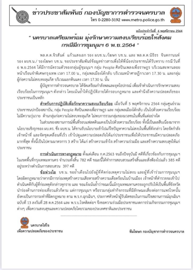 วันที่ 6 พฤศจิกายน 2564 : พล.ต.ต.จิรสันต์ แก้วแสงเอก รอง ผบช.น./โฆษก บช.น. และ พล.ต.ต.นิธิธร จินตกานนท์ รอง ผบช.น./ รองโฆษก บช.น. ขอประชาสัมพันธ์ข้อมูลข่าวสารเพื่อให้พี่น้องประชาชนได้รับทราบ กรณีวันที่ 6 พ.ย.64 ได้มีการนัดรวมตัวของกลุ่มผู้ชุมนุมฯ กลุ่ม People ศิลปินเพลงเพื่อราษฎร บริเวณสะพานลอยหน้าเรือนจำพิเศษกรุงเทพ เวลา 17.00 น.,กลุ่มพลเมืองโต้กลับ บริเวณหน้าศาลฎีกาเวลา 17.30 น. และกลุ่มผู้ก่อความไม่สงบทะลุแก๊ส บริเวณแยกดินแดง เวลา 17.30 น. นั้น