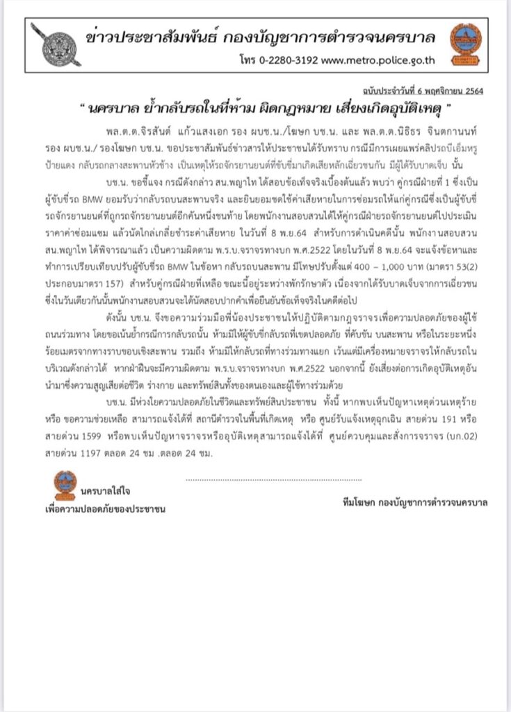 กองบัญชาการตำรวจนครบาล (บช.น.) ขอชี้แจง กรณีดังกล่าว เจ้าหน้าที่ตำรวจ สน.พญาไท ได้สอบข้อเท็จจริงเบื้องต้นแล้ว พบว่า คู่กรณีฝ่ายที่ 1 ซึ่งเป็นผู้ขับขี่รถ BMW ยอมรับว่ากลับรถบนสะพานจริง และยินยอมชดใช้ค่าเสียหายในการซ่อมรถให้แก่คู่กรณีซึ่งเป็นผู้ขับขี่รถจักรยานยนต์ที่ถูกรถจักรยานยนต์อีกคันหนึ่งชนท้าย โดยพนักงานสอบสวนได้ให้คู่กรณีฝ่ายรถจักรยานยนต์ไปประเมินราคาค่าซ่อมแซม แล้วนัดไกล่เกลี่ยชำระค่าเสียหาย ในวันที่ 8 พ.ย.64