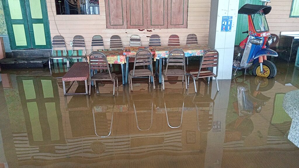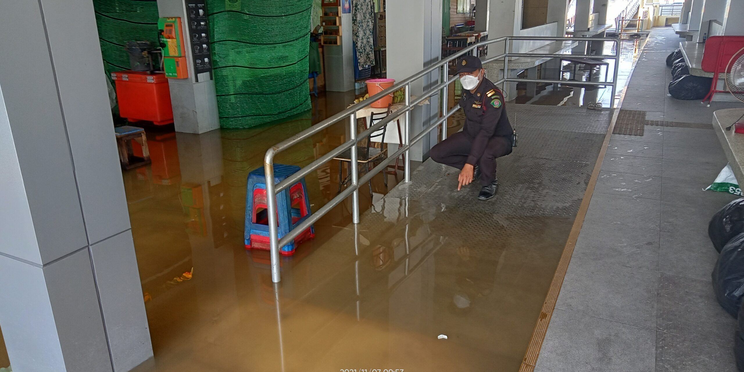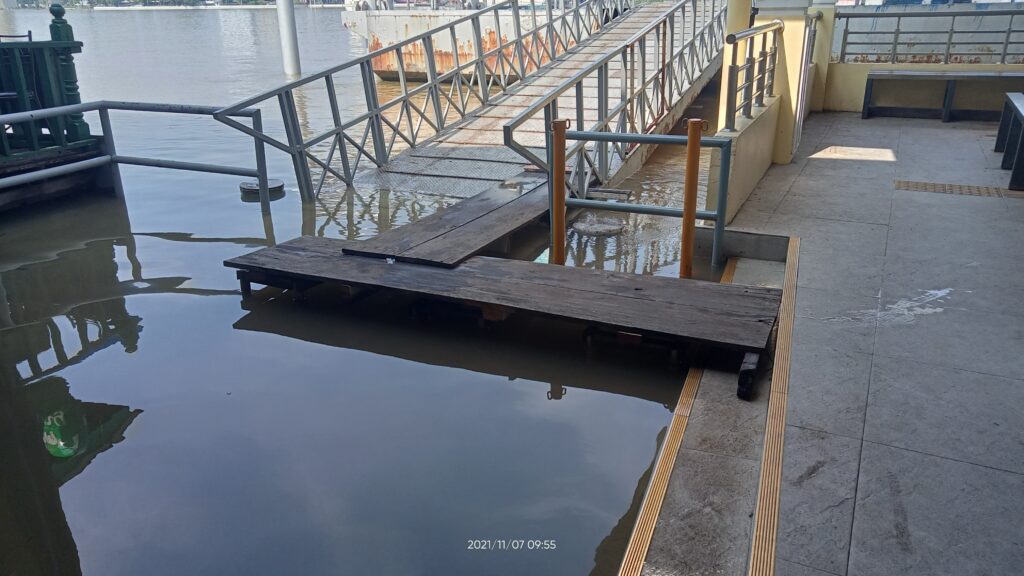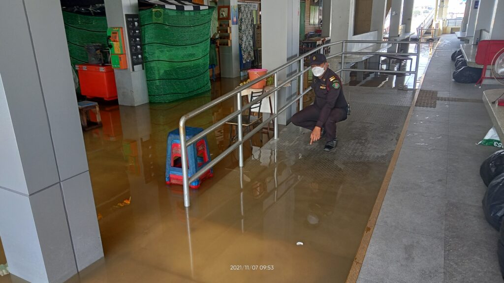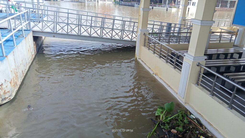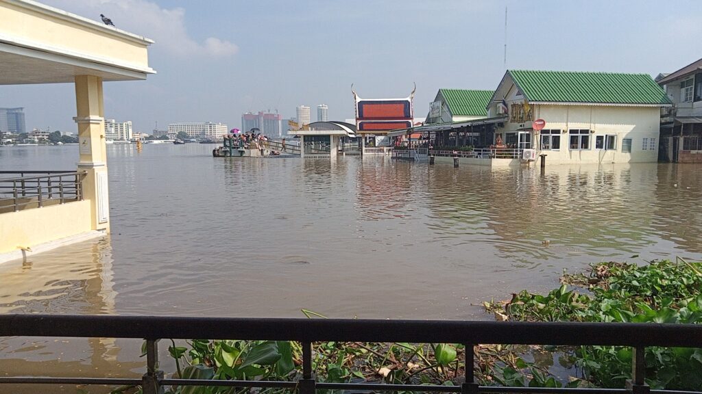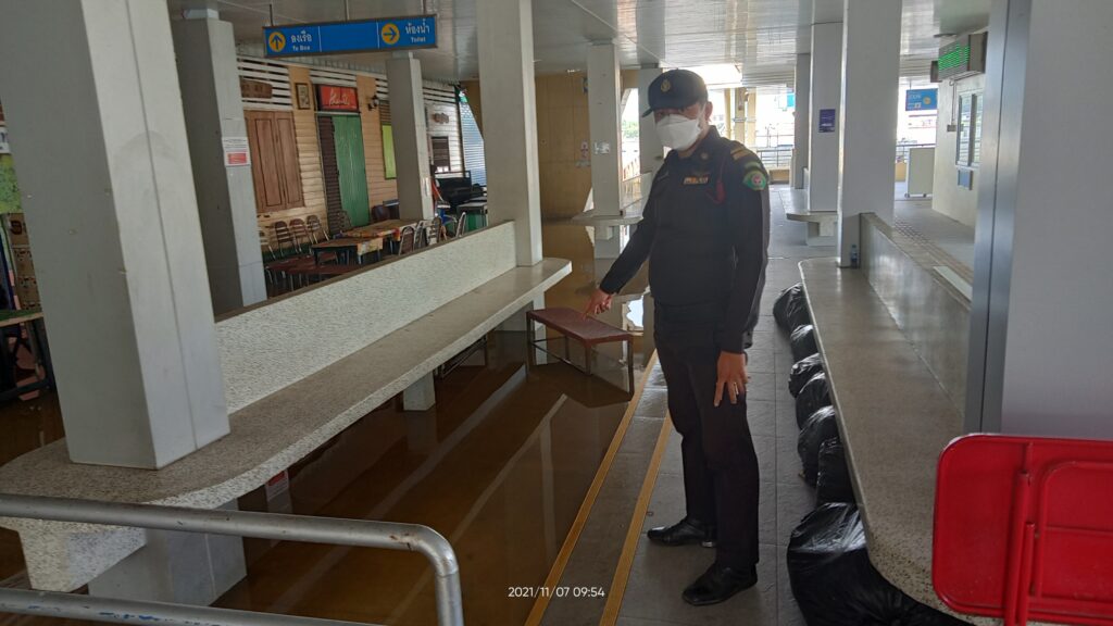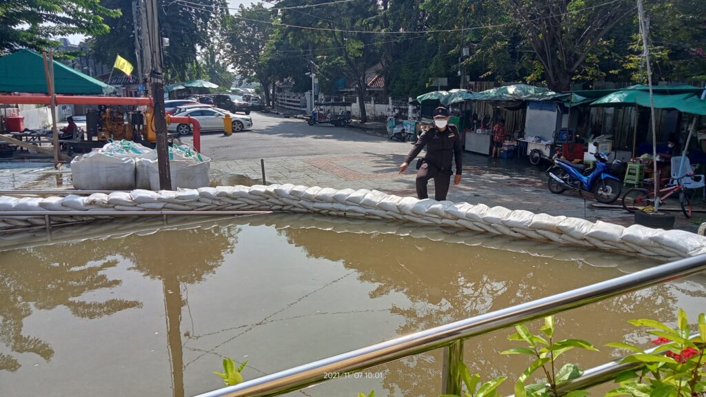 ทั้งนี้จากการตรวจสอบวันนี้ระดับน้ำเช้านี้ มีปริมาณมวลน้ำขึ้นสูงเอ่อไหลขึ้นท่วมท่าเรือเทเวศร์ และ แนวกระสอบทรายวางกั้นด้านนอกมีน้ำได้ไหลซึมผ่านกระสอบทรายซึมผ่านซอกกำแพงปูน