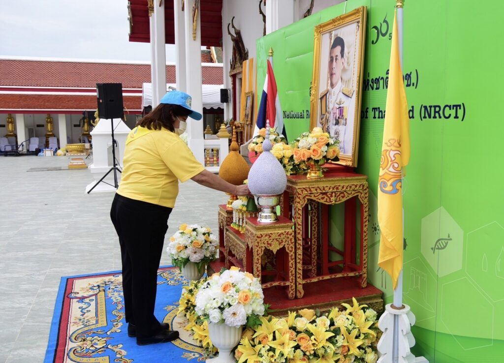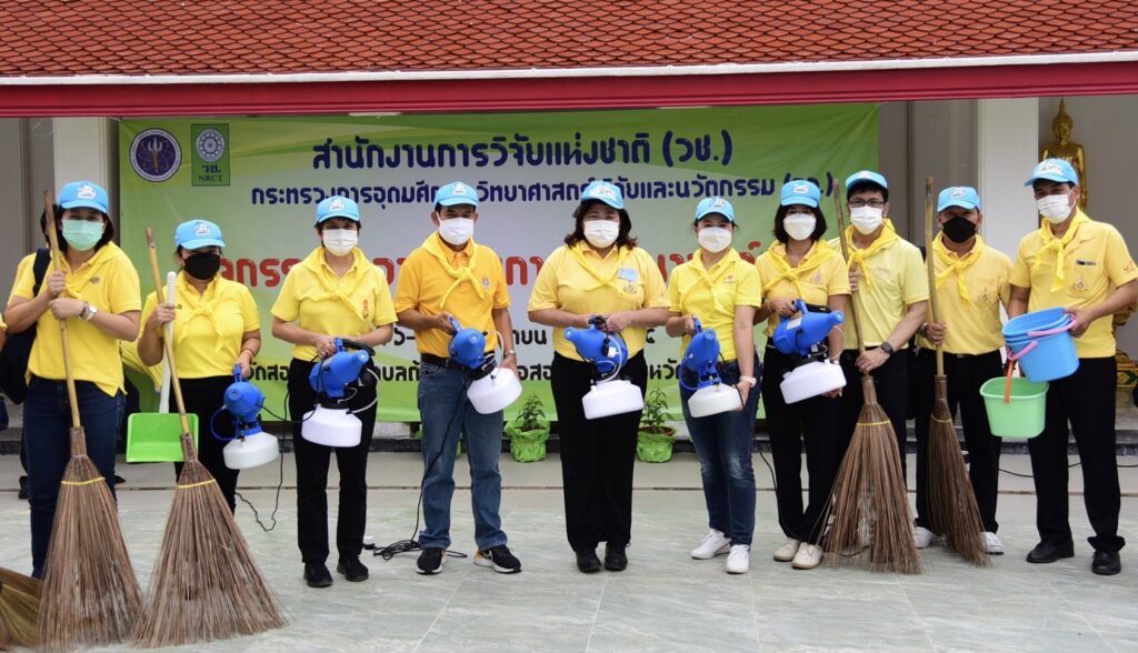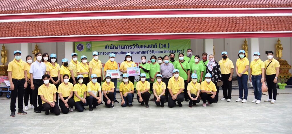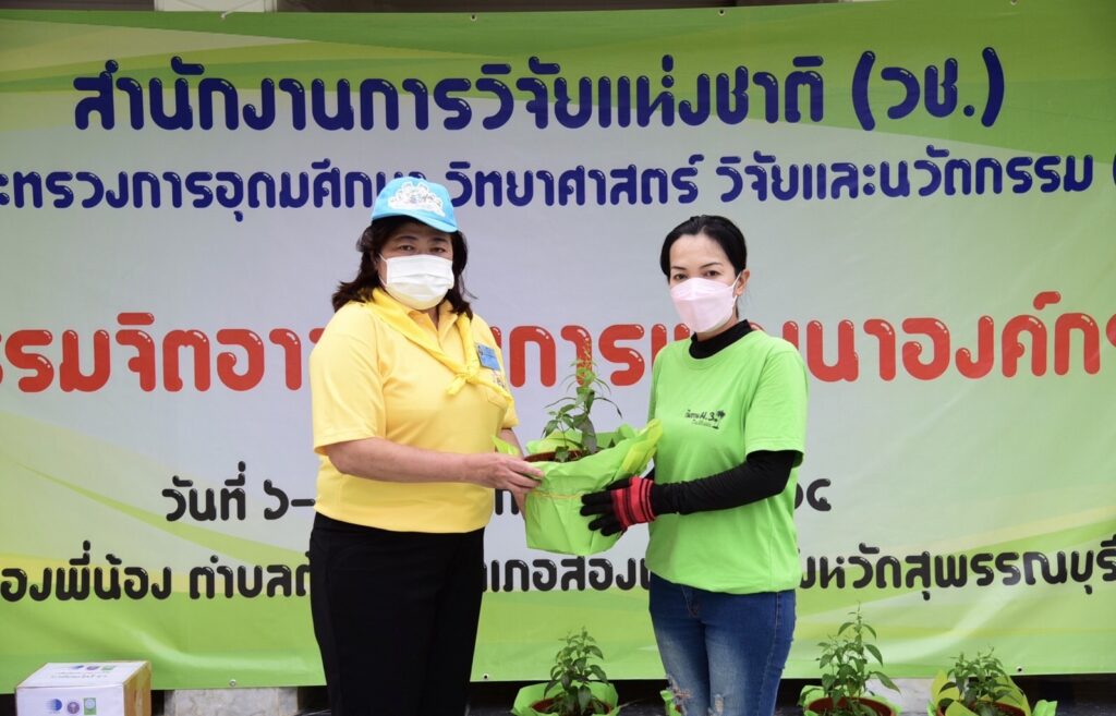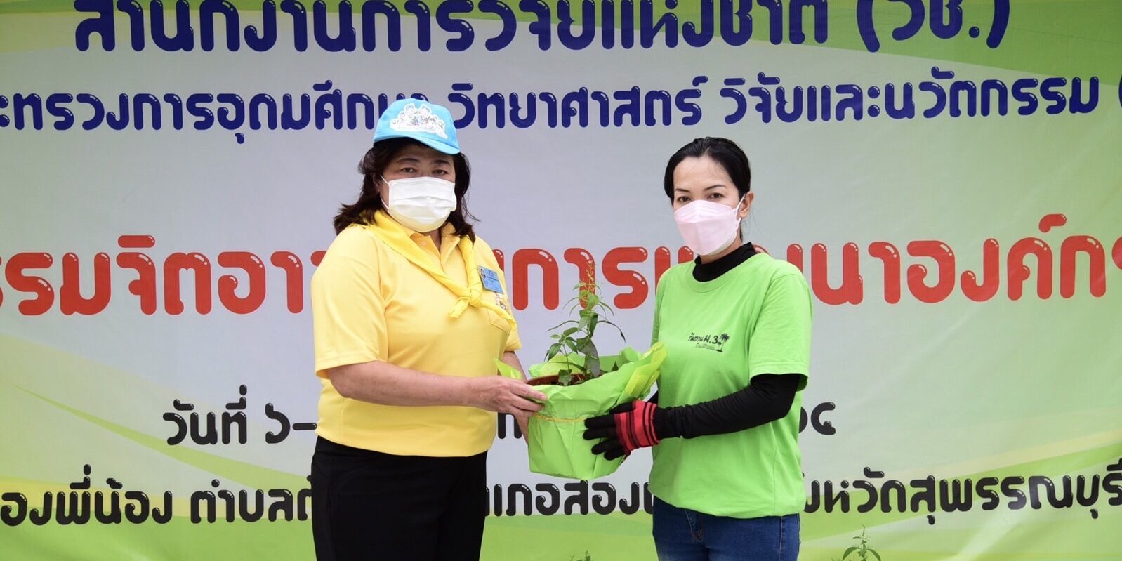 เมื่อวันที่ 6 พฤศจิกายน 2564 ที่อำเภอสองพี่น้อง จังหวัดสุพรรณบุรี ดร.วิภารัตน์ ดีอ่อง ผู้อำนวยการสำนักงานการวิจัยแห่งชาติ นำคณะผู้บริหาร และเจ้าหน้าที่ สำนักงานการวิจัยแห่งชาติ (วช.) กระทรวงการอุดมศึกษา วิทยาศาสตร์ วิจัยและนวัตกรรม (อว.) จัดกิจกรรมโครงการจิตอาสากับการพัฒนาองค์กร เพื่อปลูกฝังคุณธรรม จริยธรรม และการมีจิตสาธารณะให้บุคลากร ดำเนินรอยตามตามโครงการอันเนื่องมาจากพระราชปณิธาน โดยร่วมกันทำความสะอาดพื้นที่สาธารณประโยชน์ ณ วัดสองพี่น้อง พร้อมมอบผลิตภัณฑ์บาล์มตะไคร้ (อว.) ซึ่งเป็นผลงานของนักวิจัยจาก สถาบันวิจัยวิทยาศาสตร์และเทคโนโลยี (วว.) โดยการสนับสนุนทุนวิจัยจาก (วช.) จำนวน 600 ขวด แก่ชุมชนต้นตาล อำเภอสองพี่น้อง จังหวัดสุพรรณบุรี เพื่อนำไปใช้รักษาโรคน้ำกัดเท้า และโรคผิวหนังในช่วงประสบอุทกภัย นอกจากนี้ ยังมอบต้นฟ้าทะลายโจร จากโครงการเพิ่มรายได้ให้แก่เกษตรกรคืนถิ่นจากสถานการณ์โควิด-19 ที่ วช.ให้การสนับสนุนทุนวิจัย จำนวน 4,000 ต้น เพื่อนำไปใช้ป้องกันโรคโควิด-19 และส่งเสริมการปลูกสมุนไพรไทยอย่างแพร่หลาย นับเป็นการสร้างสังคมให้เข้มแข็ง ประชาชนมีความสุขอย่างยั่งยืน รวมถึงทำนุบำรุงพระพุทธศาสนาให้คงอยู่สืบต่อไป