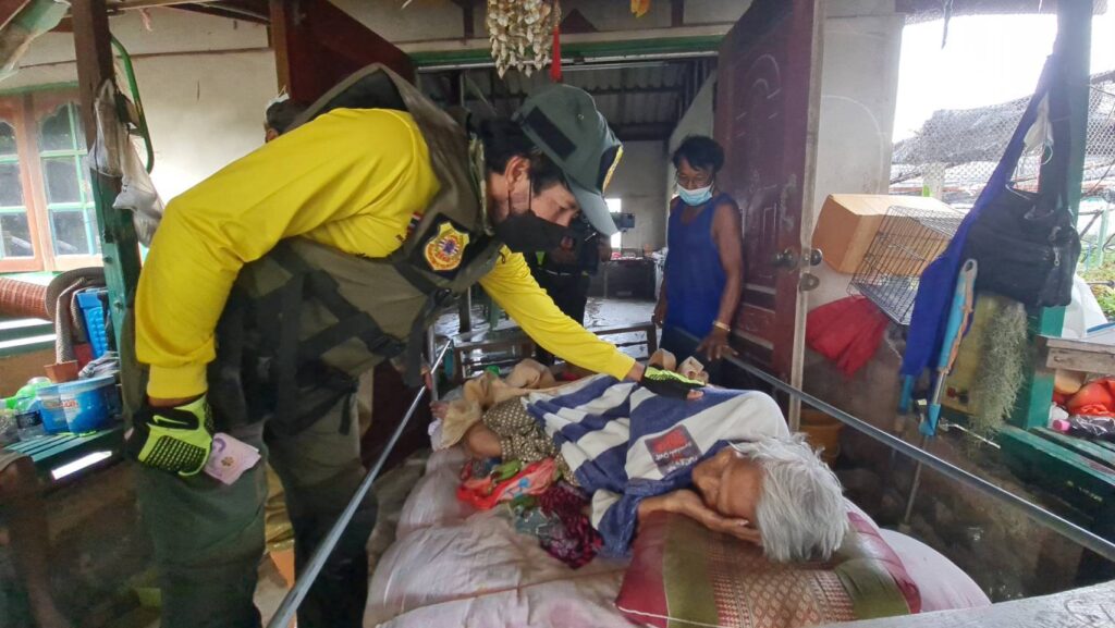 มี ท่านผู้ใหญ่บ้าน ผู้นำท้องถิ่น ร่วมลงพื้นที่เข้าไปส่งกำลังใจ มอบสิ่งของให้ถึงหน้าบ้าน