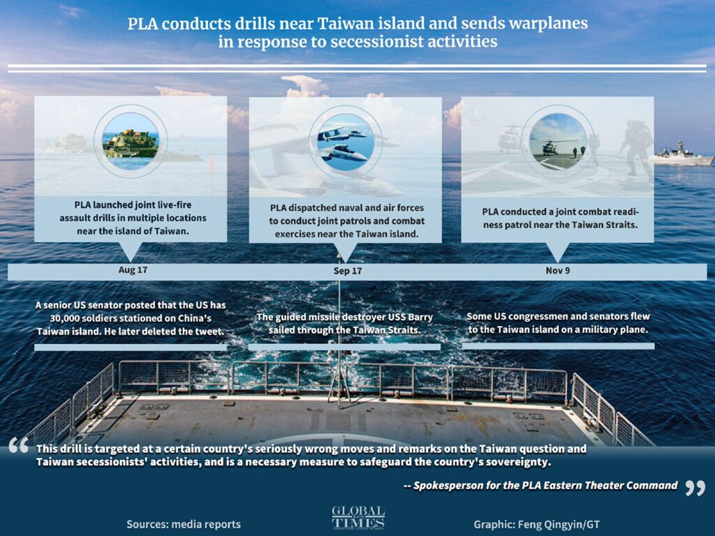 โฆษกกองบัญชาการกองทัพภาคตะวันออกของกองทัพปลดปล่อยประชาชนจีน (PLA) แถลงเมื่อวันอังคารที่ 9 พ.ย.64 ว่า กองบัญชาการกองทัพภาคตะวันออกของ (PLA) และกระทรวงกลาโหมของจีนได้ออกมาตรการรับมือและคำเตือนทางด้านทหารอย่างต่อเนื่อง รวมทั้งมีการลาดตระเวนเตรียมพร้อมรบใกล้ช่องแคบไต้หวันเพื่อตอบโต้ต่อกิจกรรมการแบ่งแยกดินแดน อันเป็นมาตรการที่จำเป็นในการปกป้องอธิปไตยของประเทศ หลังจากที่สื่อรายงานว่า วุฒิสมาชิกสหรัฐฯบางคนบินไปยังเกาะไต้หวันด้วยเครื่องบินทหาร ทั้งนี้ เนื่องจากจีนถือว่าเกาะไต้หวันเป็นส่วนหนึ่งของดินแดนจีนที่แบ่งแยกไม่ได้