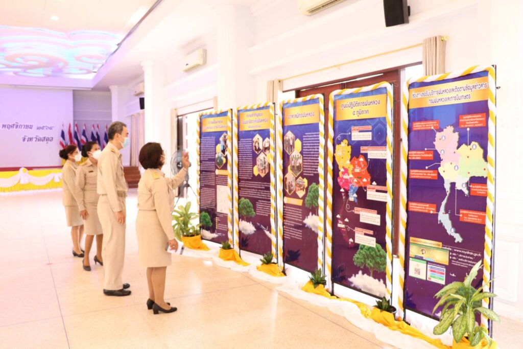 โอกาสนี้ เกษตรและสหกรณ์จังหวัดสตูล นำประธานในพิธีและผู้เข้าร่วม เดินชมนิทรรศการโครงการพระราชดำริ “ฝนหลวง” ที่แสดงถึงพระอัจฉริยภาพของพระบาทสมเด็จพระบรมชนกาธิเบศร มหาภูมิพลอดุลยเดชมหาราช บรมนาถบพิตร ทรงค้นคว้าวิจัยร่วมกับคณะ จนสามารถนำฝนจากบนฟากฟ้าให้ตกลงสู่ผืนแผ่นดินให้พ้นจากภัยแล้ง แก้ปัญหาขาดแคลนน้ำ เปรียบดั่งสายฝนแห่งน้ำพระราชหฤทัยที่พระองค์ทรงห่วงใยในความเป็นอยู่ของราษฎร และจากมติคณะรัฐมนตรี เมื่อวันที่ 20 สิงหาคม 2545 เห็นชอบการเฉลิมพระเกียรติ พระบาทสมเด็จพระบรมชนกาธิเบศร มหาภูมิพลอดุลยเดชมหาราช บรมนาถบพิตร ในฐานะทรงเป็นพระบิดาแห่งฝนหลวง และกำหนดให้วันที่ 14 พฤศจิกายนของทุกปี เป็น “วันพระบิดาแห่งฝนหลวง” ซึ่งปีนี้ถือเป็นปีที่ 66 นับจากวันที่ พระบาทสมเด็จพระบรมชนกาธิเบศร มหาภูมิพลอดุลยเดชมหาราช บรมนาถบพิตร ทรงมีพระราชดำริริเริ่มโครงการฝนหลวงขึ้นในประเทศไทย เมื่อปี พ.ศ.2498 ช่วยขจัดทุกข์จากความแห้งแล้งให้แก่พสกนิกรชาวไทย สร้างความชุ่มฉ่ำทั่วแผ่นดินจวบจนปัจจุบัน