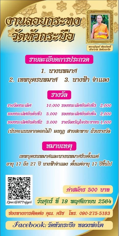 ดร.พระครูวิบูลพัฒนกิตติ์ (สละ กตปุญโญ) เจ้าอาวาสวัดหัวกระบือ กล่าวว่า ประเพณีไทยกับพุทธศาสนามักจะเคียงคู่มาด้วยกันเสมอ เนื่องจากวัดจะเป็นศูนย์รวมจิตใจและศูนย์กลางในการกิจกรรมต่าง ๆ อย่างงานประเพณีลอยกระทงก็มักจะจัดกันในวัดซึ่งมีการทำบุญด้วย เพราะเป็นวันที่ตรงกับวันพระพอดี อย่างที่วัดหัวกระบือ ในวันศุกร์ที่ ๑๙ พฤศจิกายนนี้ ช่วงเช้ามีพิธีทอดกฐินประจำปี ส่วนช่วงเย็นถึงค่ำมีกิจกรรมวันลอยกระทง ใช้ชื่องานว่า “สืบสานประเพณีวัฒนธรรมทางสายน้ำ ลอยกระทง ๒๕๖๔” ซึ่งนอกจากได้ลอยกระทงใน ๒ ฝั่งคลอง ไหว้พระและทำบุญต่าง ๆ เช่น ไถ่ชีวิตโคกระบือ เป็นต้น ยังมีสีสันของงานคือการประกวด ๕ ประเภทคือ หนูน้อยนพมาศ,นางนพมาศ,เทพบุตรนพมาศ,นางนพมาศจำแลง และการประกวดกระทงจากวัสดุธรรมชาติ ประจำปี ๒๕๖๔ รวมรางวัลมูลค่ากว่า ๑ แสนบาท