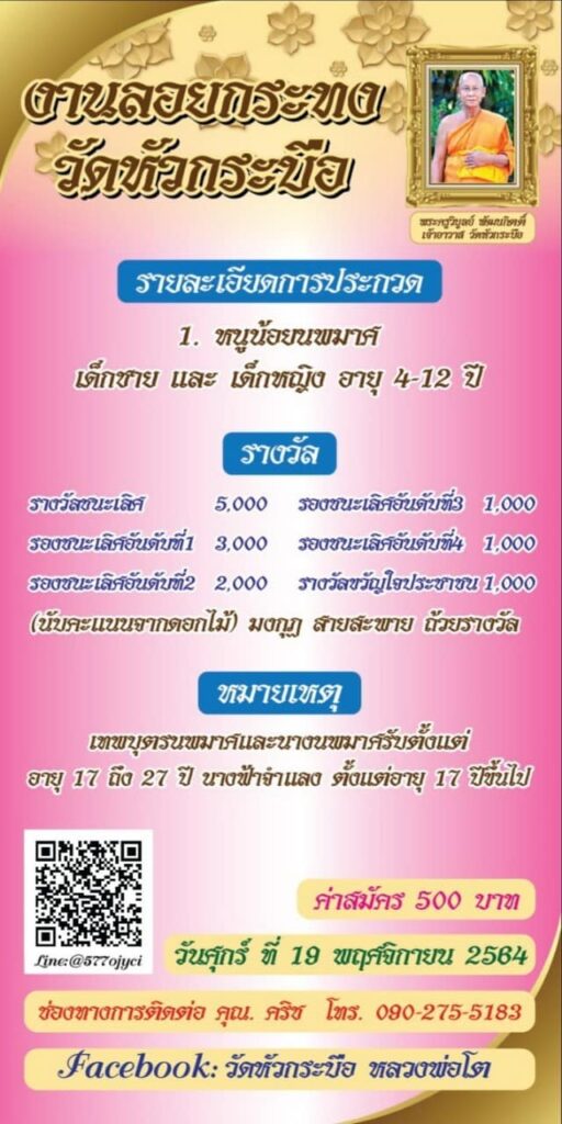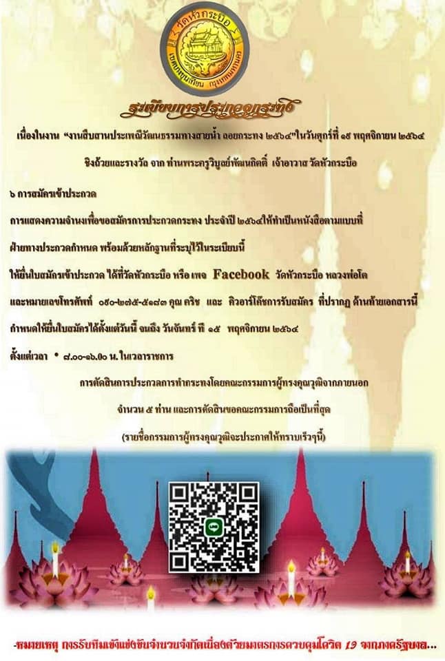 หนึ่งในประเพณีไทยที่สืบสานกันมาตราบชั่วหลานชั่วหลาน และเป็นที่โด่งดังไปทั่วโลกนั่นคือ “วันลอยกระทง” ซึ่งทั่วประเทศต่างพร้อมใจกันจัดงานขึ้นเป็นประจำทุกปี ในวันขึ้น ๑๕ ค่ำ เดือน ๑๒ หรือที่เรียกกันติดปากว่า “วันเพ็ญเดือนสิบสอง” ในปีนี้ตรงกับวันศุกร์ที่ ๑๙ เดือนพฤศจิกายน ๒๕๖๔ โดยหนึ่งในสถานที่จัดงานวันลอยกระทงที่จัดกันมาอย่างต่อเนื่องเป็นประจำทุกปีนั่นคือ “วัดหัวกระบือ” ตั้งอยู่ริมคลองหัวกระบือ ในแขวงท่าข้าม เขตบางขุนเทียน กรุงเทพมหานคร