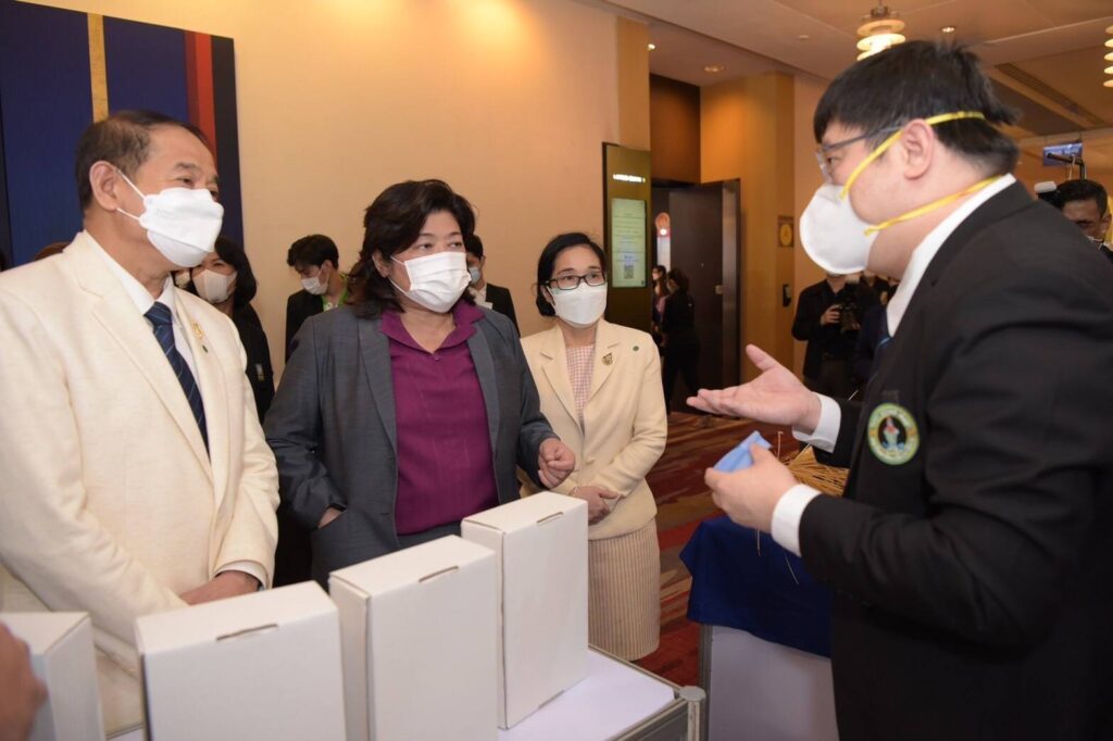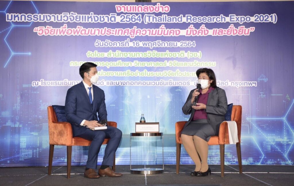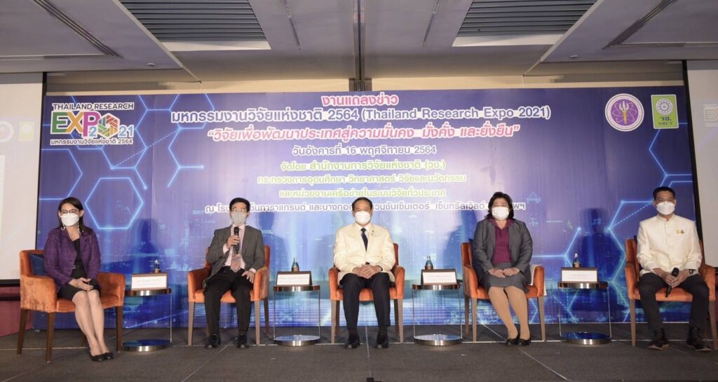 วันที่ 16 พฤศจิกายน 2564 : สำนักงานการวิจัยแห่งชาติ (วช.) กระทรวงการอุดมศึกษา วิทยาศาสตร์ วิจัยและนวัตกรรม (อว.) ร่วมกับหน่วยงานเครือข่ายระบบวิจัยทั่วประเทศ แถลงข่าวจัดงาน “มหกรรมงานวิจัยแห่งชาติ 2564 (Thailand Research Expo 2021)” ครั้งที่ 16 ซึ่งจะจัดขึ้นระหว่างวันที่ 22 – 26 พฤศจิกายน 2564 ณ โรงแรมเซ็นทาราแกรนด์ และบางกอกคอนเวนชันเซ็นเตอร์ เซ็นทรัลเวิลด์ ภายใต้คอนเซ็ปต์หลัก “วิจัยเพื่อพัฒนาประเทศสู่ความมั่นคง มั่งคั่ง และยั่งยืน” เพื่อเป็นเวทีสำคัญในการสร้างเครือข่ายการวิจัยของไทยที่มีศักยภาพ ไปสู่กลุ่มผู้ใช้ประโยชน์ทั้งในระดับประเทศและนานาชาติ กระจายโอกาสในการเข้าถึงฐานข้อมูลความรู้การวิจัยและนวัตกรรม พร้อมเปิดตัวทูตวิจัย “เพื่อน คณิณ” ตัวแทนพลังคนรุ่นใหม่