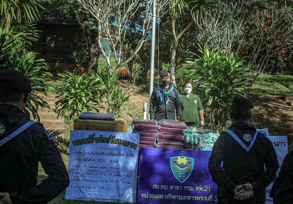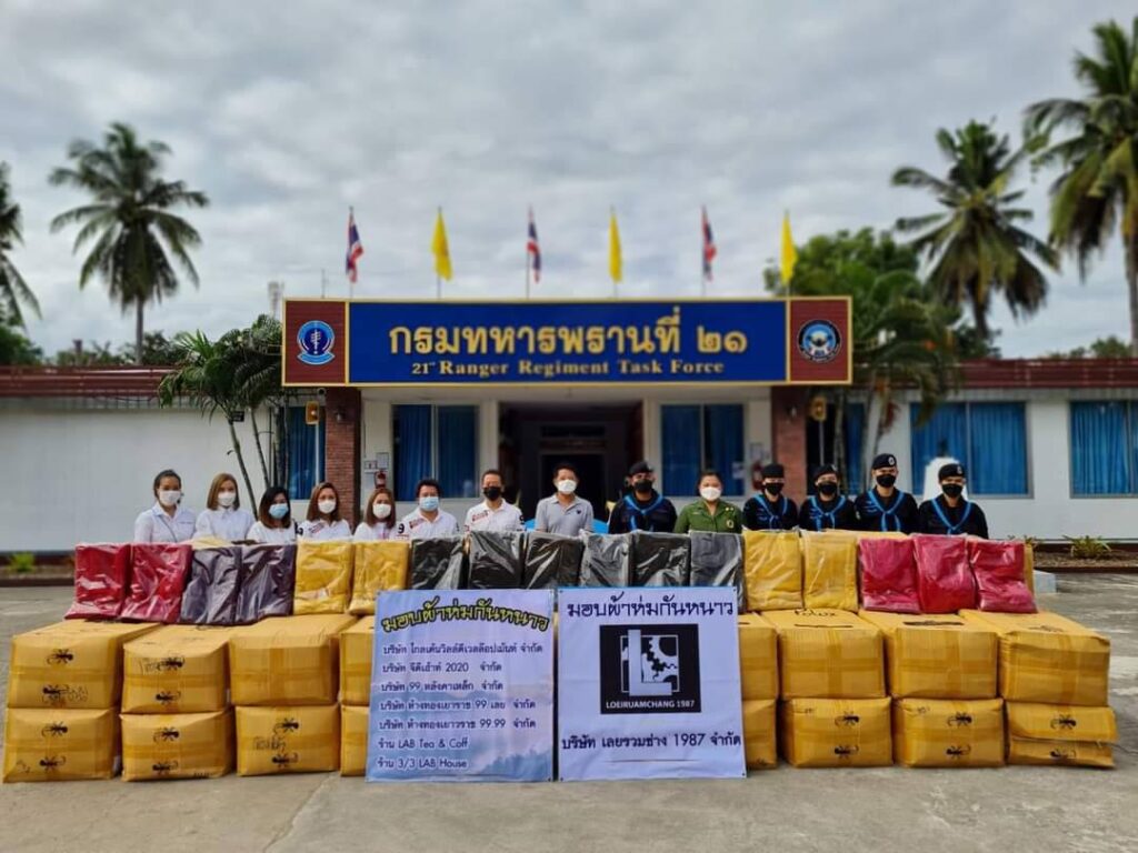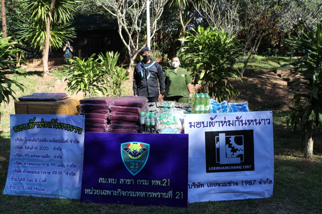 __เมื่อวันที่ 18 พฤศจิกายน 2564 ที่กรมทหารพรานที่ 21 ค่ายศรีสองรัก ตำบลศรีสองรัก อำเภอเมือง จังหวัดเลย ผู้สื่อข่าวรายงานว่า พันเอก อุทัย นิลเนตร ผู้บังคับการกรมทหารพรานที่ 21/ผู้บังคับหน่วยเฉพาะกิจกรมทหารพรานที่ 21 และคุณสิริกัญญา นิลเนตร ประธานสมาคมแม่บ้านทหารบก สาขา กรมทหารพรานที่ 21 จึงได้เล็งเห็นความสำคัญของการมอบผ้าห่มต้านภัยหนาว แทนความอบอุ่น คลายความกังวล ให้กับประชาชนและกำลังชายแดนแม่น้ำโขง จึงได้จับมือกับ 7 บริษัทเอกชนในพื้นที่จังหวัดเลย เป็นบริษัทเอกชนโมลเดลต้นแบบแห่งการสร้างสังคมแห่งการให้และแบ่งปันบนผืนแผ่นดินไทย นำทีมโดย บริษัท เลยรวมช่าง(1987) จำกัด,บริษัท โกลเด้นวิลล์ดีเวลล๊อปเม้นท์จำกัด,บริษัท จีดีเฮ้าท์ 2020 จำกัด,บริษัท 99 หลังคาเหล็ก จำกัด,บริษัทห้างทองเยาราช 99 เลย จำกัด,บริษัทห้างทองเยาวราช 99.99 จำกัด และ LAB Tea&Coff 3/3LAB House รับมอบผ้าห่ม จำนวน 450 ผืน เพื่อการแจกผ้าห่มให้กับกำลังพลที่ปฏิบัติงานตามพื้นที่ชายแดน และมอบให้ประชาชนที่ขาดแคลนผ้าห่มในพื้นที่ชายแดนของ 5 จังหวัด ได้แก่ จังหวัดเลย, จังหวัดหนองคาย, จังหวัดบึงกาฬ, จังหวัดนครพนม และจังหวัดมุกดาหาร พื้นที่รับผิดชอบจำนวน 804 กิโลเมตร เป็นการแสดงน้ำใจเพื่อสร้างสังคมแห่งการให้และแบ่งปัน ผ้าห่ม คือ ความอบอุ่นที่มอบให้การมอบให้อีก 1 ผืน คือ เพิ่มความอบอุ่นให้อีก 1 ชั้น เมื่อผู้รับได้รับผ้าห่มผืนใหม่ สิ่งที่เกิดขึ้นคือรอยยิ้ม สิ่งที่เขาได้รับนอกจากจะเป็นผ้าดีๆที่ให้ความอบอุ่น เขายังสัมผัสได้ถึงความรักของนักธุรกิจ 7 บริษัทเอกชนในจังหวัดเลย ที่เดินทางนำมามอบให้เขาผ่านทางกรมทหารพรานที่ 21 ด้วยความห่วงใย สิ่งนี้ เป็นความรู้สึกอบอุ่นทางใจ สัมผัสได้ทางกาย อบอุ่นอยู่เสมอ ซึ้งในน้ำใจของผู้ให้ ส่วนผู้ให้ก็อิ่มใจ สุขใจ ที่ได้แจกผ้าห่มเช่นกัน เป็นเหมือนหน้าที่จากส่วนลึกในใจ ที่จะดูแลซึ่งกันและกัน ไม่ทอดทิ้งคนใดคนหนึ่งให้หนาวเย็น เป็นความอบอุ่นจากหัวใจที่มอบให้แก่กันเรื่อยมา ให้ผ่านวันคืนที่หนาวเย็นไปได้