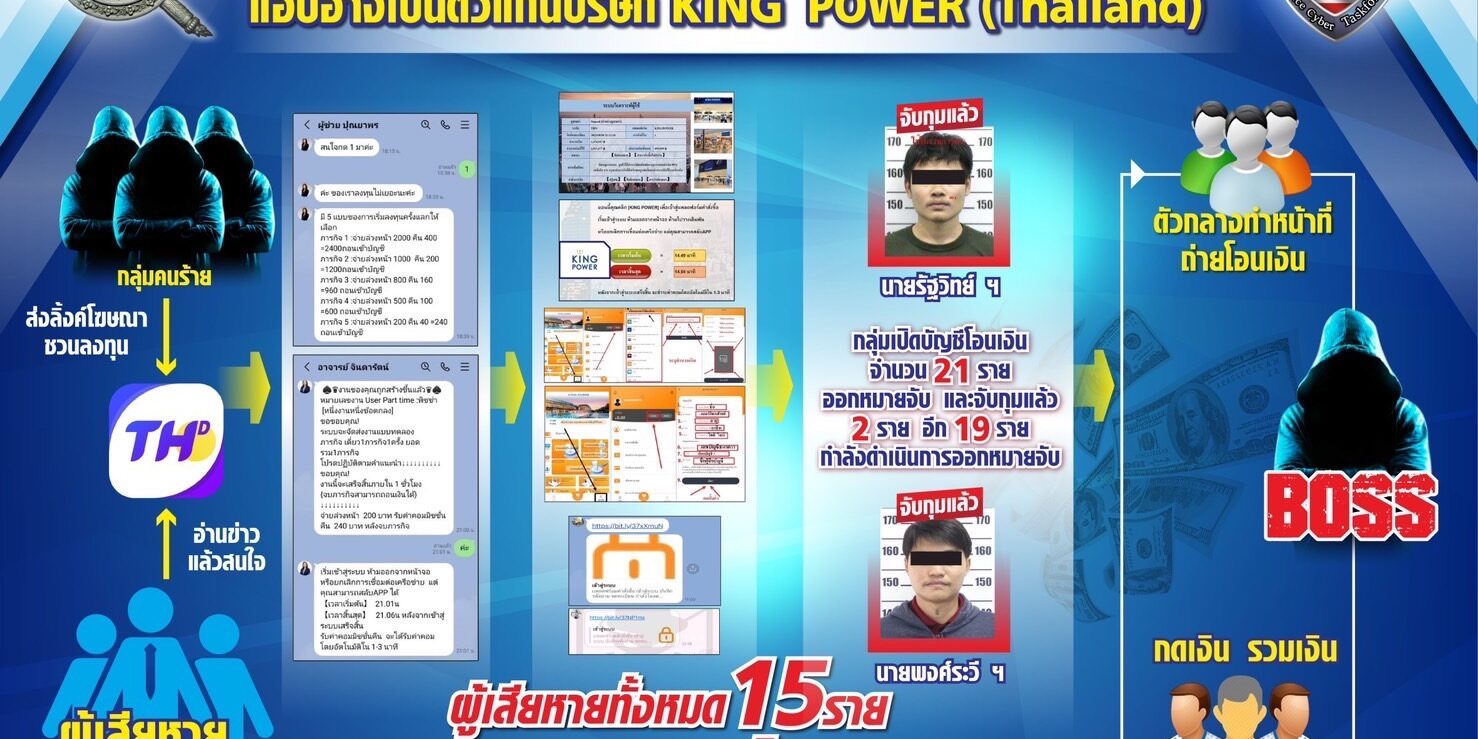 พล.ต.อ.ดำรงศักดิ์ฯ เปิดเผยว่า มีกลุ่มคนร้ายได้หลอกลวงผู้เสียหายให้ร่วมลงทุนหาค่าคอมมิชชั่นผ่านแอพพลิเคชั่นไทยเดลี่ เป็นโฆษณาเชิญชวนเมื่อสนใจกดเข้าไปดูจะส่งลิ้งให้เข้าไปที่กลุ่มLine open chatโดยคนร้ายได้ใช้ชื่อบัญชีแสดงคนเป็นบุคคลมีชื่อเสียง อ้างเป็นตัวแทนฝ่ายบริการจาก KING POWER (THAILAND) ชักชวนให้ลงทุนสั่งซื้อสินค้าออนไลน์จนผู้เสียหายหลงเชื่อร่วมลงทุนผ่านแอพออนไลน์ ซึ่งบริษัทการันตีผลตอบแทนกำไรจากกองทุน 20-30% ของการลงทุนทุกครั้ง โดยใช้เงินลงทุนต่ำและได้รับผลกำไรสูงในระยะเวลาอันสั้น มูลค่าความสียหายรวมกว่า 10 ล้านบาท เจ้าหน้าที่ตำรวจ PCT ได้สืบสวนจนสามารถขออนุมัติหมายจับและจับกุมผู้ต้องหาจำนวน 2 ราย คือ นายรัฐวิทย์ และ นายพงศ์ระวี สงวนนามสกุล ในข้อหา “ร่วมกันฉ้อโกงประชาชนโดยแสดงตนเป็นบุคคลอื่น,นำเข้าสู่ระบบคอมพิวเตอร์ซึ่งข้อมูลคอมพิวเตอร์ที่ปลอมไม่ว่าทั้งหมดหรือบางส่วน หรือข้อมูลคอมพิวเตอร์อันเป็นเท็จโดยประการที่น่าจะเกิดความเสียหายแก่ประชาชน” และอยู่ระหว่างดำเนินการสืบสวนขยายผลเพิ่มเติมเพื่อออกหมายจับผู้ต้องหาเพิ่มอีก 20 ราย