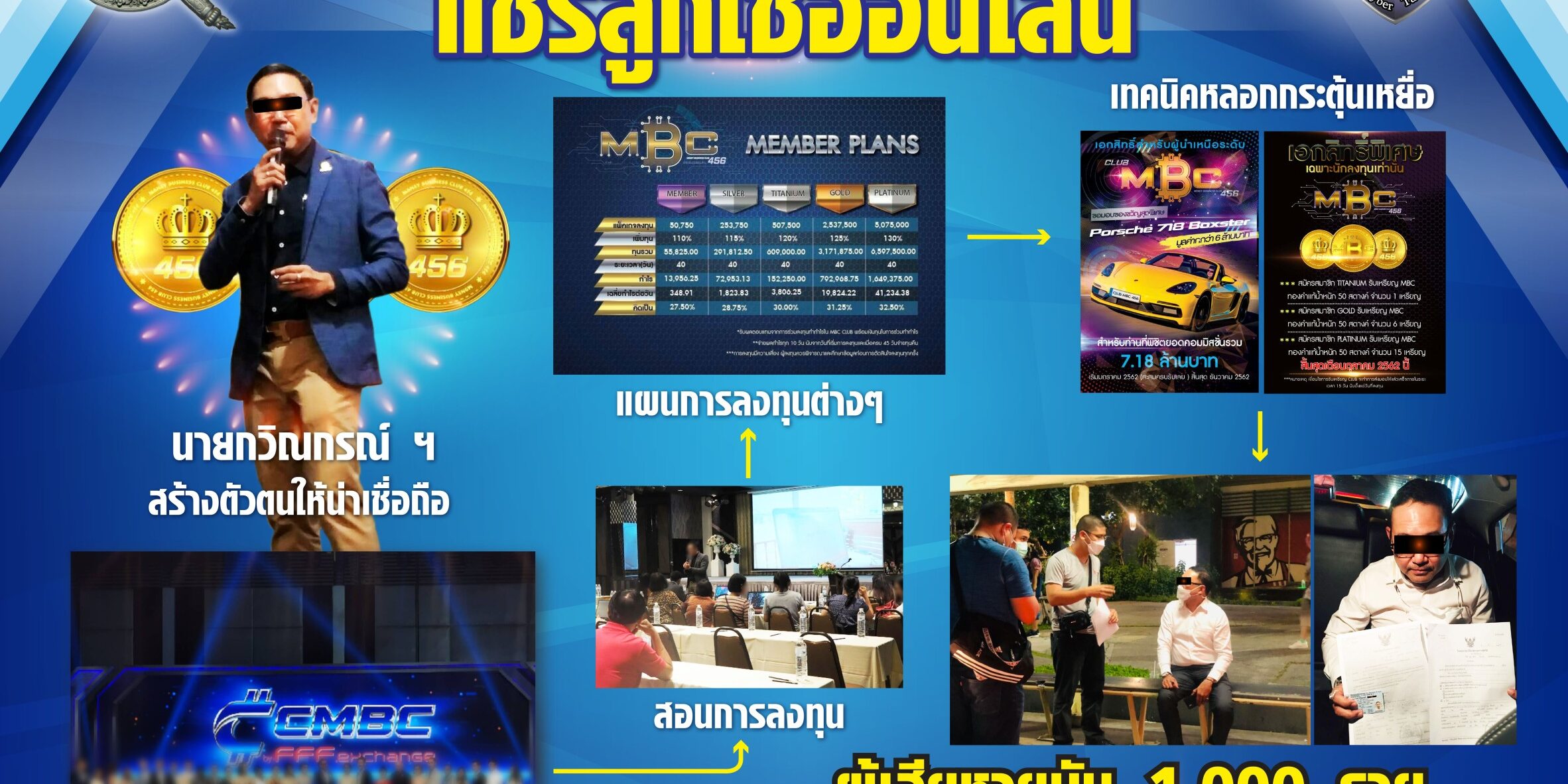พล.ต.อ.ดำรงศักดิ์ฯ เปิดเผยว่า เครือข่าย MBC Club ได้ชักชวนผู้เสียหายให้ร่วมลงทุนใน Forex โดยหลอกลวงว่าจะได้กำไรเฉลี่ย 40% ของเงินที่ลงทุนต่อเดือน และจะนำผลกำไรมาปันผลให้กับผู้ร่วมลงทุน แต่หากลงทุนครบจำนวน 40,000,000 บาท ภายในสิ้นปีจะได้รับรางวัลเป็นรถยนต์เก๋ง ยี่ห้อ Porsche 718 Boxster จากบริษัท ซึ่งการลงทุนดังกล่าวมีแผนการร่วมลงทุน แบ่งเป็น 5 แพ็คเกจ ดังนี้