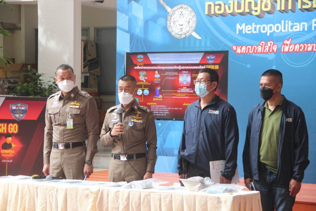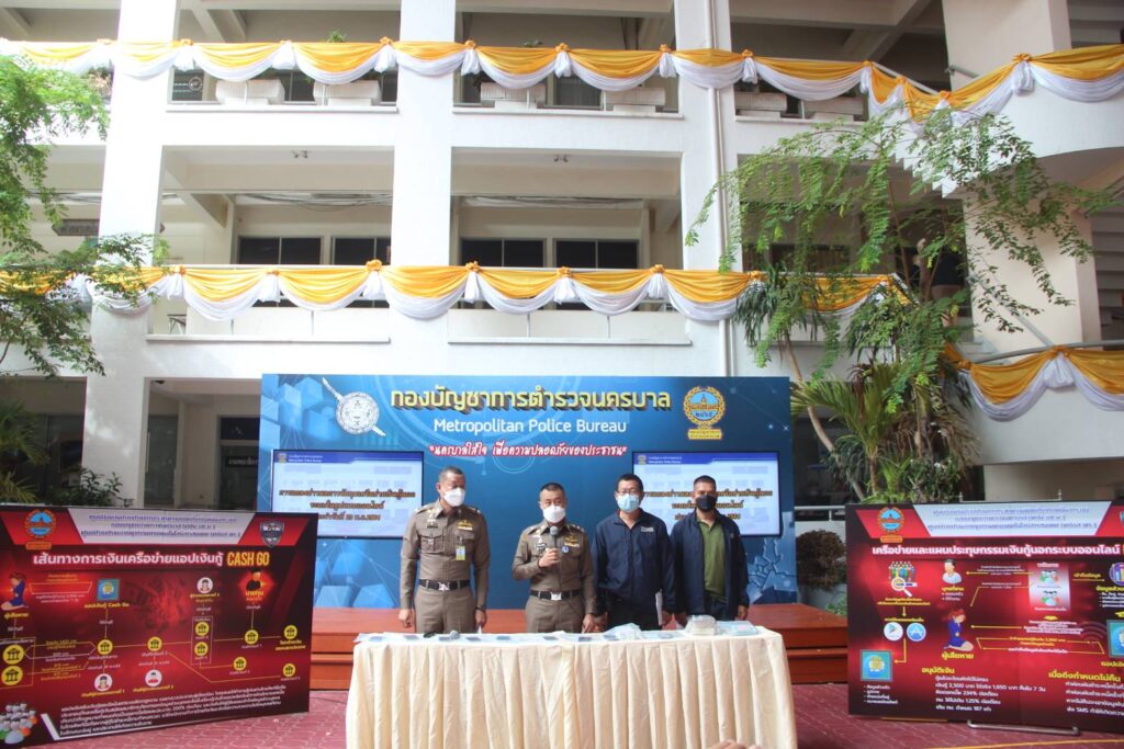 วันที่ 23 พ.ย.64 เวลา 10.30 น.ณ ลานเอนกประสงค์ บช.น. : พล.ต.ท.สำราญ นวลมา ผบช.น.,/ หน.ศปน.บช.น.พร้อมด้วย พล.ต.ต.นิธิธร จินตกานนท์ รอง ผบช.น./รอง หน.ศปน.บช.น.และ พล.ต.ต.นพศิลป์ พูลสวัสดิ์ ผบก.สส.บช.น./เลขา ศปน.บช.น.ได้สั่งการให้ ชุดสืบสวนทำการสืบสวนปราบปรามและจับกุมเครือข่ายแอพพลิเคชั่นเงินกู้นอกระบบกรณีได้รับเรื่องร้องเรียนจากประชาชนว่ามีแอพพลิเคชั่นเงินกู้นอกระบบออนไลน์ ชื่อ “Cash Go” มีการปล่อยเงินกู้ให้กับบุคคลทั่วไปผ่านแอพพลิเคชั่นในโทรศัพท์เคลื่อนที่ และเรียกเก็บดอกเบี้ยในอัตราเกินกว่าที่กฎหมายกำหนด โดยให้ผู้กู้ติดตั้งแอพพลิเคชั่นลงในโทรศัพท์เคลื่อนที่ จากนั้นแอพพลิเคชั่นจะขอเข้าถึงข้อมูลอิเล็กทรอนิกส์ เช่น รูปภาพ,ตำแหน่งการใช้งาน และรายชื่อผู้ติดต่อในโทรศัพท์เคลื่อนที่ และให้ทำการกู้เงินจำนวนหนึ่ง มีระยะเวลากำหนดชำระคืน 7 วัน คิดเป็นอัตราดอกเบี้ย 234 % ต่อเดือน และหากลูกหนี้ไม่ชำระหนี้ภายในกำหนดระยะเวลา ก็จะให้พนักงานโทรศัพท์และส่งข้อความไปยังบุคคลที่สาม ในลักษณะข่มขู่ และประจาน ทำให้ผู้กู้ได้รับความอับอาย และเสียชื่อเสียง ซึ่งมีประชาชนได้รับความเดือดร้อนเสียหายจำนวนมาก จึงได้เร่งทำการสืบสวนจนทราบว่ากลุ่มเครือข่ายดังกล่าวมีผู้ควบคุมดูแลแอพพลิเคชั่นเงินกู้เป็นนายทุนชาวจีน ซึ่งพักอาศัยอยู่คอนโดมิเนียมย่านพระราม 9 จึงได้รวบรวมพยานหลักฐานเพื่อขอหมายค้นต่อศาลอาญา เพื่อเข้าทำการตรวจค้น
