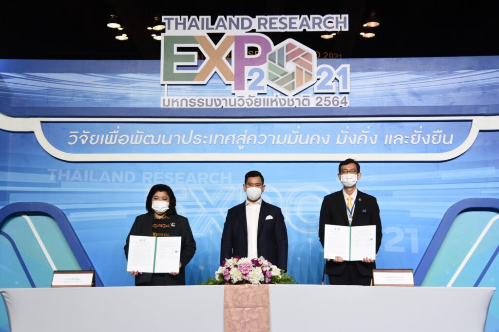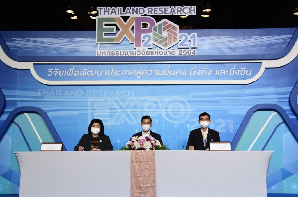 ในงานมหกรรมงานวิจัยแห่งชาติ 2564 (Thailand Research Expo 2021) โรงแรมเซ็นทาราแกรนด์และบางกอกคอนเวนชันเซ็นเตอร์ เซ็นทรัลเวิลด์ กรุงเทพมหานคร โดยมีรองศาสตราจารย์พิเศษ ดร.ดวงฤทธิ์ เบ็ญจาธิกุล ชัยรุ่งเรือง เลขานุการรัฐมนตรีว่าการและโฆษกกระทรวงการอุดมศึกษา วิทยาศาสตร์ วิจัยและนวัตกรรม (อว.) เป็นประธานและสักขีพยาน และกล่าวว่า ในนามตัวแทน อว.ขอบคุณทุกหน่วยงานไม่ว่าจะเป็นภาครัฐหรือเอกชนร่วมมือกัน หลายสิ่งที่หวังว่าจะประสบความสำเร็จเชื่อว่าจะสำเร็จอย่างแน่นอนในการทำงานวิจัยให้ออกมาเป็นประโยชน์กับประชาชนจริงๆด้วยงานวิจัยและนวัตกรรม