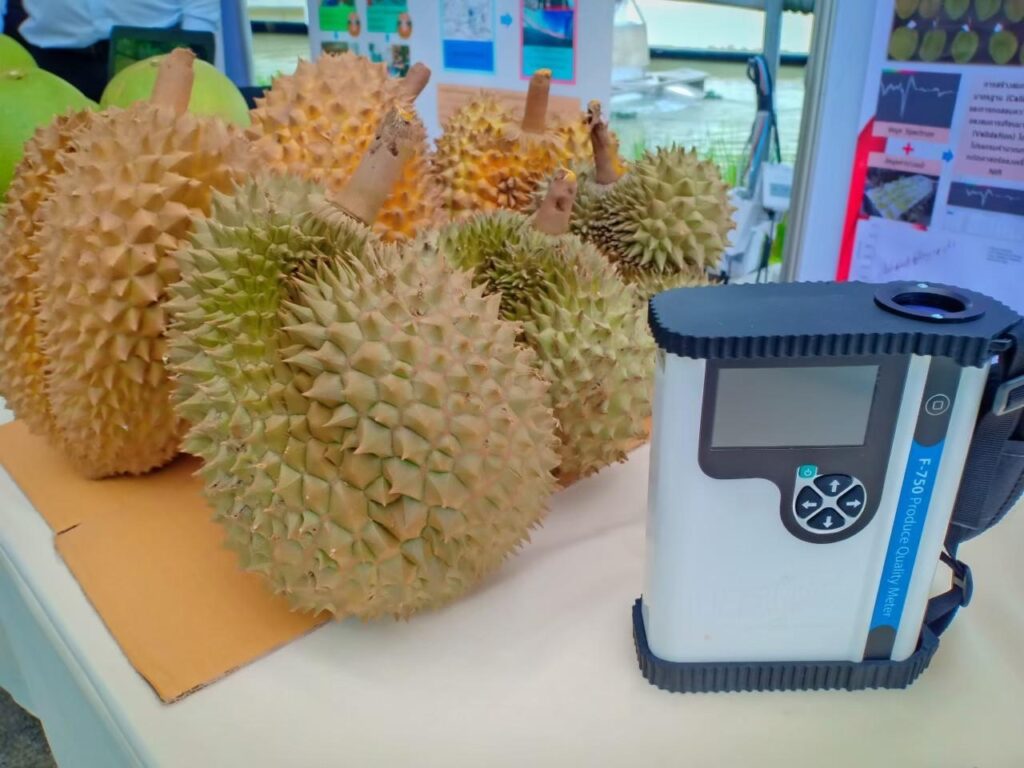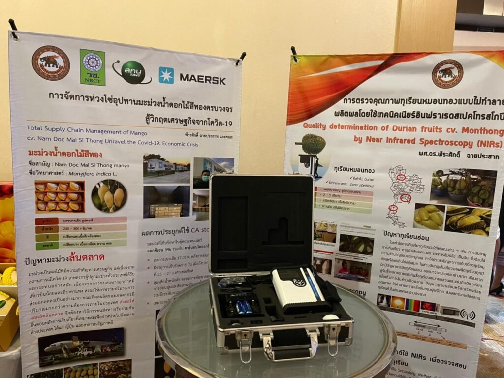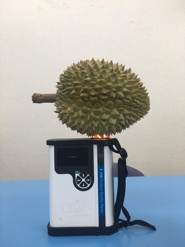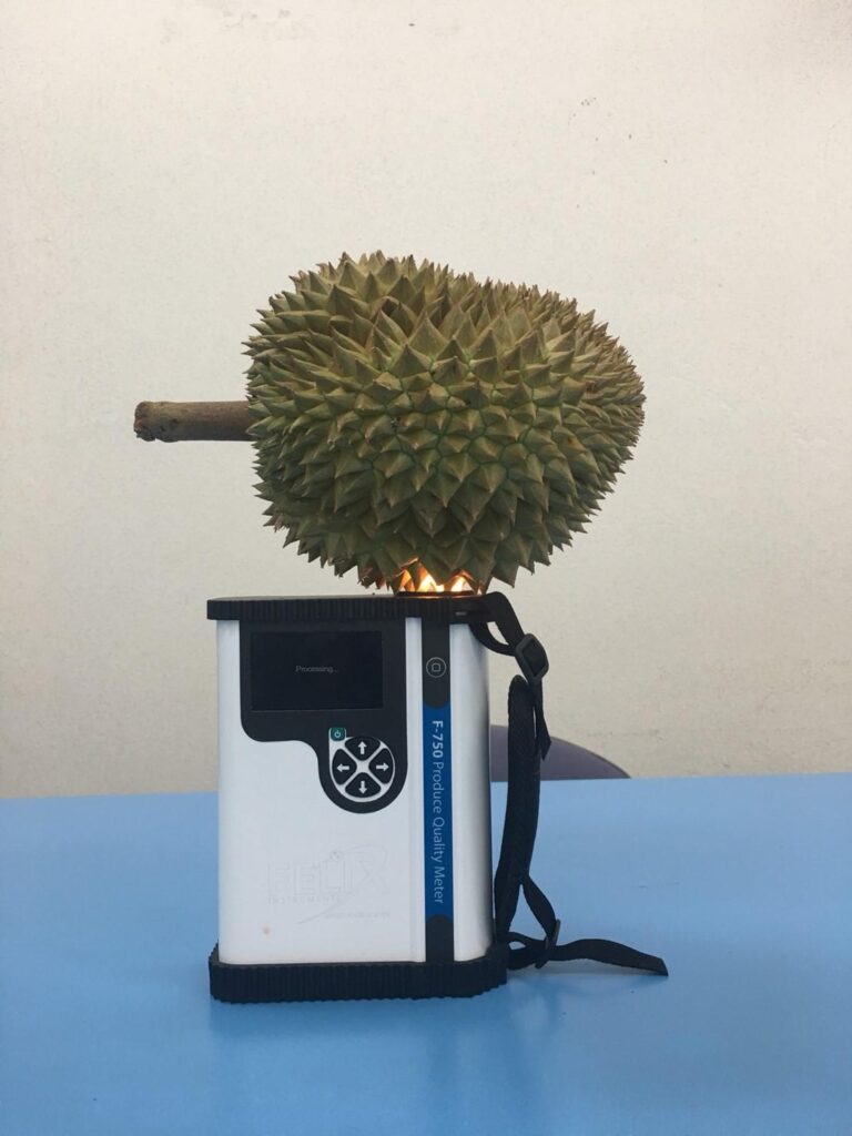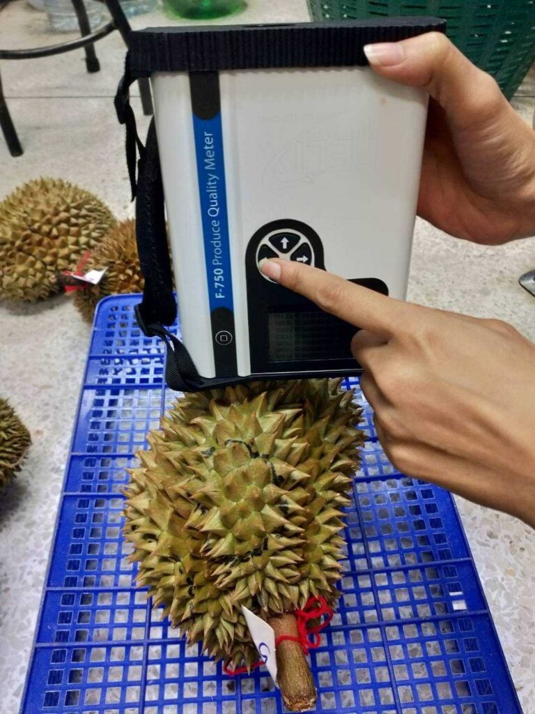 ผลการทดลองสร้างสมการทดสอบและทำนายคุณภาพของทุเรียน โดยใช้เครื่องเนียร์อินฟราเรดสเปคโทรมิเตอร์ (NIR) แบบพกพา (F-750 Produce Quality Meter; Felix Instruments) พบว่า สามารถทำนายความแก่ของทุเรียนได้แม่นยำ 86 เปอร์เซ็น โดยเทียบกับค่าน้ำหนักแห้งของเปลือกทุเรียน หากมีค่ามากกว่า 28 เปอร์เซ็นต์ จะเป็นทุเรียนแก่ จากผลการวิจัยนี้แสดงให้เห็นว่าเครื่อง NIR แบบพกพาสามารถคัดความแก่ทุเรียนหมอนทองได้โดยมีความถูกต้อง แม่นยำ รวดเร็ว และเชื่อถือได้ ประกอบกับลักษณะตัวเครื่องมีขนาดเล็กสามารถเคลื่อนย้ายได้ง่าย จึงเป็นทางเลือกหนึ่งในการใช้ประเมินคุณภาพในแปลงปลูก และสามารถนำมาใช้ในการประกันคุณภาพของทุเรียนก่อนส่งออก ลดปัญหาทุเรียนการจำหน่ายอ่อนหรือทุเรียนด้อยคุณภาพ เพิ่มความเชื่อมั่นของผู้บริโภคทั้งในประเทศและต่างประเทศ
