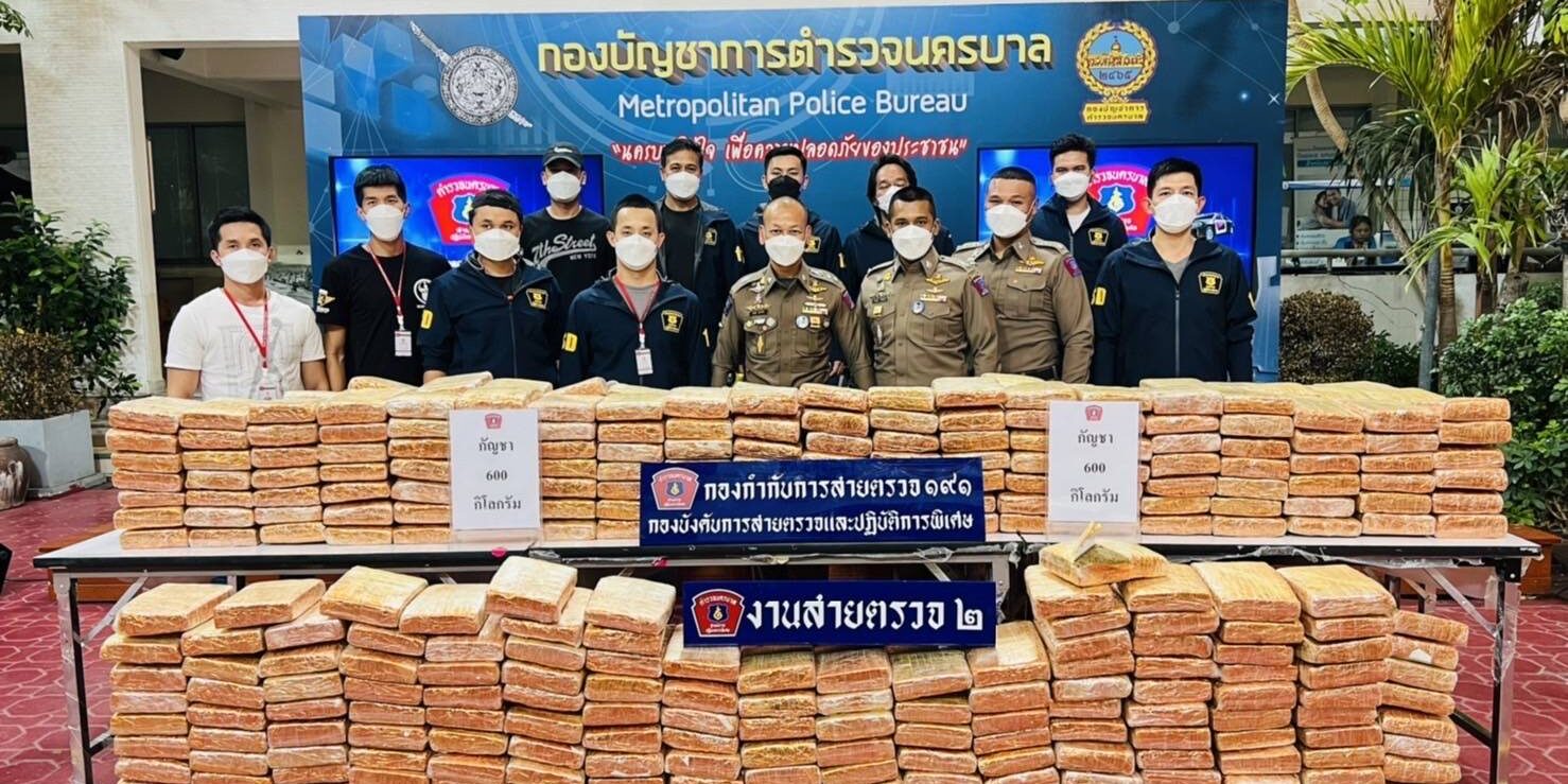 ดังนี้ 1.นายธนาคม ยิ่งสุจริตพันธุ์ อายุ 29 ปี,2.นายกริช จ้อยเจริญ อายุ 30 ปี,3.นายภาคภูมิ พริกบัว อายุ 25 ปี,4.นายชัยวัฒน์ ด๊ะวี อายุ 30 ปี และ 5.นายยงยุทธ์ อิ่มลิ้มธาร อายุ 33 ปี พร้อมด้วยของกลาง กัญชาอัดแท่ง จำนวน 600 ก้อน น้ำหนักประมาณ 600 กิโลกรัม,กล่องส่งพัสดุ จำนวน 2 แพ็ค,เครื่องปริ้นสลิป จำนวน 5 ม้วน,รถยนต์ จำนวน 3 คัน,โทรศัพท์มือถือ จำนวน 3 เครื่อง,อุปกรณ์การแพ็คกัญชาบรรจุกล่องส่งพัสดุไปรษณีย์อีกหลายรายการ โดยกล่าวหาว่า “ร่วมกันมียาเสพติดให้โทษประเภท 5 (กัญชา) ไว้ในครอบครองเพื่อจำหน่าย โดยไม่ได้รับอนุญาต” โดยสามารถจับกุมได้ที่ บ้านเลขที่ 48/15 โครงการบ้านศรีสุข แขวงท่าข้าม เขตบางขุนเทียน กรุงเทพฯ ต่อเนื่องลานจอดรถห้างสรรพสินค้าเทสโก้ โลตัส พระราม 2 ถนนพระราม 2 แขวงแสมดำ เขตบางขุนเทียน กรุงเทพฯ