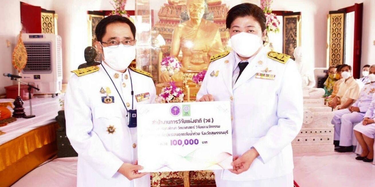 สำนักงานการวิจัยแห่งชาติ (วช.) กระทรวงการอุดมศึกษา วิทยาศาสตร์ วิจัยและนวัตกรรม (อว.) มอบเงินช่วยเหลือแก่ผู้ประสบอุทกภัยในพื้นที่จังหวัดสุพรรณบุรี จำนวน 100,000 บาท โดย ดร.วิภารัตน์ ดีอ่อง ผู้อำนวยการสำนักงานการวิจัยแห่งชาติ เป็นผู้ส่งมอบให้กับ นายนพฤทธิ์ ศิริโกศล รองผู้ว่าราชการจังหวัดสุพรรณบุรี ผู้รับมอบ