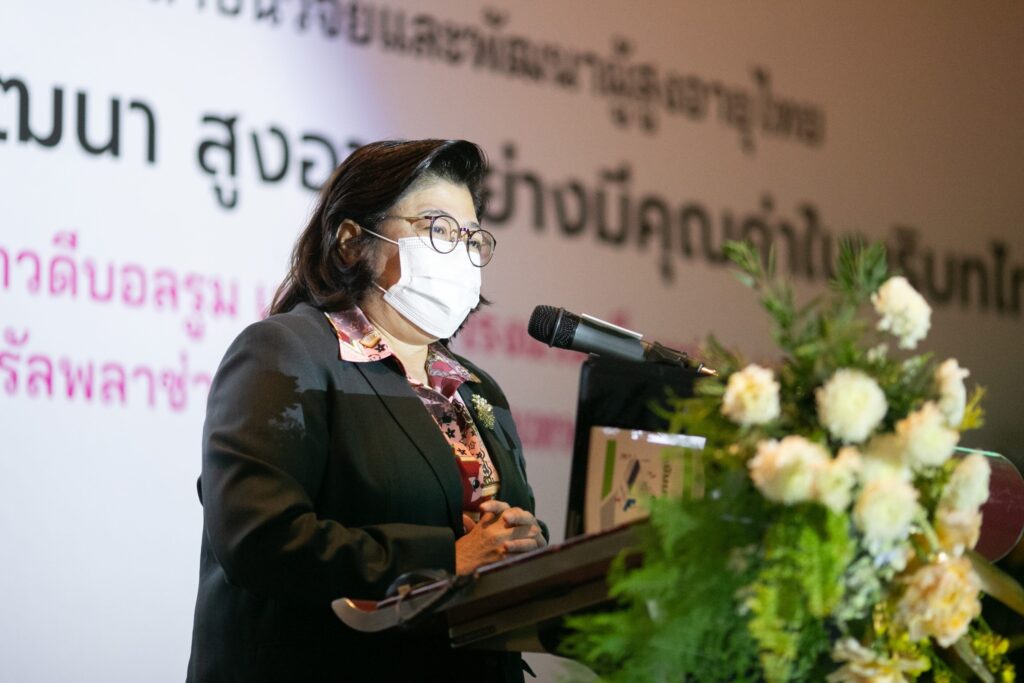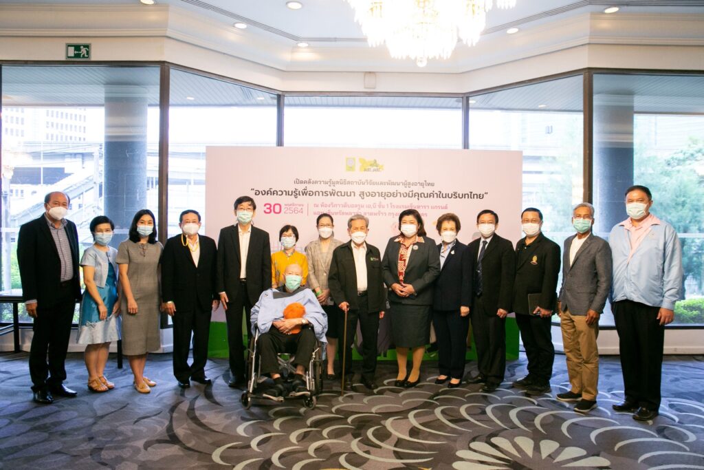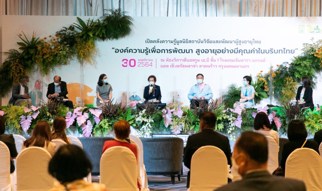 เมื่อวันที่ 30 พฤศจิกายน 2564 ณ โรงแรมเซ็นทารา แกรนด์ แอท เซ็นทรัลพลาซ่า ลาดพร้าว มูลนิธิสถาบันวิจัยและพัฒนาผู้สูงอายุไทย (มส.ผส.) จัดงานนำเสนอผลการวิจัยภายใต้แผนงานยุทธศาสตร์เป้าหมาย (Spearhead) ด้านสังคม โดยการสนับสนุนการสร้างและจัดการองค์ความรู้ จากสำนักงานการวิจัยแห่งชาติ (วช.) เพื่อเผยแพร่ข้อมูลองค์ความรู้ตลอดการดำเนินที่ผ่านมาสู่สาธารณะ ภายใต้แนวคิด “องค์ความรู้เพื่อการพัฒนา สูงอายุอย่างมีคุณค่าในบริบทไทย” เตรียมรองรับการเข้าสู่สังคมสูงอายุอย่างสมบูรณ์ พร้อมเสวนา “คุณภาพชีวิตของผู้สูงอายุไทย : จากการเรียนรู้ร่วมกันสู่นโยบายและภาคปฏิบัติ”เพื่อเปิดพื้นที่แลกเปลี่ยนเรียนรู้การดำเนินงานระหว่างภาคส่วนที่เกี่ยวข้องในการดำเนินงานด้านผู้สูงอายุ ทั้งงานวิชาการ งานนโยบาย และการสร้างองค์ความรู้เชิงประจักษ์ที่เกิดขึ้นจากการทำงานในระดับพื้นที่ รวมถึงการ บรรยายพิเศษ เรื่อง “การขับเคลื่อนและพัฒนาองค์ความรู้ เพื่อสนับสนุนคุณภาพชีวิตผู้สูงอายุ” จาก ดร.วิภารัตน์ ดีอ่อง ผู้อำนวยการสำนักงานการวิจัยแห่งชาติ และการปาฐกถาพิเศษ เรื่อง “ประเทศไทยต้องเดินแบบไหน ถึงจะใช้ชีวิตสูงวัยได้อย่างมีคุณภาพ” จากศาสตราจารย์เกียรติคุณ นายแพทย์ ประเวศ วะสี นอกจากนี้ ยังมีกิจกรรมภาคปฏิบัติซึ่งเป็นกิจกรรมส่งเสริมพฤฒพลังสำหรับผู้สูงอายุ ที่มาร่วมงานในวันนี้ด้วย โดยมี นพ.สมศักดิ์ ชุณหรัศมิ์ ประธานมูลนิธิสถาบันวิจัยและพัฒนาผู้สูงอายุไทย เป็นประธานในพิธีเปิด พร้อมด้วย ผู้ทรงคุณวุฒิ นักวิชาการ นักวิจัย องค์กรเครือข่ายภาคส่วนต่างๆ ที่ดำเนินงานด้านผู้สูงอายุ รวมถึงประชาชนทั่วไป เข้าร่วมงาน