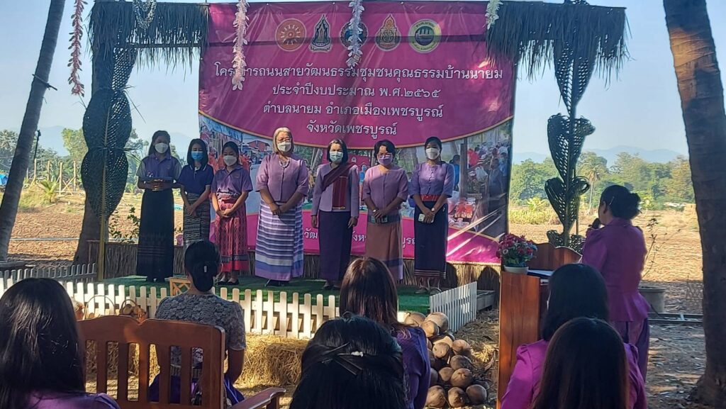 ที่ป่าช้าคาเฟ่ วัดเสาธงทอง เพชรบูรณ์ ตำบลนายม อำเภอเมืองเพชรบูรณ์ จังหวัดเพชรบูรณ์ นางเยาวภา โตสงวน วัฒนธรรมจังหวัดเพชรบูรณ์ เป็นประธานเปิดโครงการถนนสายวัฒนธรรมชุมชนคุณธรรมบ้านนายม มีส่วนราชการ สถานศึกษา ปราชญ์ชาวบ้านและนักท่องเที่ยวร่วมงาน นางสาววิไล หลงใจคอย ผู้อำนวยการโรงเรียนบ้านนายม ในนามของคณะกรรมการดำเนินงานโครงการถนนสายวัฒนธรรมชุมชนคุณธรรมบ้านนายมกล่าวรายงานว่า ถนนสายวัฒนธรรม ตลาดวัฒนธรรม ชุมชนคุณธรรมบ้านนายม มีการขับเคลื่อน การดำเนินงานแบบพลังบวร ประกอบด้วย บ้าน วัด ราชการ โรงเรียนโดยสำนักงานวัฒนธรรมจังหวัดเพชรบูรณ์ องค์การบริหารส่วนตำบลนายม ชุมชนคุณธรรมบ้านนายม ร่วมกับส่วนราชการในพื้นที่ และคณะกรรมการดำเนินงานได้จัดการเสวนาโครงการถนนสายวัฒนธรรมชุมชนคุณธรรมบ้านนายม ขึ้น เมื่อเดือนกุมภาพันธ์ ๒๕๖๔ และจัดกิจกรรมส่งเสริมประเพณีวัฒนธรรมและการท่องเที่ยวในชุมชน โดยมีการเปิดพื้นที่ในการจำหน่ายสินค้าผลิตภัณฑ์ชุมชน โดย พระมหาจักรพันธ์ เมตฺติโก เจ้าคณะตำบลห้วยสะแก เขต ๒ และเจ้าอาวาสวัดเสาธงทอง ได้นำแนวคิดธรรมะจากป่าช้า สร้างรายได้สู่ชุมชน โดยการสร้างเอกลักษณ์ใหม่ จำหน่ายกาแฟเมนูผี และได้เปิดตัว “ตลาดป่าช้า มาร์เก็ต ผลิตภัณฑ์ชุมชน”จนเป็นที่รู้จักอย่างแพร่หลาย และสามารถสร้างรายได้ให้เกิดขึ้นในชุมชน และได้รับเกียรติบัตรของรัฐมนตรีกระทรวงวัฒนธรรม(นายอิทธิพล คุณปลื้ม) ให้เป็นชุมชนต้นแบบเที่ยวชุมชน ยลวิถี จังหวัดเพชรบูรณ์ และได้ต่อยอดการดำเนินงานที่ผ่านมาโดยการจัดกิจกรรมถนนสายวัฒนธรรม ตลาดวัฒนธรรม เพื่อเปิดโอกาสให้ เด็ก เยาวชน และประชาชน มีพื้นที่ในการแลกเปลี่ยนเรียนรู้ด้านวัฒนธรรม