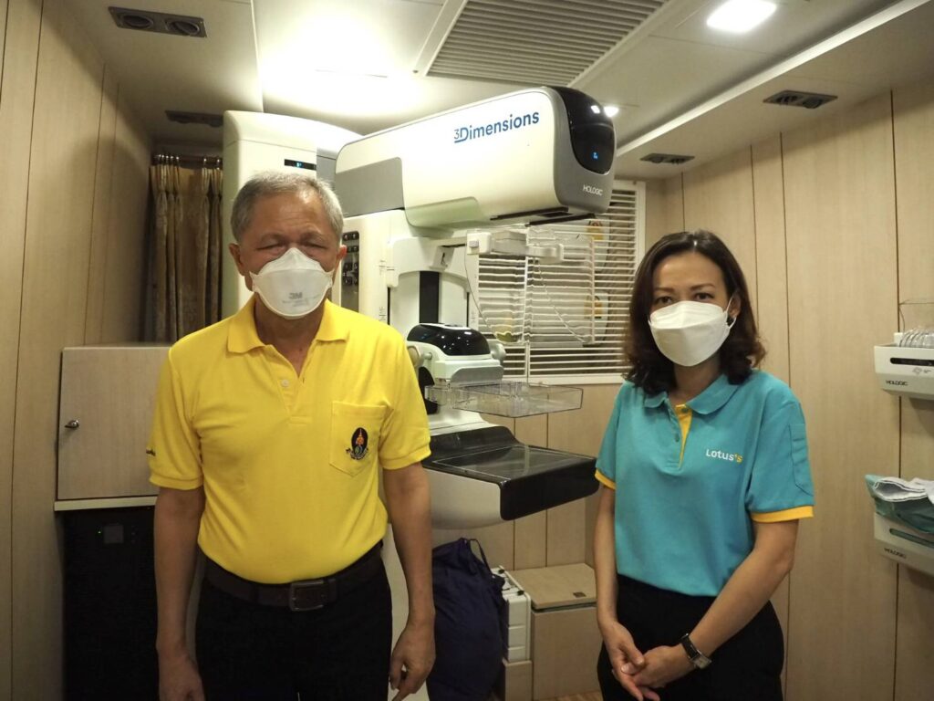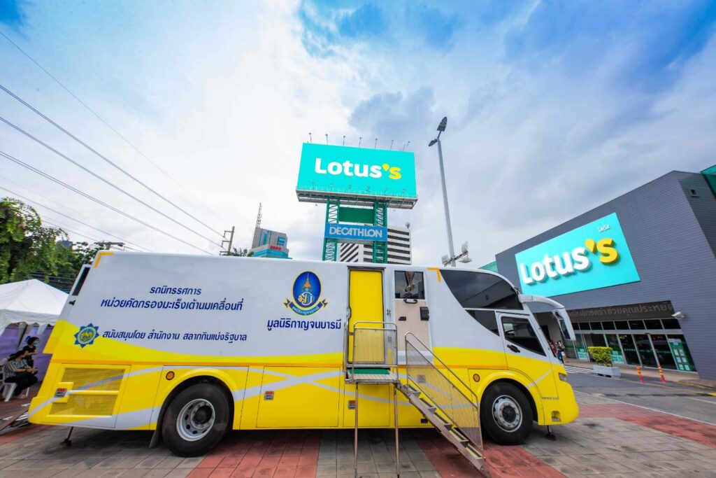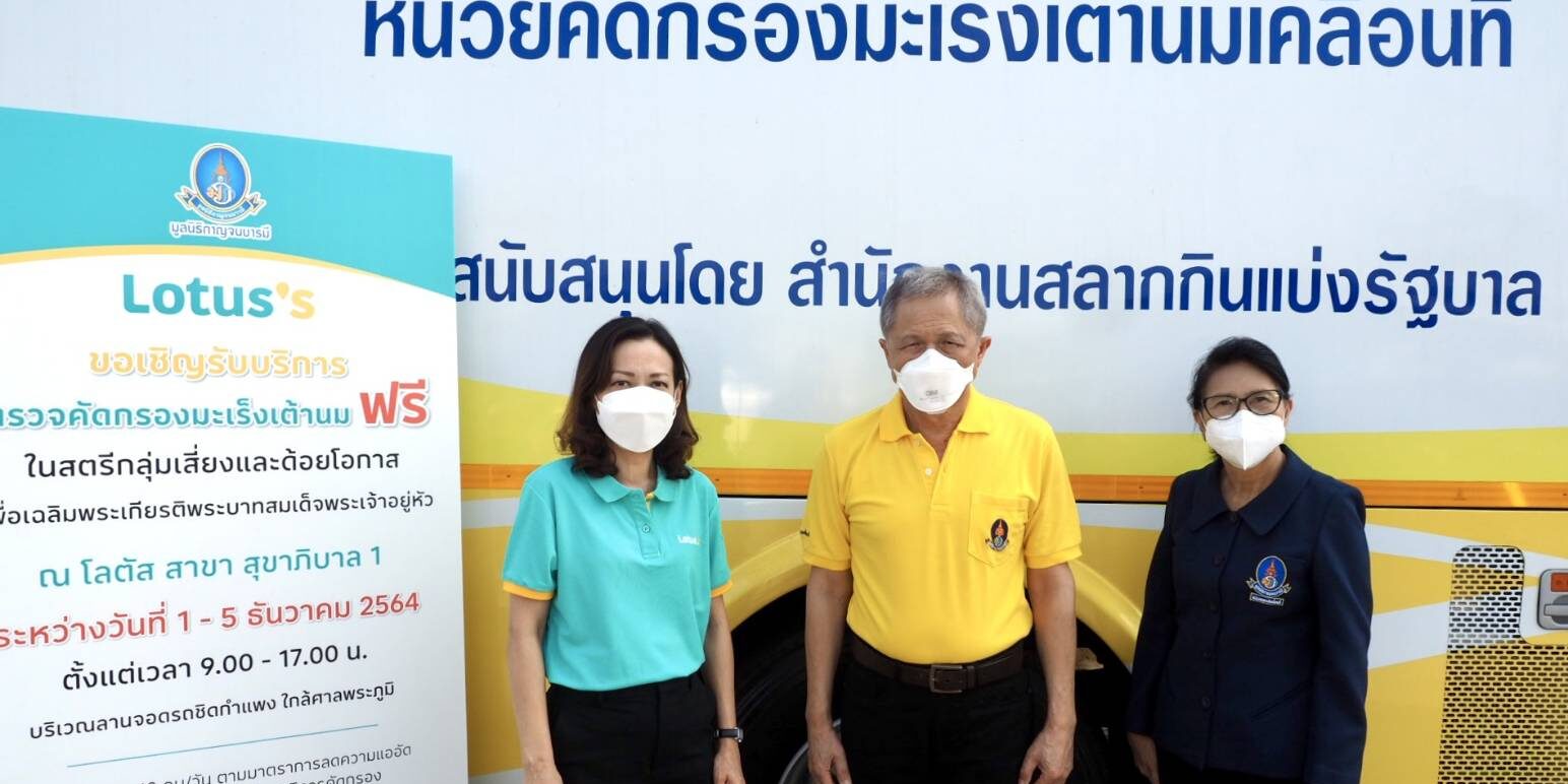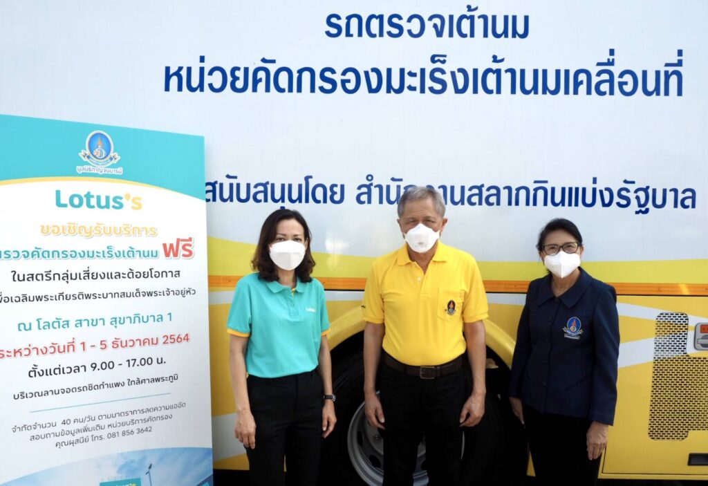 นางสาวสลิลลา สีหพันธุ์ ประธานเจ้าหน้าที่บริหารด้านความยั่งยืนและกฎหมาย ธุรกิจโลตัส ประเทศไทย (ซ้าย) พร้อมด้วย ดร.นพ.สมยศ รัศมี ประธานมูลนิธิกาญจนบารมี (กลาง) และนางภารดี ชาญสมร กรรมการมูลนิธิกาญจนบารมี (ขวา) ร่วมเปิดโครงการ “ตรวจคัดกรองมะเร็งเต้านมด้วยเครื่องแมมโมแกรมเคลื่อนที่ (Mammogram)” เป็นปีที่ 3 ติดต่อกัน โดยโลตัส และมูลนิธิกาญจนบารมี เปิดให้กุล่มผู้มีความเสี่ยง และขาดโอกาส ได้ตรวจคัดกรองมะเร็งเต้านมโดยเครื่องเอกซเรย์เต้านมเคลื่อนที่ (Mammogram) ฟรี พร้อมตรวจคัดกรองเบื้องต้น และให้ความรู้เรื่องการตรวจคัดกรองมะเร็งเต้านมด้วยตนเองสำหรับประชาชนที่ไม่อยู่ในกลุ่มเสี่ยง ส่งเสริมการใส่ใจดูแลสุขภาพให้แก่ลูกค้าและประชาชน ผู้สนใจสามารถเข้ารับการตรวจคัดกรองได้ที่ 4 สาขา ที่ร่วมกิจกรรม โดยไม่ต้องลงทะเบียนล่วงหน้า ตั้งแต่เวลา 09.00 ถึง 17.00 น. ตั้งแต่วันที่ 1 ธันวาคม ถึง 23 ธันวาคมนี้