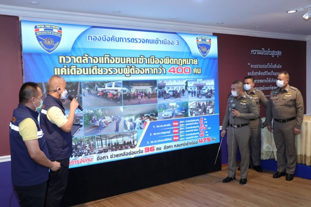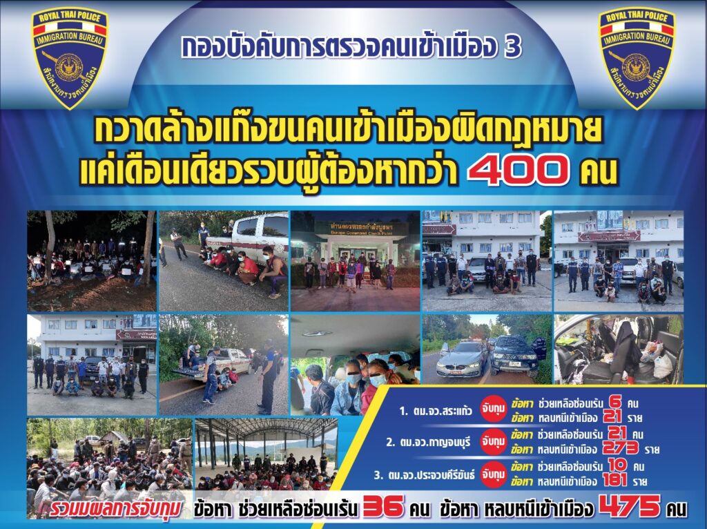 200 คน” สืบเนื่องมาจากในห้วงเดือน พ.ย.64 ที่ผ่านมา บก.ตม.3 มีการระดมกวาดล้างอย่างหนัก โดยเน้นกลุ่มแก๊งลักลอบนำพาแรงงานต่างด้าวผิดกฎหมายเข้ามาในประเทศไทยซึ่งผลการกวาดล้างมีในรายหน่วยงานที่สำคัญ ดังนี้