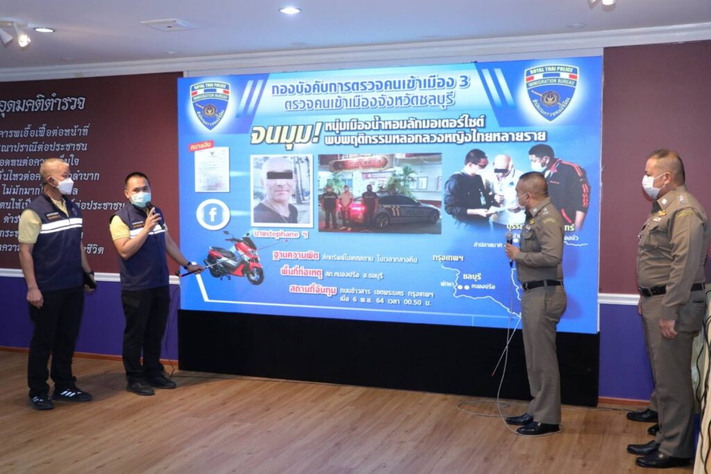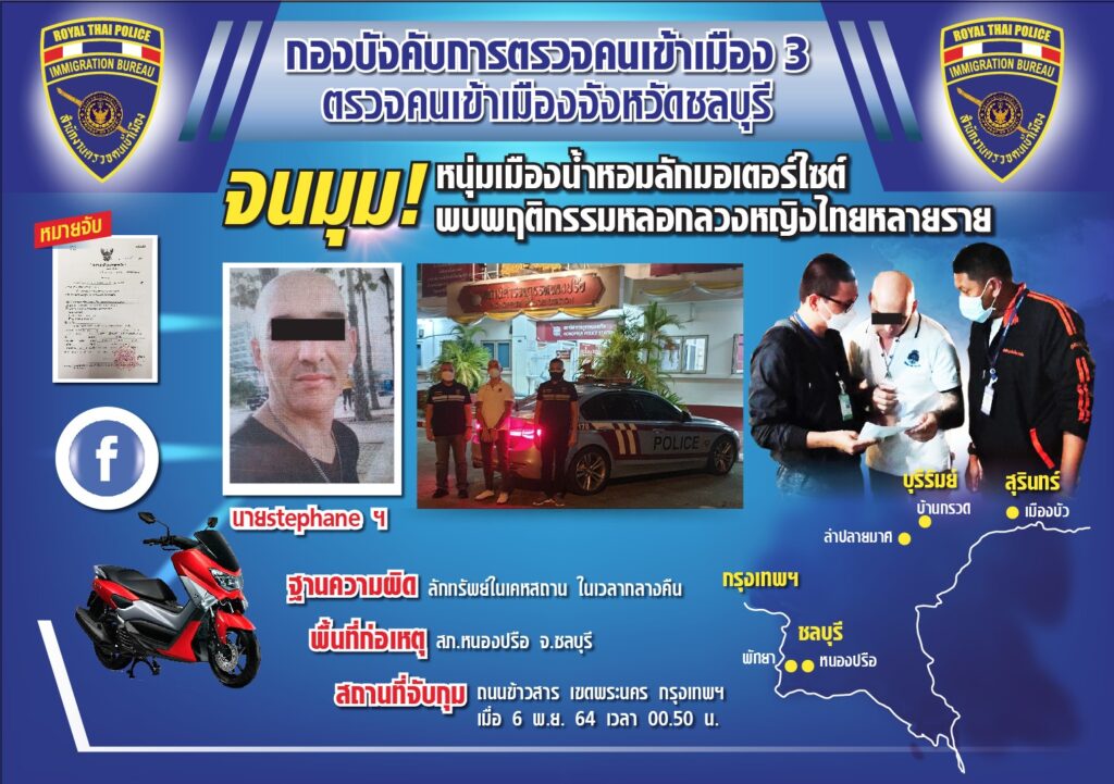 3.“จนมุม! หนุ่มเมืองน้ำหอมลักมอเตอร์ไซค์ พบพฤติกรรมหลอกลวงหญิงไทยหลายราย” กล่าวคือเมื่อประมาณปลายเดือน มิ.ย.64 ตม.จ.ชลบุรี ได้รับการประสานความร่วมมือจาก สภ.หนองปรือ จ.ชลบุรี เพื่อทำการสืบสวนข้อมูลของคนต่างชาติ ด้วยเหตุมีผู้เสียหายแจ้งว่าถูกคนร้ายต่างชาติลักรถจักรยานยนต์ไป เหตุเกิดที่ ต.หนองปรือ อ.บางละมุง จ.ชลบุรี ชุดสืบสวน ตม.จ.ชลบุรี จึงได้ทำการสืบสวนพบว่าคนร้ายรายนี้คือ นายStephane (ขอสงวนสกุล) อายุ 46 ปี สัญชาติฝรั่งเศส เข้ามาตั้งแต่เดือน ต.ค.ปี 2019 ซึ่งเป็นข้อมูลสนับสนุนให้กับ สภ.หนองปรือ ในทางคดีจนมีการออกหมายจับ ศาลจังหวัดพัทยาที่ 278/2564/ ลง 11 ก.ย.64 ฐานความผิดลักทรัพย์ในเคหสถาน ในเวลากลางคืน