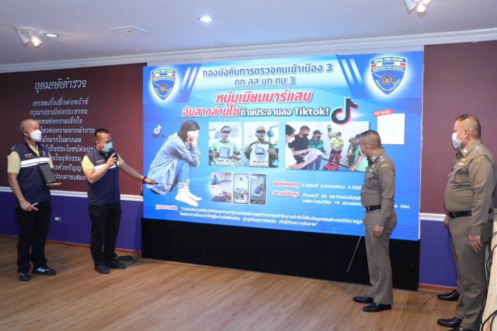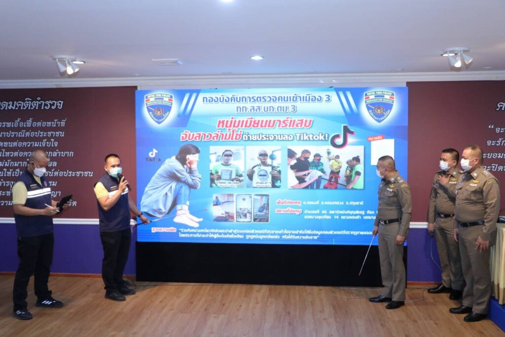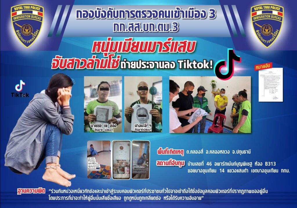 2.“หนุ่มเมียนมาแสบ จับสาวล่ามโซ่ถ่ายประจานลง Tiktok!”- กก.สส.บก.ตม.3 ในกรณีดังกล่าวนี้ เมื่อประมาณปลายเดือน ก.ค.64 ได้เกิดเหตุ นางสาวมิน (นามสมมติ) สัญชาติเมียนมา ซึ่งเป็นผู้เสียหาย ได้ถูกนาย ZAW (ขอสงวนสกุล) หน่วงเหนี่ยวกักขังในห้องพักแห่งหนึ่ง ซอยคลองสี่ ตะวันออก4 ต.คลองสี’ อ.คลองหลวง จ.ปทุมธานี โดยใช้โซ่ล่ามพันธนาการที่ข้อเท้าทั้งสองข้างและใช้เชือกผูกมือ เนื่องจากเข้าใจว่าผู้เสียหายได้ลักทรัพย์ของนาย ZAW ไปโดยได้มีการถ่ายวีดีโอเอาไว้และโพสต์ลงในแอปพลิเคชัน Tiktok ซึ่งในขณะนั้นมีพลเมืองดีคนไทยมาพบเห็นเข้าจึงได้แจ้งเตือน นายZAW จึงได้ปล่อยตัวผู้เสียหายไป