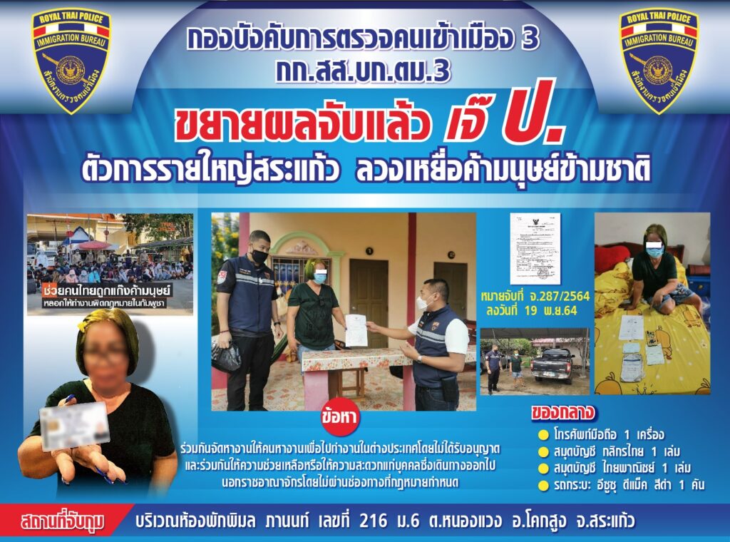 กก.สส.บก.ตม.3 จึงดำเนินการสืบสวนสอบสวนจนมีหลักฐานที่เชื่อมโยงแน่ชัดนำมาซึ่งการออกหมายจับศาล จ.287/2564 ลงวันที่ 19 พ.ย.64 จากนั้นได้ทำการสืบสวนจนทราบว่าเจ๊ ป.ปลา มากบดานอยู่ห้องพักแห่งหนึ่งใน ม.6 ต.หนองแวง อ.โคกสูง จ.สระแก้ว จึงได้นำกำลังเข้าจับกุมพร้อมกับแจ้งข้อกล่าวหาว่า “ร่วมกันจัดหางานให้คนหางานเพื่อไปทำงานในต่างประเทศโดยไม่ได้รับอนุญาต และร่วมกันให้ความช่วยเหลือหรือให้ความสะดวกแก่บุคคลซึ่งเดินทางออกไปนอกราชอาณาจักรโดยไม่ผ่านช่องทางที่กฎหมายกำหนด” และมีการตรวจยึดของกลางที่น่าจะใช้กระทำความผิด ซึ่งได้แก่ โทรศัพท์มือถือ จำนวน 1 เครื่อง สมุดบัญชีธนาคารกรุงไทย จำนวน 1 เล่ม ธนคารกสิกรไทย จำนวน เล่ม และรถกระบะสีดำ ซึ่งใช้ก่อเหตุ นำส่งร้อยเวรสอบสวนเพื่อดำเนินคดี