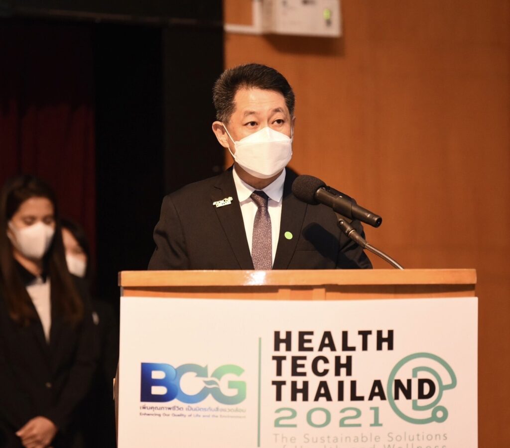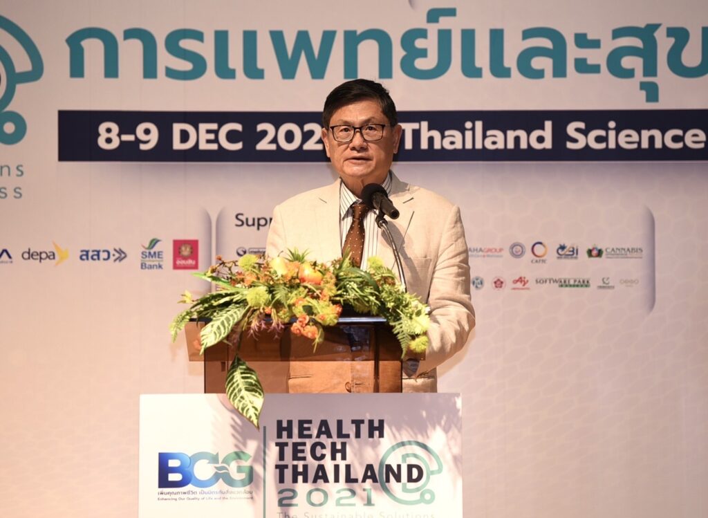 วันที่ 8 ธันวาคม 2564 ณ ศูนย์ประชุมอุทยานวิทยาศาสตร์ประเทศไทย สวทช. อ.คลองหลวง จ.ปทุมธานี : กระทรวงการอุดมศึกษา วิทยาศาสตร์ วิจัยและนวัตกรรม (อว.) โดยอุทยานวิทยาศาสตร์ประเทศไทย สำนักงานพัฒนาวิทยาศาสตร์และเทคโนโลยีแห่งชาติ (สวทช.) ร่วมกับองค์กรพันธมิตร สำนักงานส่งเสริมการจัดประชุมและนิทรรศการ (สสปน.) ศูนย์ความเป็นเลิศด้านชีววิทยาศาสตร์ (TCELS) และพันธมิตรทั้งภาครัฐ และภาคเอกชนกว่า 150 หน่วยงาน จาก 7 เขตเศรษฐกิจ จัดงาน “มหกรรมนวัตกรรมการแพทย์และสุขภาพ (BCG Health Tech Thailand 2021)” ระหว่างวันที่ 8 – 9 ธันวาคม 2564 ในรูปแบบไฮบริด อีเวนต์ (Hybrid Event) ขานรับนโยบายโมเดลเศรษฐกิจใหม่ BCG Economy Model เพื่อยกระดับคุณภาพชีวิตของคนในประเทศอย่างทั่วถึง โดยได้รับเกียรติจาก ศ.(พิเศษ) ดร.เอนก เหล่าธรรมทัศน์ รัฐมนตรีว่าการกระทรวงการอุดมศึกษา วิทยาศาสตร์ วิจัยและนวัตกรรม (อว.) กล่าวเปิดงานพร้อมแสดงวิสัยทัศน์การขับเคลื่อนโมเดลเศรษฐกิจ BCG กลุ่มอุตสาหกรรมการแพทย์และสุขภาพ