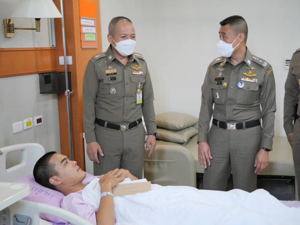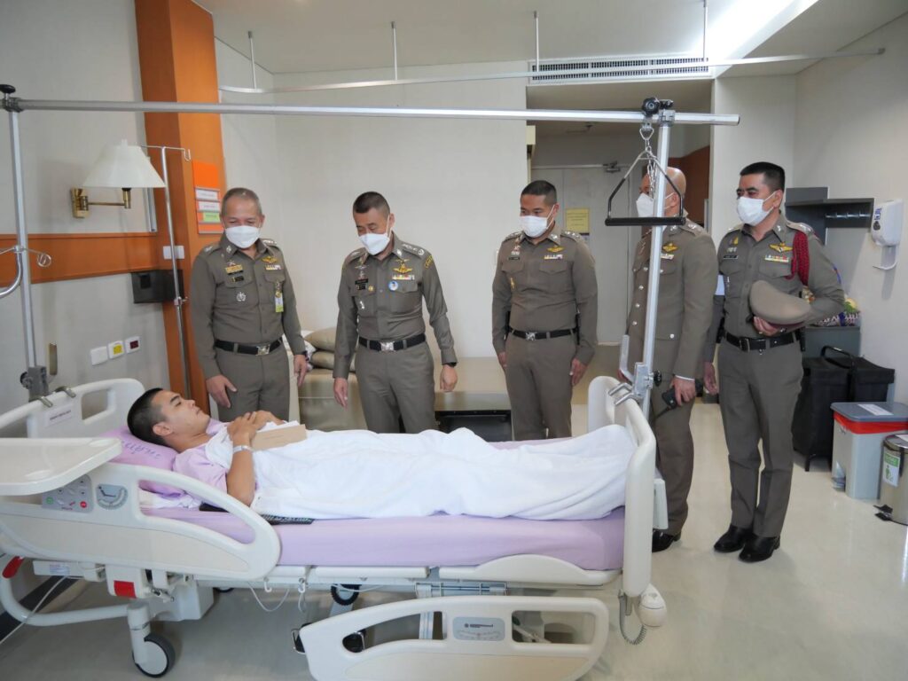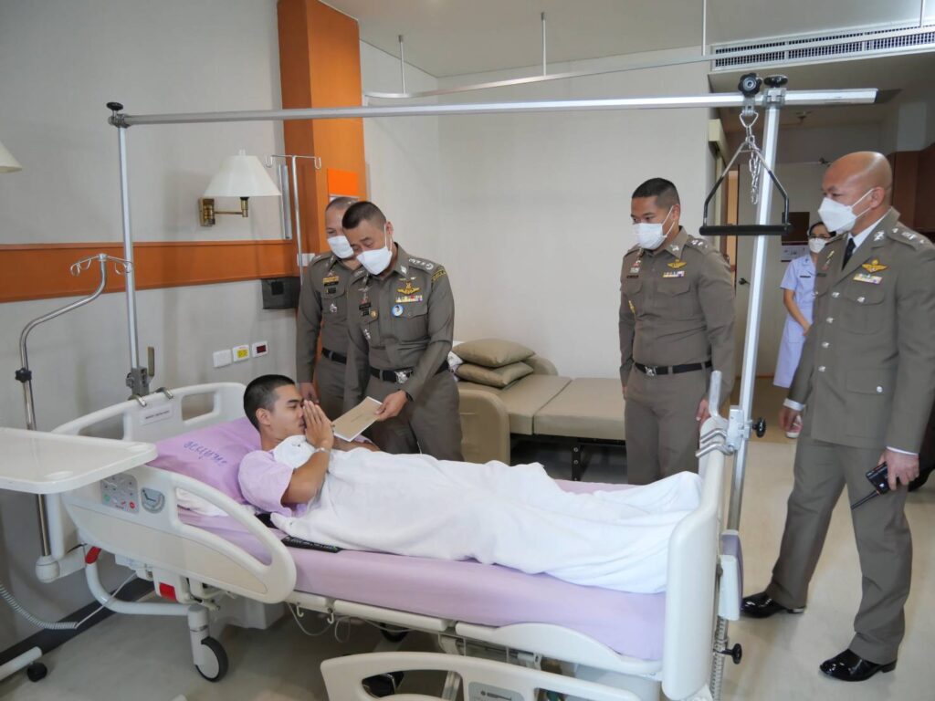 วันที่ 14 ธ.ค.64 เวลา 12.00 น. ณ อาคาร มภร. ห้อง 1109 ชั้น 11 รพ.ตร. : พล.ต.ท.สำราญ นวลมา ผบช.น. พร้อมด้วย พล.ต.ต.สมนึก น้อยคง รอง ผบช.น. และ พ.ต.อ.กฤษดา มานะวงศ์กุล ผกก.สน.ทุ่งมหาเมฆ ได้มาร่วมเยี่ยม และพูดคุยให้กำลังใจกับ ส.ต.ต.ชัยพล จากยางโทน ผบ.หมู่ (ป.) สน.ทุ่งมหาเมฆ เจ้าหน้าที่ตำรวจ (คฝ.) ที่ได้รับบาดเจ็บจากการถูกรุมทำร้ายร่างกายบริเวณแยกมิตรสัมพันธ์ ภายหลังจากเดินทางกลับจากการปฏิบัติหน้าที่ดูแลรักษาความเรียบร้อยการชุมนุมฯ