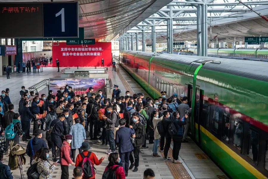 (แฟ้มภาพซินหัว : ผู้โดยสารต่อแถวขึ้นรถไฟบนเส้นทางรถไฟจีน-ลาว ที่สถานีรถไฟคุนหมิง นครคุนหมิง เมืองเอกของมณฑลยูนนานทางตะวันตกเฉียงใต้ของจีน วันที่ 3 ธ.ค. 2021)