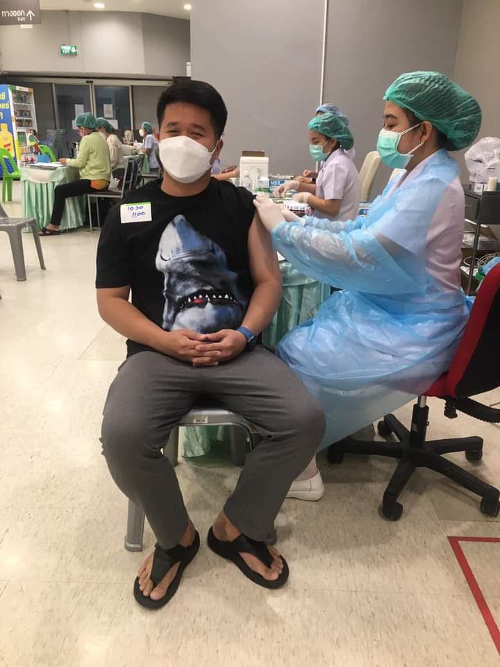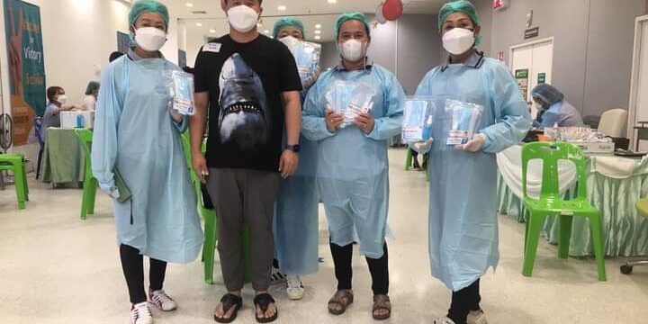 เลยถือโอกาสแจกหน้ากากอนามัย สเปรย์แอลกอฮอล์ และเป็นกำลังใจให้กับบุคลากรทางการแพทย์ เจ้าหน้าที่ อสม. และประชาชนที่มารอรับวัคซีน
