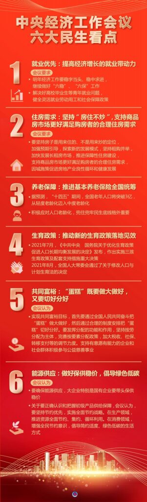 ข้อมูลเกี่ยวกับ ๖ ประเด็นสำคัญต่อการดำรงชีวิตของประชาชนในการประชุมส่วนกลางด้านเศรษฐกิจของจีน ( 中央经济工作会议六大民生看点) ณ กรุงปักกิ่ง ในระหว่างวันที่ ๘ – ๑๐ ธ.ค.๖๔ กล่าวคือ