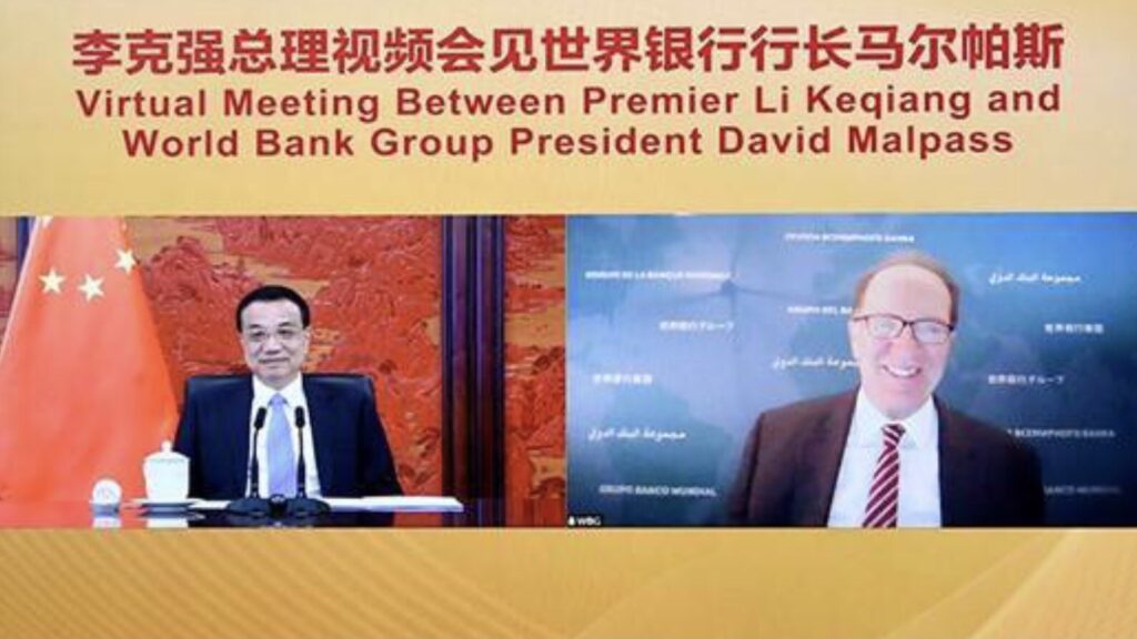 นายกรัฐมนตรีหลี่ เค่อเฉียง (国务院总理李克强) ได้พบกับนายเดวิด มัลพาสส์ (David Malpass) ประธานธนาคารโลก (世界银行行长) ผ่านทางวิดีโอ (视频会见) จากตำหนักจื่อกวง ทำเนียบจงหนานไห่ (中南海紫光阁) ในกรุงปักกิ่ง เมื่อช่วงเช้าวันที่ ๑๓ ธ.ค.๖๔ ซึ่งมีประเด็นที่น่าสนใจดังนี้