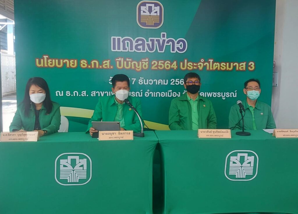 วันที่ 17 ธันวาคคม 2564 เวลา 10.00 น. ธนาคารเพื่อการเกษตรและสหกรณ์การเกษตร (ธ.ก.ส.) จังหวัดเพชรบูรณ์ แถลงข่าวผลการดำเนินงาน โดยนายอนุชา ฉิมภารส ผู้อำนวยการสำนักงาน ธกส. จังหวัดเพชรบูรณ์ พร้อมด้วย ผู้ช่วยผู้อำนวยการ ธ.ก.ส.จังหวัดเพชรบูรณ์ นางสาวจิดาภา บุญวิสุทธานนท์ นายทัศนนท์ ชินกุลกิจนิวัฒน์ และนายวสันต์ ขุนทิพย์สมบัติ โดยมีสื่อมวลชน เข้าร่วมทำข่าว ณ ลานอเนกประสงค์ ธ.ก.ส. สาขาเพชรบูรณ์ นายอนุชา ฉิมภารส ผู้จัดการธนาคารเพื่อการเกษตรและสหกรณ์การเกษตร (ธ.ก.ส.) จังหวัดเพชรบูรณ์ เปิดเผยถึงผลการดำเนินงานว่าตามมติ ครม.อนุมัติโครงการประกันรายได้ของเกษตรกรผู้ปลูกข้าวปี 2564/2565 และมาตรการคู่ขนาน ๆได้แก่ โครงการสินเชื่อชลอการขายข้าวเปลือนาปี โครงการการสินเชื่อเพื่อรวบรวมข้าวและสร้างมูลค่าเพิ่มโดยสถาบันเกษตรกรเพื่อบรรเทาความเดือดร้อนของเกษตรกรผู้ปลูกข้าวนาปีภายในประเทศในส่วนของ จ.เพชรบูรณ์ดำเนินการโอนเงินช่วยเหลือเกษตรกรแล้ว 80,384 ราย เป็นเงิน 1,545,480, 057 บาท โอนไม่สำเร็จ 9 ราย เป็นเงิน 397,798 บาท ส่วนโครงการสนับสนุนค่าบริหารจัดการและพัฒนาคุณภาพผลผลิตเกษตรกรผู้ปลูกข้าว ปีการผลิต 2564/2565 ในอัตราไร่ละ 1,000 บาท สูงสุดไม่เกิน 20 ไร่ โดยดำเนินการโอนเงินเข้าบัญชีเกษตรกร 80,935 ราย เป็นเงิน 975,374, 165 บาท โครงการประกันรายได้เกษตรกรผู้ปลูกข้าวโพดเลี้ยงสัตว์ ปี 2564/2565 วงเงิน1,863 ล้านบาททั่วประเทศ ราคาตลาดกลางอ้างอิง 8.50 บาท ไม่เกินครัวเรือนละ 30 ไร่และไม่ซ้ำแปลง เริ่มจ่าย 20 พย.64-20 ตค.65 โครงการประกันรายได้เกษตรกรผู้ปลูกมันสำปะหลัง ปี2564/65 ผลการดำเนินงานที่ผ่านมาจ่ายเงินชดเชยส่วนต่างให้เกษตรกร 436,817 ครัวเรือน รวม 3,057 ล้านบาท โครงการประกันรายได้เกษตรกรชาวสวนยาง บรรเทาความเดือดร้อนจากปัญหาราคายางตกต่ำจากภาวะเศรษฐกิจถดถอยจากวิกฤติการแพร่ระบาดของเชื้อไวรัสโควิด19 โดยดำเนินการโอนเงินให้เกษตรกรไปแล้ว 42 ราย เป็นเงิน 128,180 บาท นอกจากนี้ ธกส.ได้มีมาตรการช่วยเหลือลูกค้าที่ได้รับผลกระทบจากภาวะเศรษฐกิจและภัยโรคระบาดเพื่อช่วยเหลือและบรรเทาทางการเงินรวมทั้งจูงใจให้ลูกค้าที่มีศักยภาพและความสามารถในการชำระหนี้ได้มีโอกาสได้รับเงินสดกลับคืนเพื่อเสริมสภาพคล่องในการประกอบอาชีพและเป็นค่าใช้จ่ายในครัวเรือน
