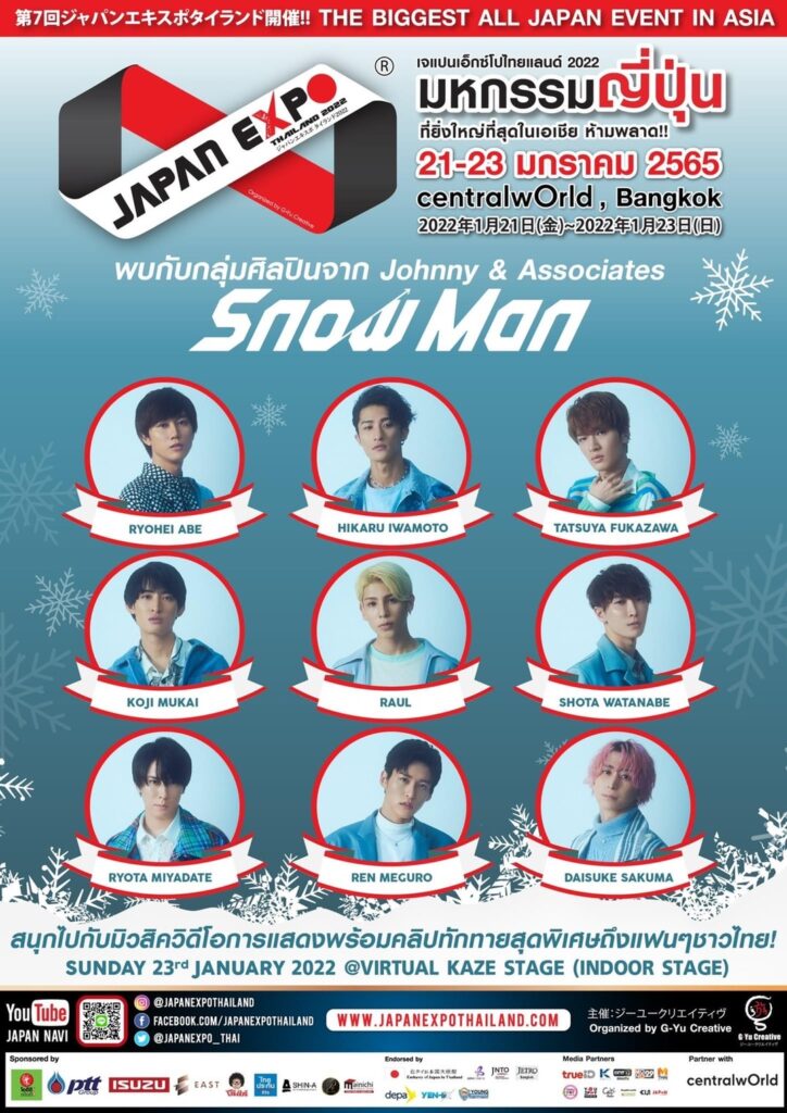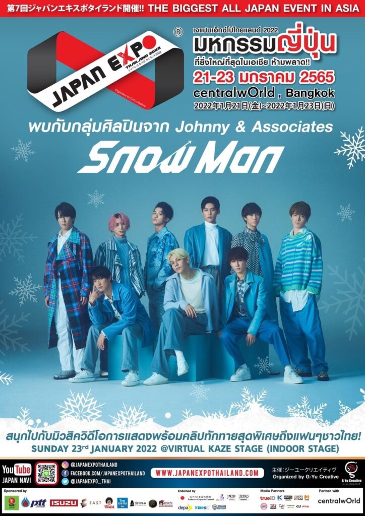 นำทีมโดยวง "Snow Man" ที่มีสมาชิกวง ได้แก่ HIKARU IWAMOTO, TATSUYA FUKAZAWA, RAUL, SHOTA WATANABE, KOJI MUKAI, RYOHEI ABE, REN MEGURO, RYOTA MIYADATE และ DAISUKE SAKUMA กับการกลับมาของพวกเขาทั้ง 9 และมิวสิควีดีโอการแสดง พร้อมคำทักทายของศิลปินพิเศษสำหรับแฟนๆ ชาวไทย ภายในงาน JAPAN EXPO THAILAND 2022 ในวันอาทิตย์ที่ 23 มกราคม @ เวที KAZE VIRTUAL STAGE (Indoor, Central Court) จากความร่วมมือของค่าย Johnny & Associated และบริษัท G-Yu Creative