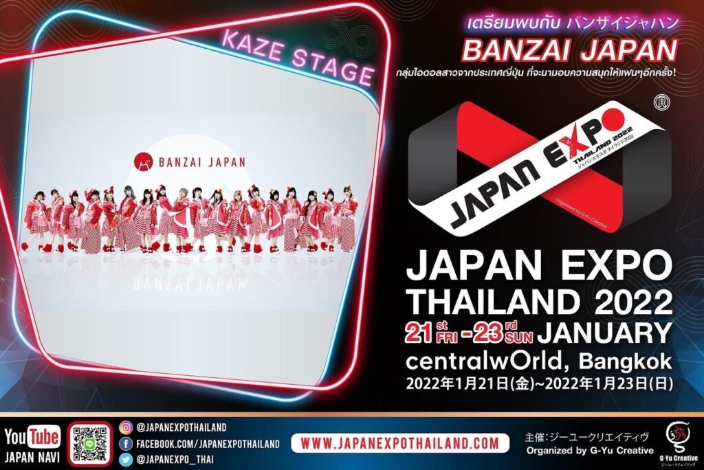 JAPAN EXPO THAILAND 2022 ครั้งที่ 7 ยังคงเอกลักษณ์ความเป็นญี่ปุ่นอย่างเต็มรูปแบบตลอด 3 วันเต็ม! งานจัดขึ้นระหว่างวันศุกร์ที่ 21 - อาทิตย์ที่ 23 มกราคม 2565 ตั้งแต่เวลา 10.00 – 21.00 น. ณ ศูนย์การค้าเซ็นทรัลเวิลด์ ติดตามข่าวคราวความเคลื่อนไหวของงาน JAPAN EXPO THAILAND 2022 ได้ที่ www.japanexpothailand.com, www.gyucreative.com,