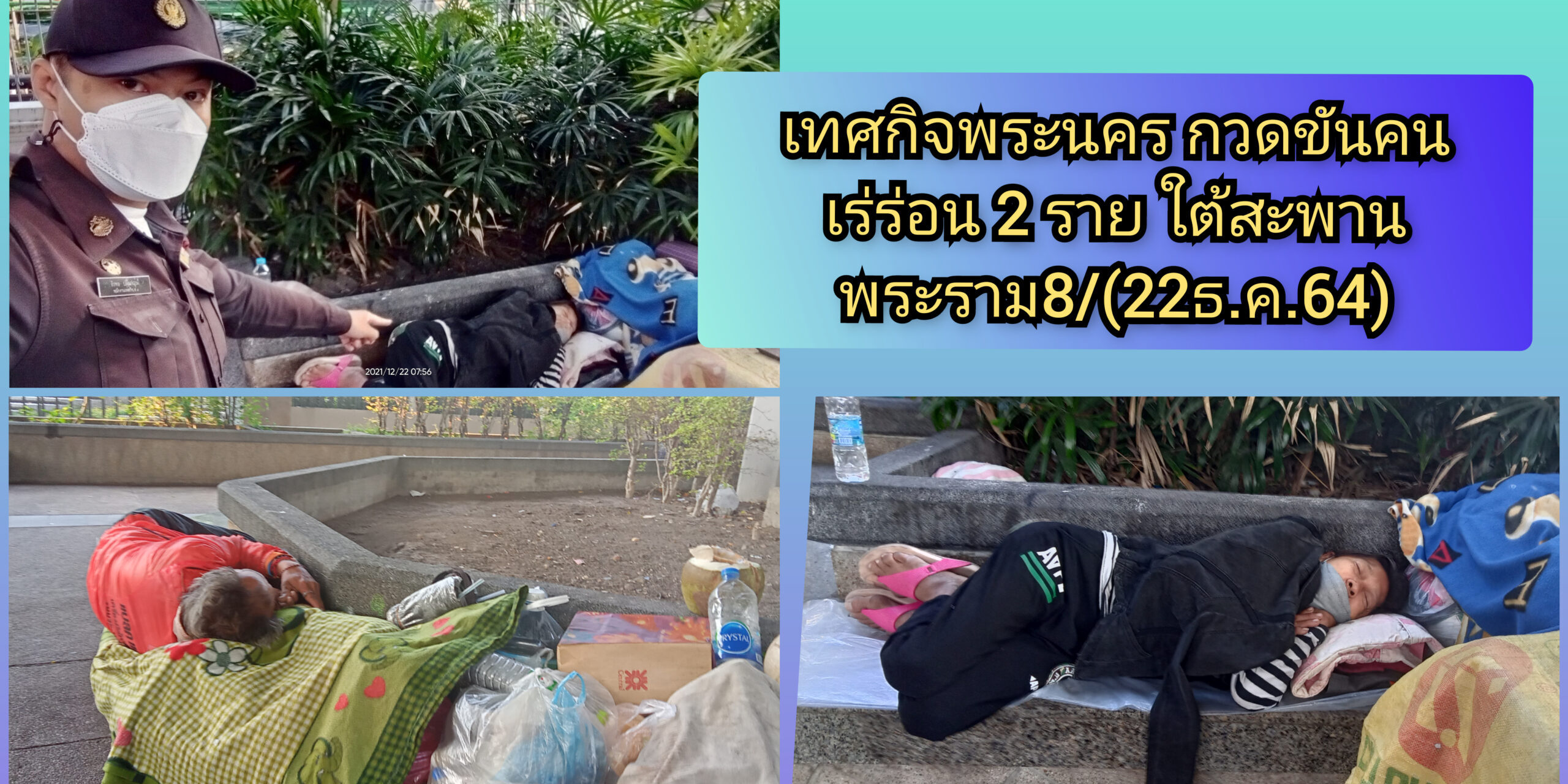 วันนี้ (22ธ.ค.64) เวลา 07:57 น. นายวสันต์ บุญหมื่นไวย์ ผอ.เขตพระนคร มอบหมายให้ นายคณิต ชุมช่วย หัวหน้าฝ่ายเทศกิจ นายวุฒิศักดิ์ กาวชู หัวหน้างานตรวจและบังคับการ สั่งการให้ นายนายวิสาร์ท โภชนะคง เขตนคร 514 นายธีรวัฒน์ พรหมเมธี เขตนคร 516 จนท.เทศกิจชุด256 โดยมี นายธีรพล ปลื้มถนอม ว.4 กวดขันผู้ค้าและคนเร่ร่อน เบื้องต้นได้ ว.15 ว่ากล่าวตักเตือนคนเร่ร่อน 2 ราย บริเวณใต้สะพานพระราม8 เหตุการณ์ทั่วไปปกติ.