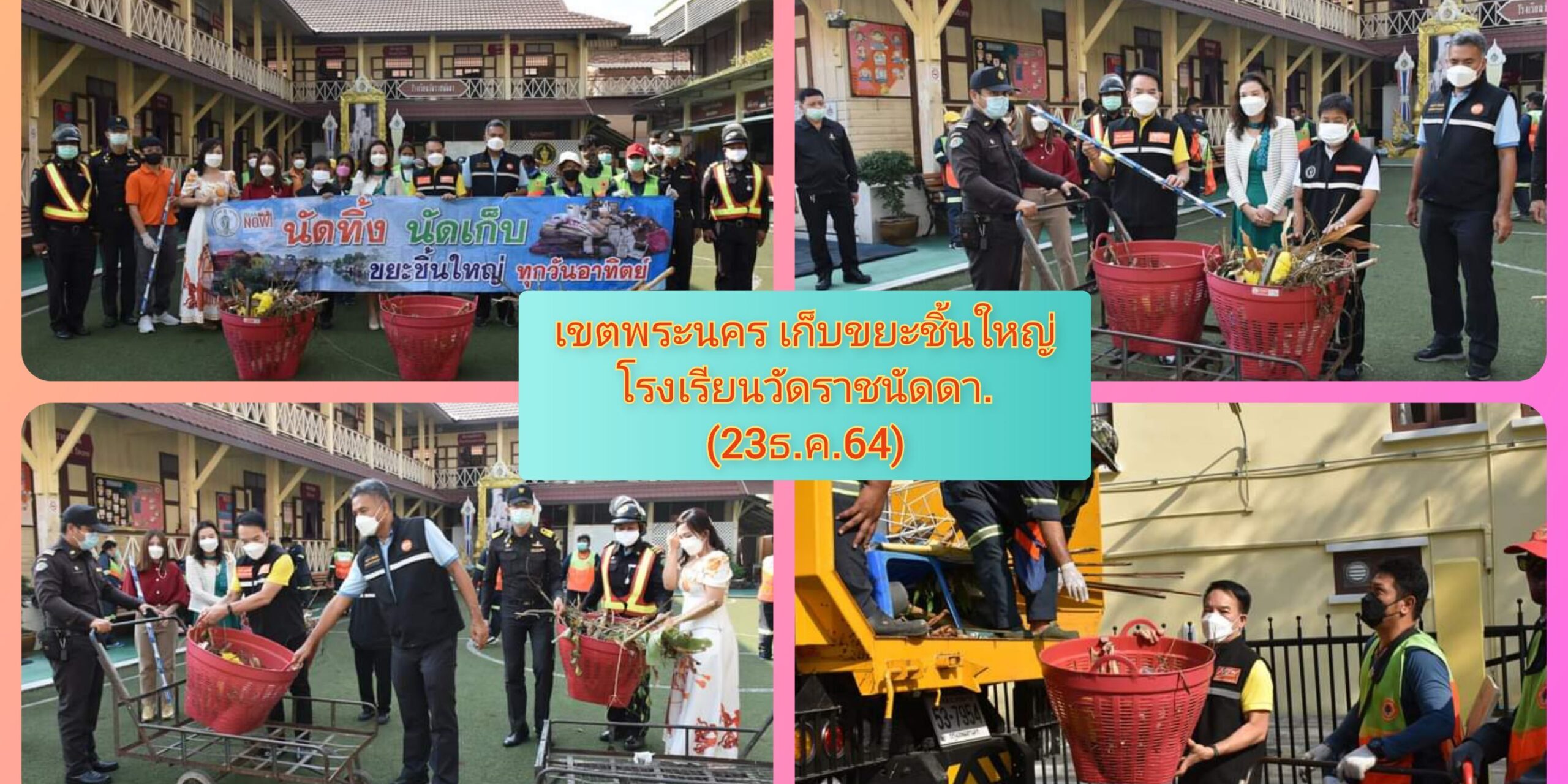 (23 ธ.ค. 64) นายวสันต์ บุญหมื่นไวย์ ผู้อำนวยการเขตพระนคร พร้อมด้วย นายกฤษดา เพ็ชร์สีสัง ผู้ช่วยผู้อำนวยการเขตพระนคร ผู้อำนวยการสถานศึกษาโรงเรียนวัดราชนัดดา คณะครูโรงเรียนวัดราชนัดดา และเจ้าหน้าที่ที่เกี่ยวข้อง ร่วมกันจัดเก็บขยะชิ้นใหญ่ สิ่งของเหลือใช้ และขยะอันตราย บริเวณโรงเรียนวัดราชนัดดา เพื่อช่วยสร้างสุขอนามัย และ เพิ่มพื้นที่ให้โปร่ง โล่ง..
