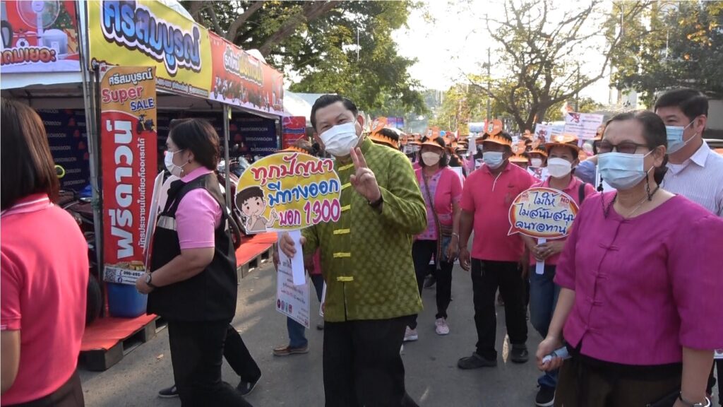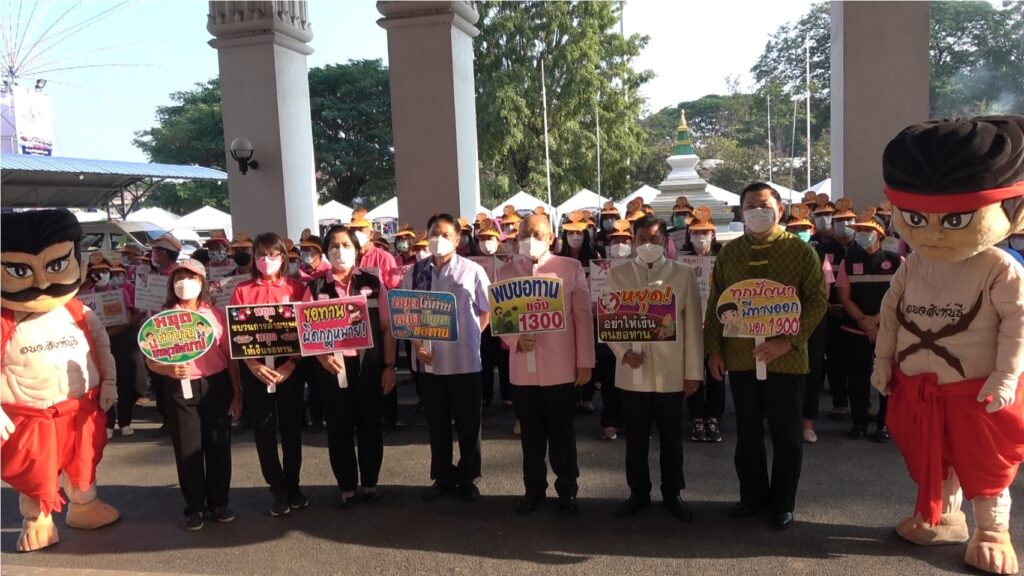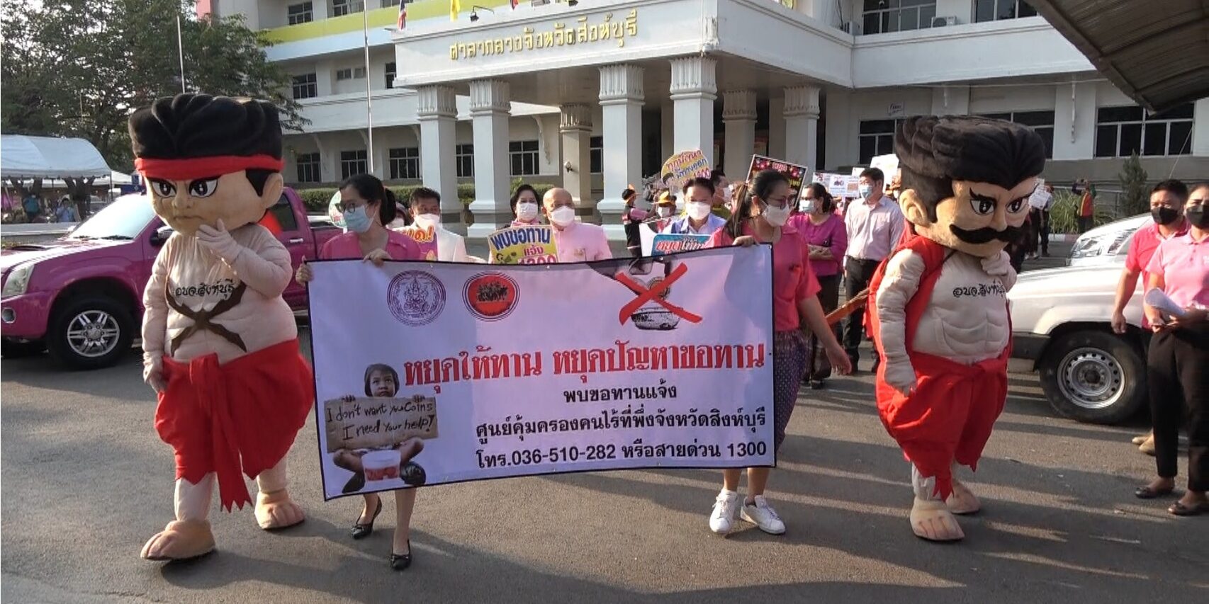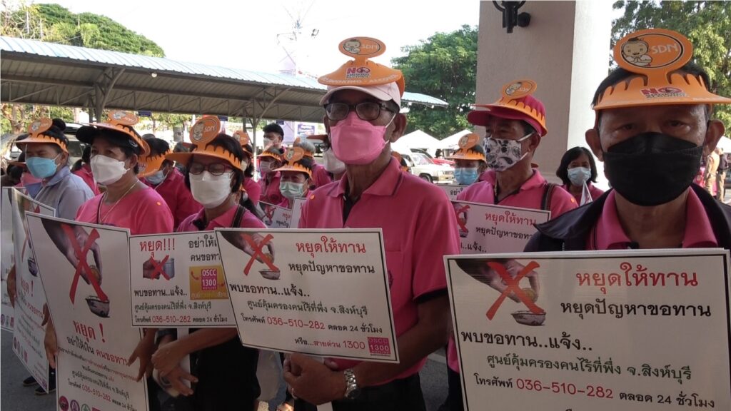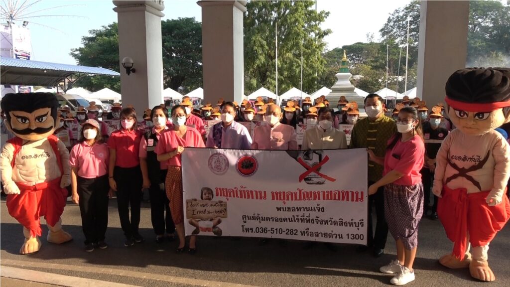 วันที่ 24 ธันวาคม 2564 เวลา 16.00 น.นายชัยชาญ สิทธิวิรัชธรรม ผู้ว่าราชการจังหวัดสิงห์บุรี พร้อม รองผู้ว่าราชการจังหวัดสิงห์บุรี ปลัดจังหวัดสิงห์บุรี หน่วยงานสำนักงานพัฒนาสังคมและความมั่นคงของมนุษย์จังหวัดสิงห์บุรีร่วมกับศูนย์คุ้มครองคนไร้ที่พึ่งจังหวัดสิงห์บุรี อาสาสมัครพัฒนาสังคมและความมั่นคงของมนุษย์จังหวัดสิงห์บุรีและหน่วยงานภาคีเครือข่าย จำนวน 80 คน เดินขบวนรณรงค์ประชาสัมพันธ์หยุดทานหยุดปัญหาขอทาน และการจัดระเบียบ คนขอทาน คนไร้ที่พึ่งในงานเทศกาลกินปลาของดีเมืองสิงห์ ครั้งที่ 27 ภายในบริเวณงานระหว่างวันที่ 24 ธันวาคม 2564 ถึง 2 มกราคม 2564 เป็นประจำทุกวันเพื่อรณรงค์สร้างความรู้ความเข้าใจตามพระราชบัญญัติควบคุมการขอทาน พ.ศ.2559และพระราชบัญญัติการคุ้มครองคนไร้ที่พึ่ง พ.ศ.2557 สร้างความตระหนักให้บุลากรเจ้าหน้าที่ที่เกี่ยวข้องและภาคีเครือข่ายได้มีส่วนร่วมในการแก้ไขปัญหาคนของทานคนไร้ที่พึ่ง สำรวจตรวจตราคนขอทาน คนไร้ที่พึ่งที่อาจจะพบในงานเทศกาลกินปลาของดีเมืองสิงห์ครั้งที่ 27ซึ่งได้รับความร่วมมือจากเจ้าหน้าที่ตำรวจและทีม พม.one home เข้าร่วมในการปฏิบัติการจัดระเบียบงานเทศกาลกินปลาของดีเมืองสิงห์ เป็นงานเทศกาลประจำปีที่มีประชาชนทั่วไปให้ความสนใจเข้ามาเที่ยวชมงานเป็นจำนวนมากจึงอาจจะมีบุคคลเร่ร่อนพลัดหลง