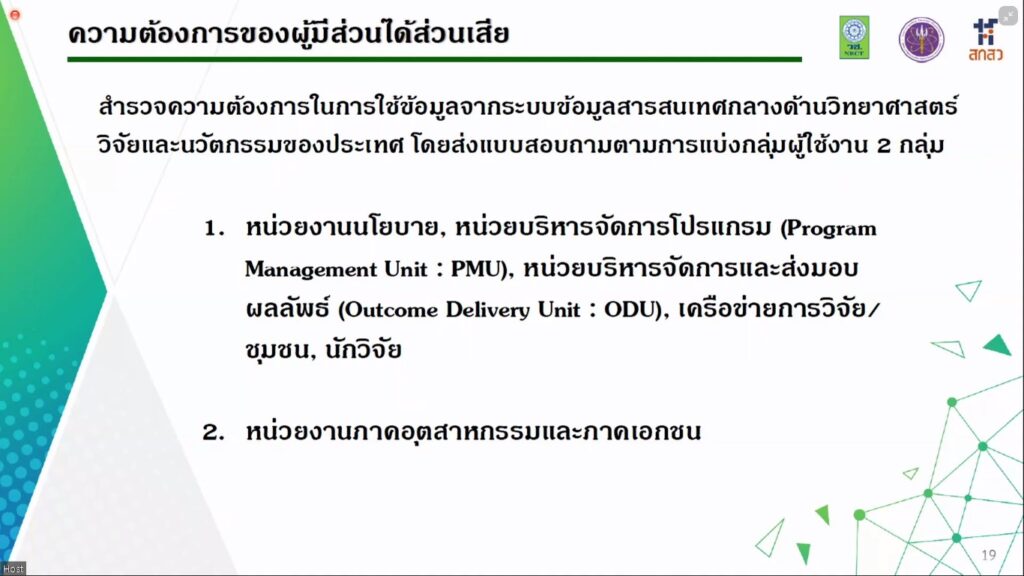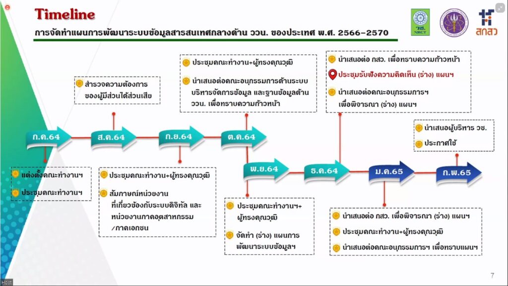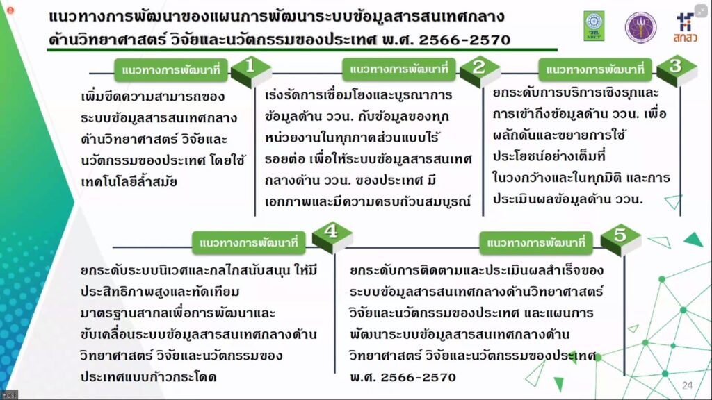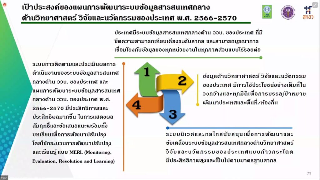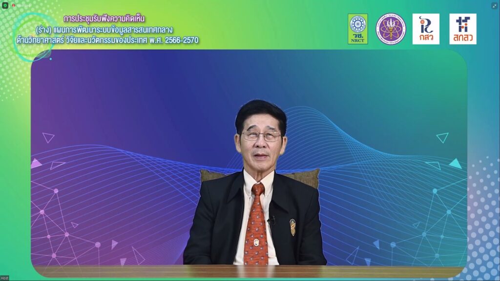วันที่ 23 ธันวาคม 2564 สำนักงานการวิจัยแห่งชาติ (วช.) ภายใต้กระทรวงการอุดมศึกษา วิทยาศาสตร์ วิจัยและนวัตกรรม (อว.) จัดประชุมรับฟังความคิดเห็น (ร่าง) แผนการพัฒนาระบบข้อมูลสารสนเทศกลางด้านวิทยาศาสตร์ วิจัยและนวัตกรรมของประเทศ พ.ศ. 2566-2570 ผ่านระบบ ZOOM โดยมี ศาสตราจารย์กิตติคุณ นายแพทย์สุทธิพร จิตต์มิตรภาพ ประธานคณะกรรมการส่งเสริมวิทยาศาสตร์ วิจัยและนวัตกรรม (กสว.) เป็นประธานการประชุม