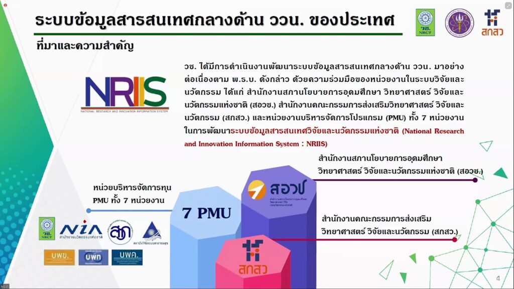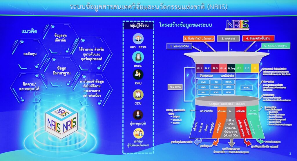 สำหรับระบบข้อมูลสารสนเทศวิจัยและนวัตกรรมแห่งชาติ (National Research and Innovation Information System : NRIIS) เกิดจากความร่วมมือ 3 ฝ่าย ได้แก่ สำนักงานคณะกรรมการส่งเสริมวิทยาศาสตร์ วิจัยและนวัตกรรม (สกสว.) สำนักงานสภานโยบายการอุดมศึกษา วิทยาศาสตร์วิจัยและนวัตกรรมแห่งชาติ (สอวช.) และสำนักงานการวิจัยแห่งชาติ (วช.) ซึ่งระบบ NRIIS มีระบบงานหลัก ประกอบด้วย ระบบสำหรับหน่วยงานกำหนดนโยบาย ระบบบริหารจัดการงบประมาณและแผนงาน ระบบบริหารจัดการโครงการสำหรับหน่วยบริหารจัดการ (ProgramManagement Unit : PMU) ระบบบริหารจัดการโครงการสำหรับหน่วยงานหรือมหาวิทยาลัย ซึ่งเป็นหน่วยงานบริหารจัดการและส่งมอบผลลัพธ์ (Outcome Delivery Unit : ODU) โดยระบบ NRIIS จะสนับสนุนระบบบริหารจัดการโครงการสำหรับนักวิจัย ระบบประเมินสำหรับผู้ทรงคุณวุฒิ ระบบข้อมูลบุคลากรวิจัยและนวัตกรรมระบบเชื่อมโยงข้อมูล ระบบบริการข้อมูล และระบบสนับสนุนการดำเนินงาน ตลอดจนบริหารจัดการและบำรุงรักษาระบบเพื่อสามารถให้บริการตามความต้องการใช้งานของผู้ใช้ระบบแต่ละกลุ่มเป้าหมายได้อย่างต่อเนื่องและมีประสิทธิภาพ